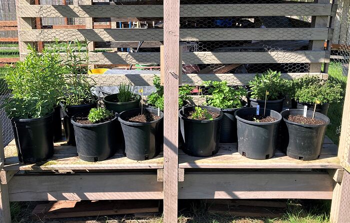 Hereâs a picture of our herb garden. We built it on the side of a shed just outside our back door, which is near the kitchen. There are a couple of gates on it to keep the deer out: tarragon, oregano, chives, parsley, sage and thyme.