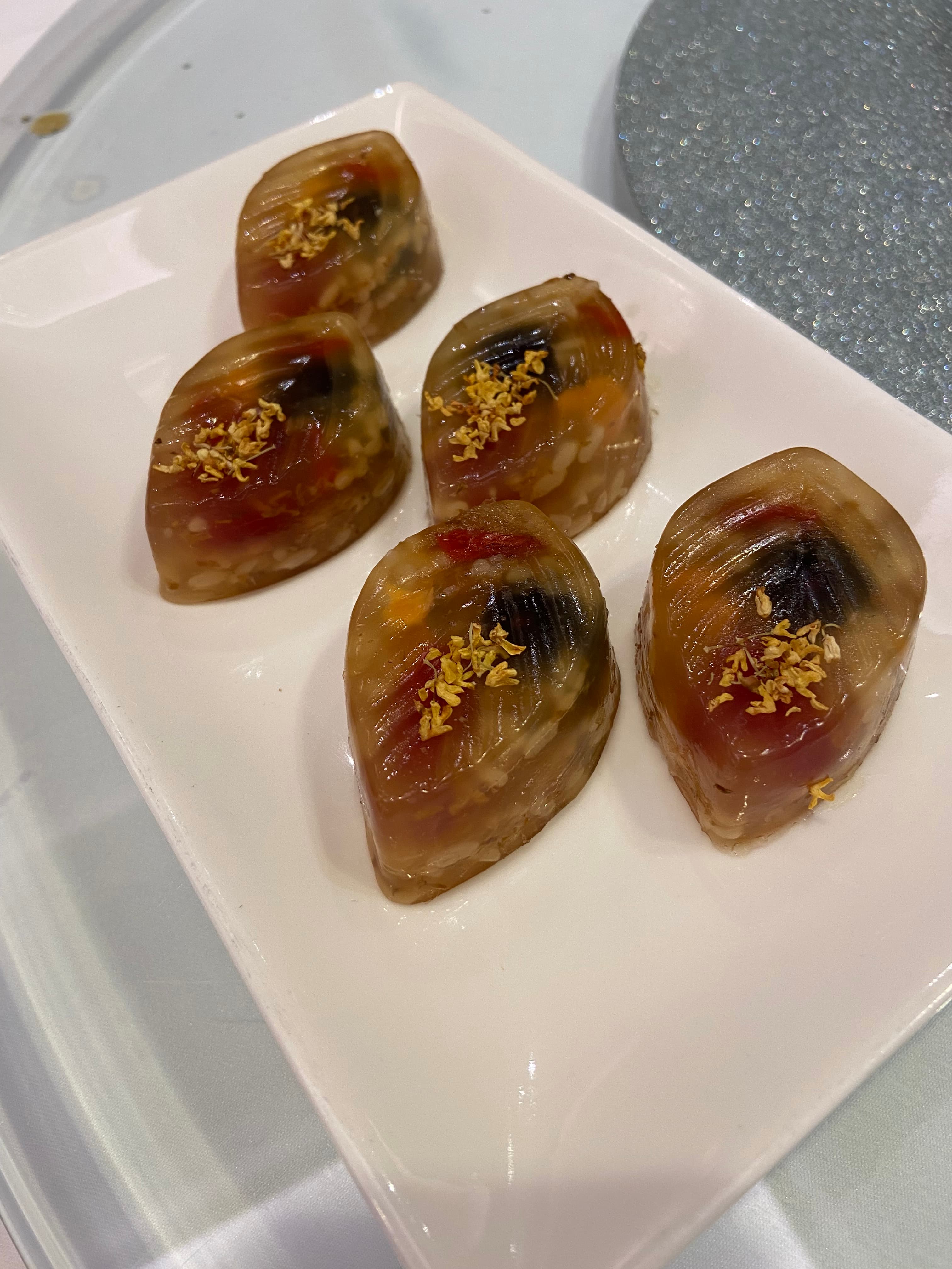 - Dessert of Lychee, red dates, water chestnut and Osmenthus jello.