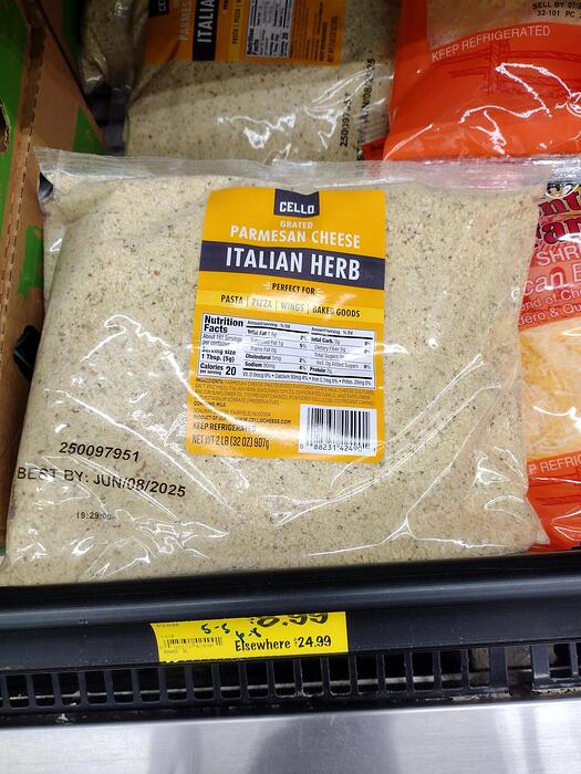 Grated Parmesan Cheese mix with Italian Seasoning, 8.99 for 2lbs. I think it’s a great price for parmesan but in this form I am planning on parmesan encrusted chicken breast in our future. Maybe some cheese crackers from scratch. It’s such a PIA to grate enough cheese to do breading with it but here my job is done for me! And I finally managed to get a picture from in the store!