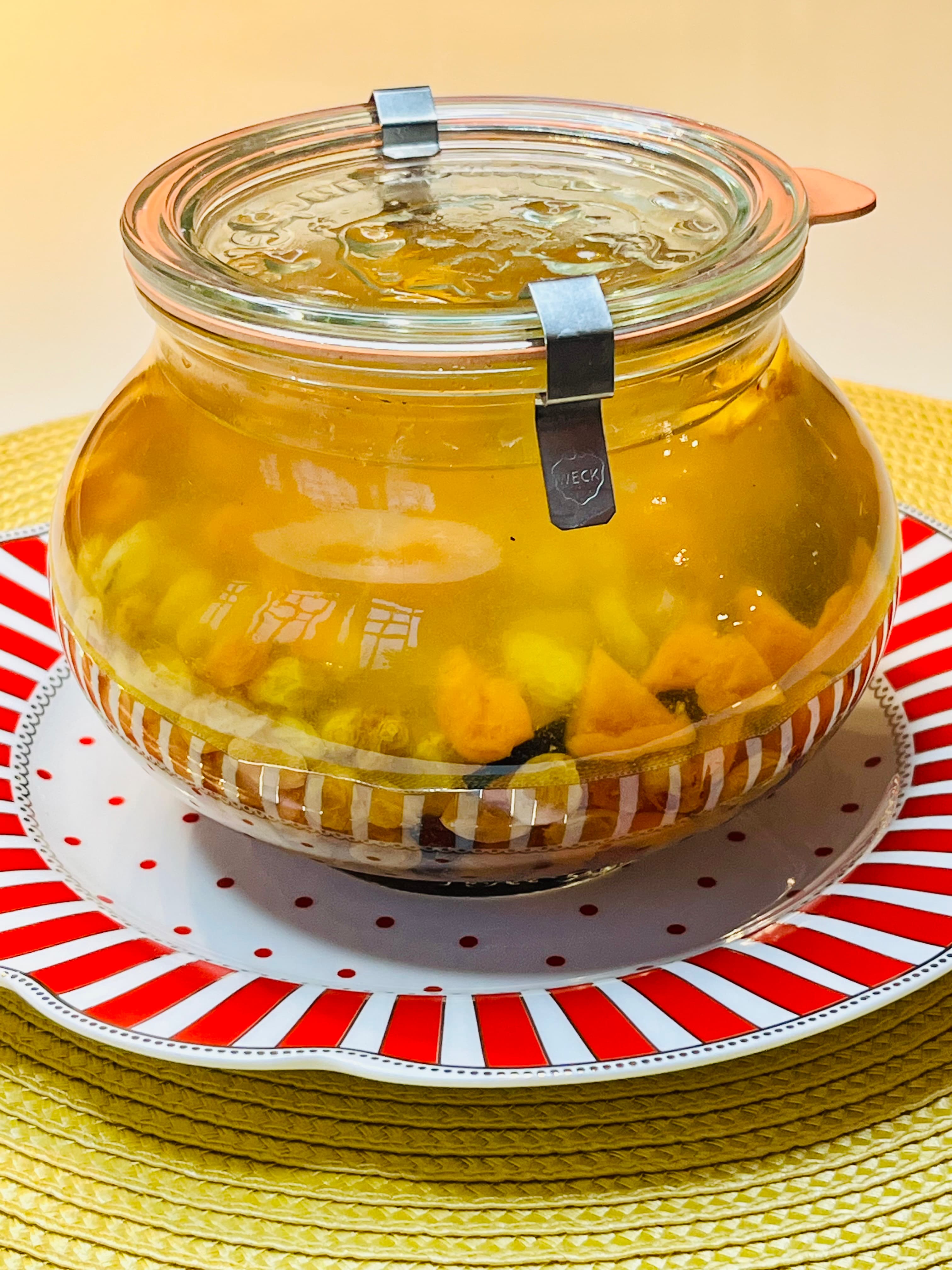 Yellow raisins and apricots soaking in rum sugar syrup. There is a soft Ceylon cinnamon quill and a vanilla bean in there as well. I will be adding additional raisins/apricots tomorrow depending on the absorption rate. I used a French rum with some orange undertones. This is from the Dutch Table, the raisins are generally served to the gentlemen and the apricots to the ladies. Recommended soak time is 4 weeks.