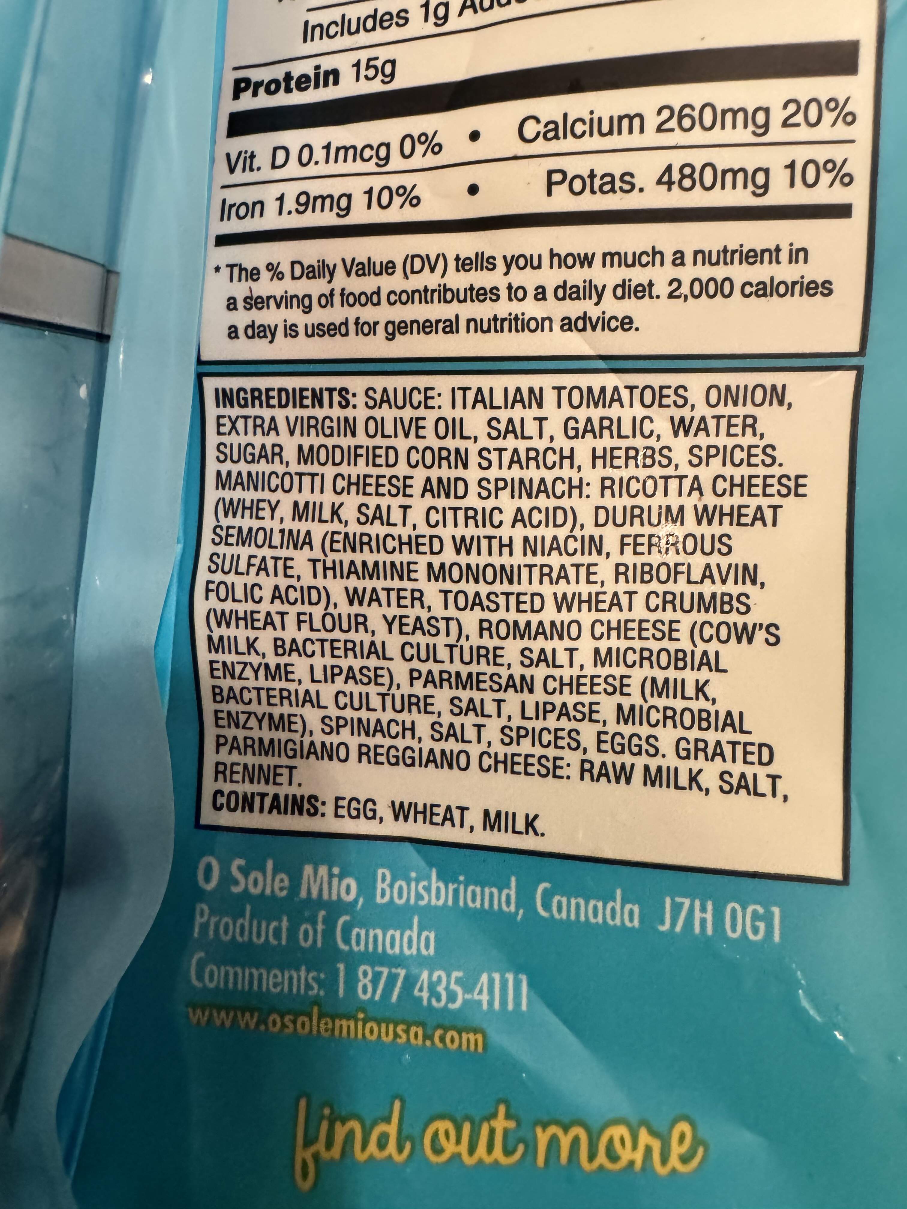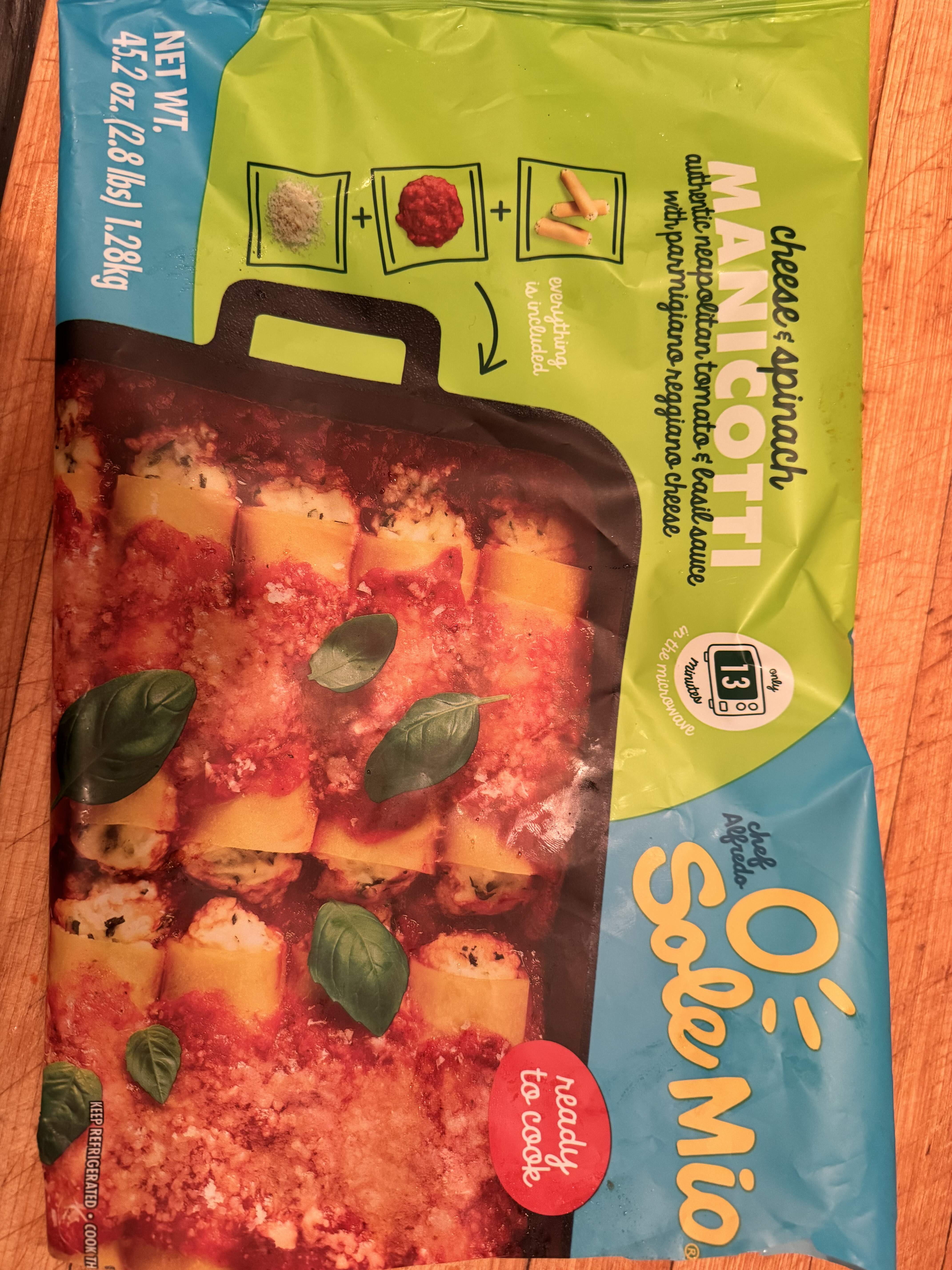 Yay - O’Sole Mio Manicotti, cheese and spinach. Sauce is flavorful and the pasta doesn’t turn to mush. Quick and easy meal for two with leftovers. Add a salad and some garlic bread and three can eat plenty. $10ish.