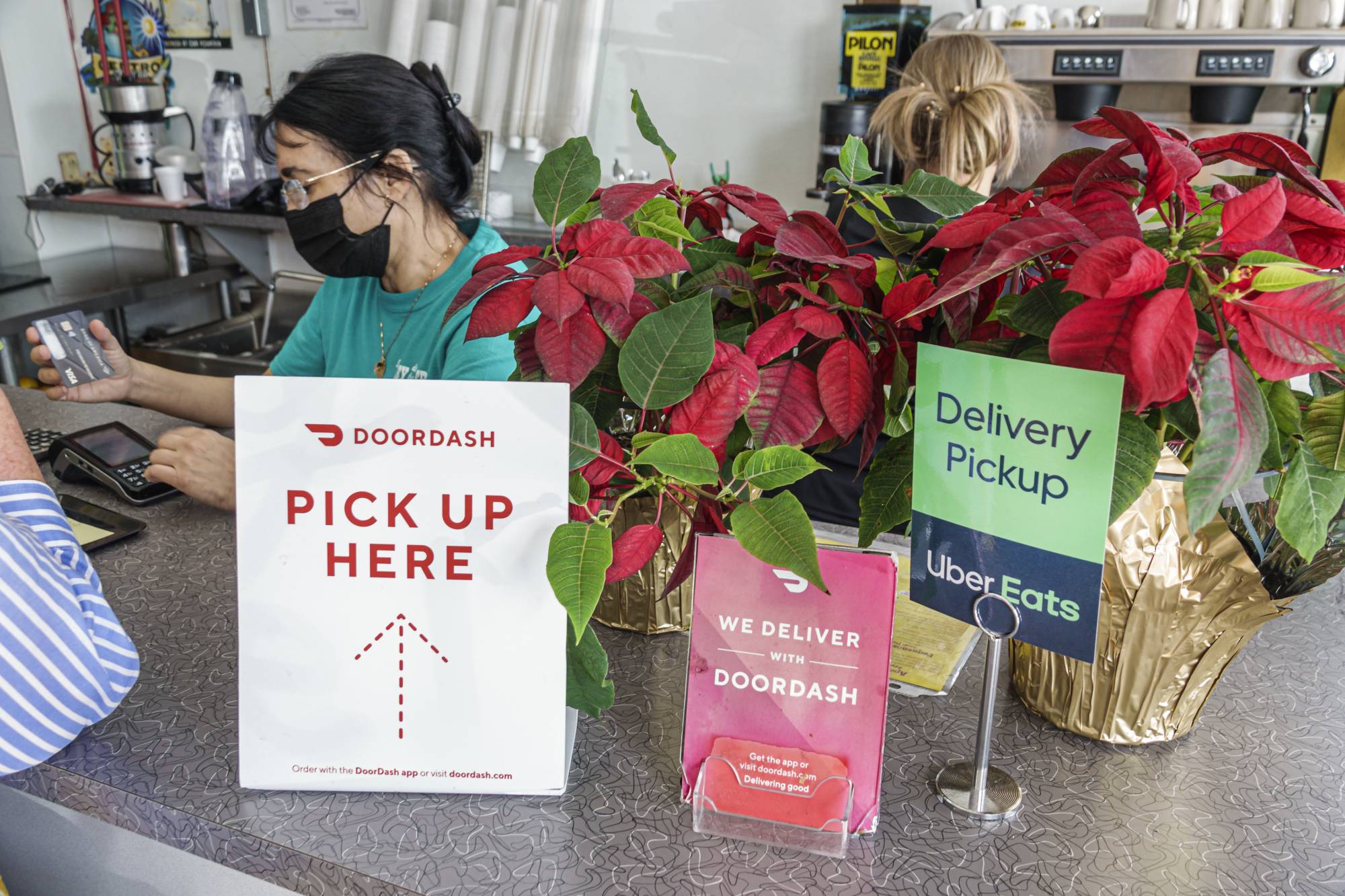 Florida, Miami, restaurant cashier with signs for food delivery services DoorDash and Uber Eats. (Jeffrey Greenberg/Universal Images Group via Getty Images)