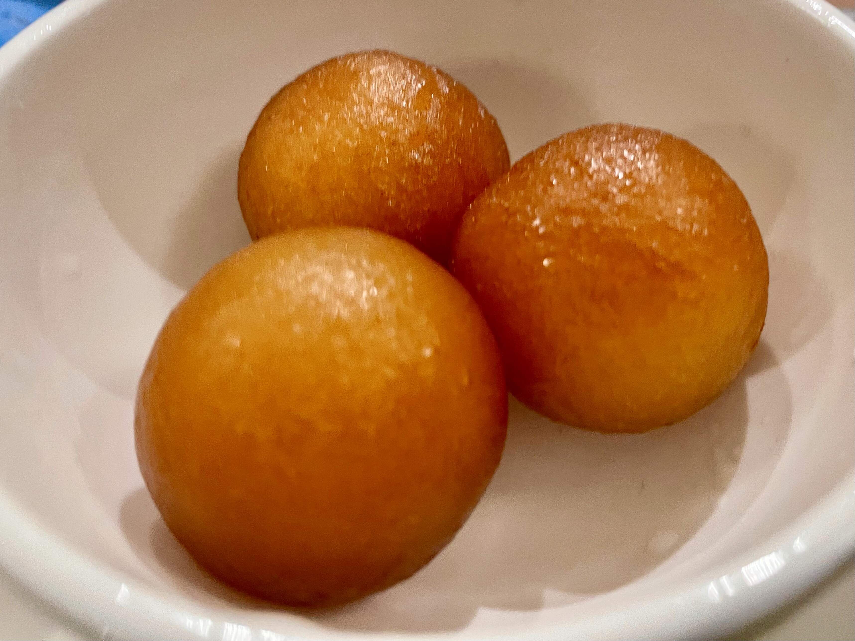 Nigella’s Baci di ricotta, a simple mix of ricotta , egg , flour, etc. This is is a half batch, it’s best eaten at the moment!These were flavored with an orange scented rum and fried in avocado oil.