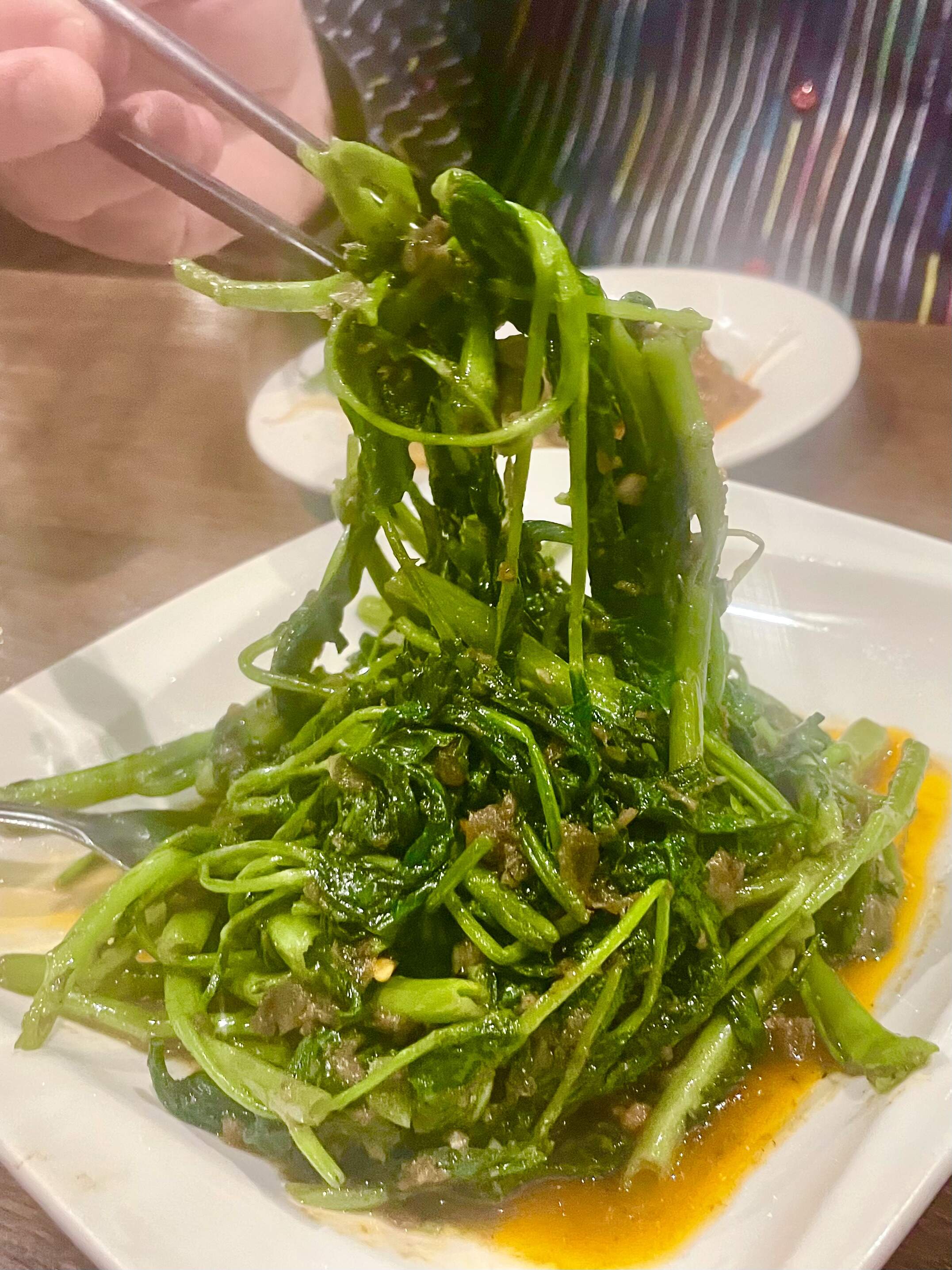 These don’t look much like pea leaves to me either - but there can be different qualities/ages in the market and imagine restaurants will sub other greens from time to time - I have been certainly served chewy “pea greens” in the past, which should not be!!