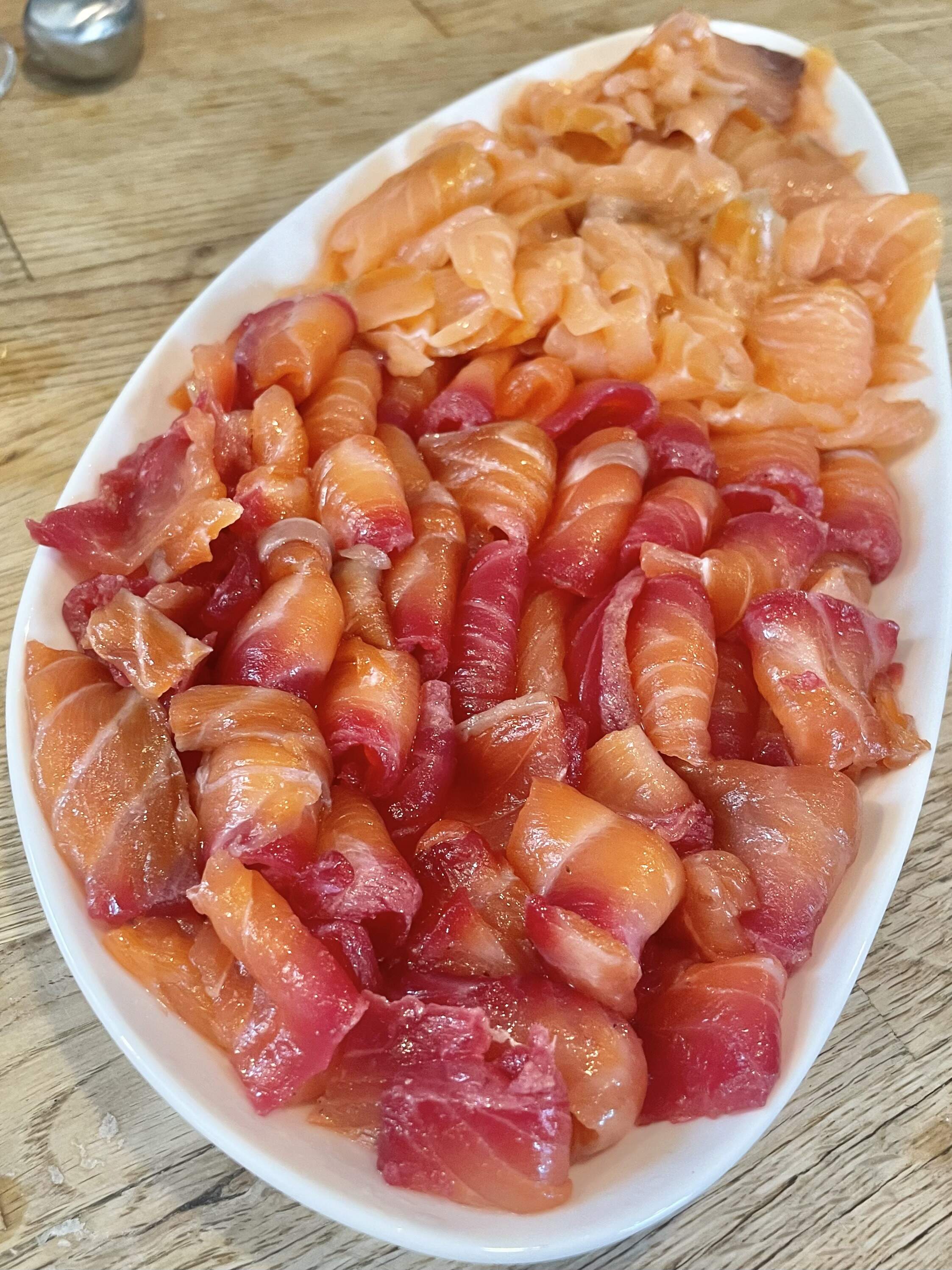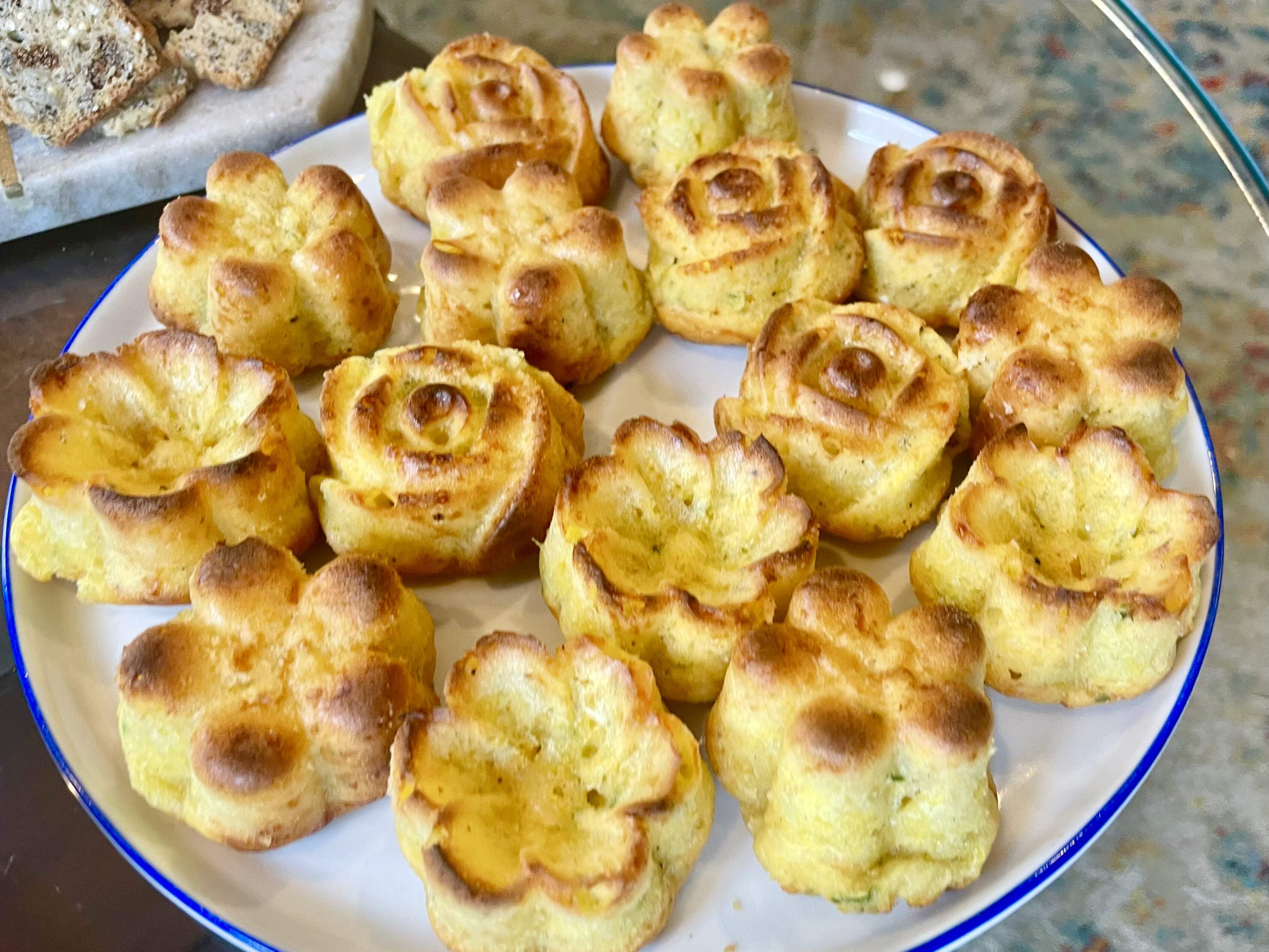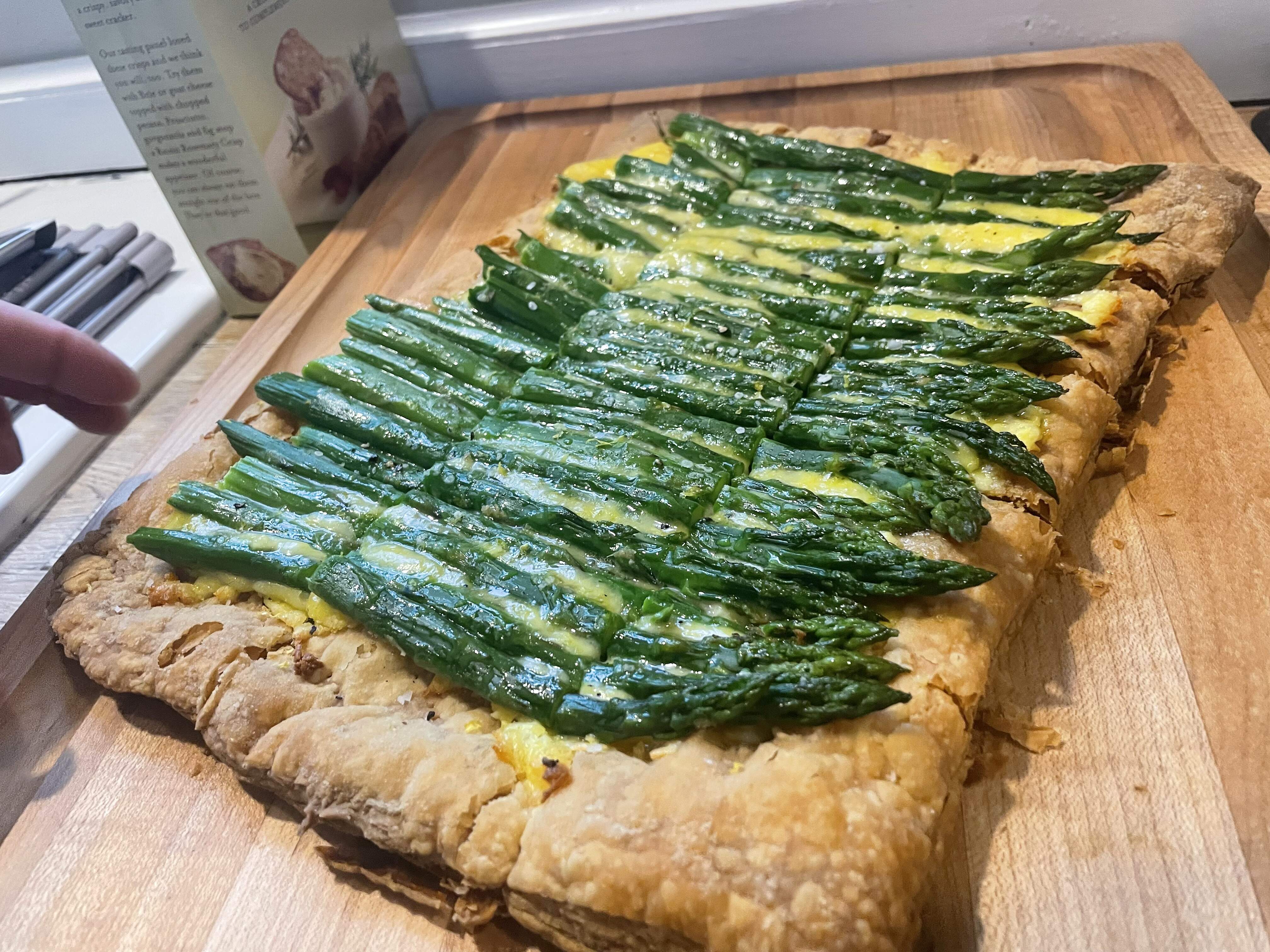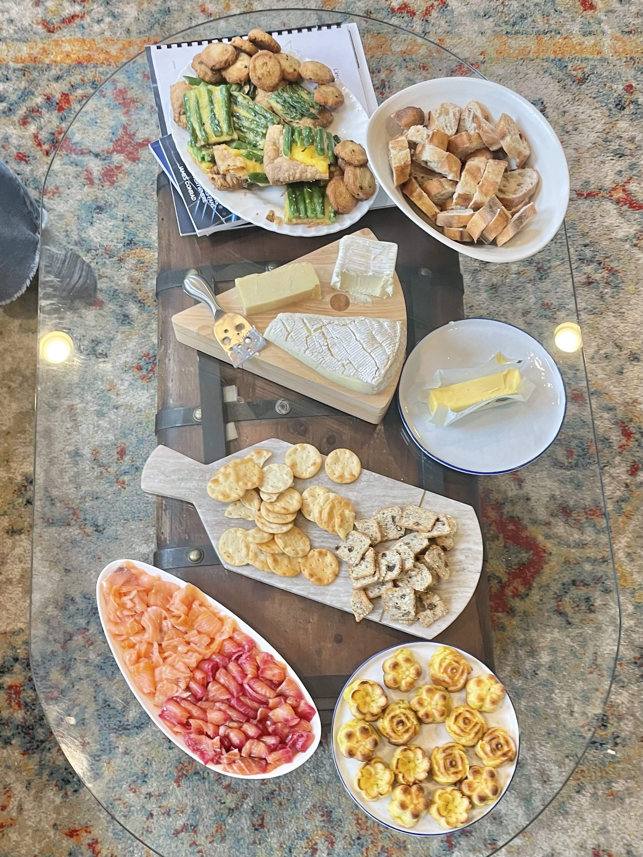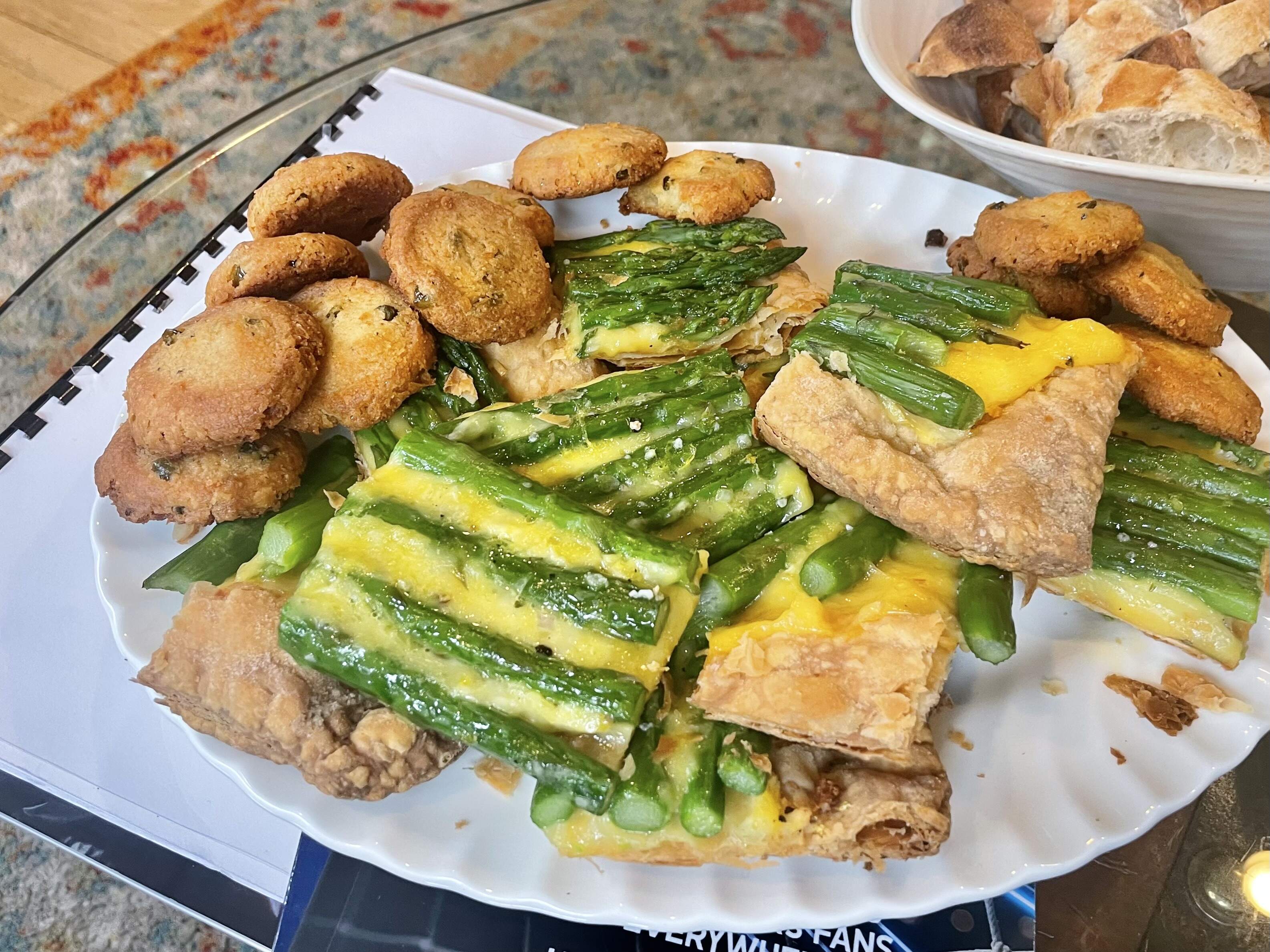 Beet-tinged gravlax, cheesy jalapeño corn bites, asparagus puff pastry tart, cheese, baguette, and jalapeno biscuit bites.