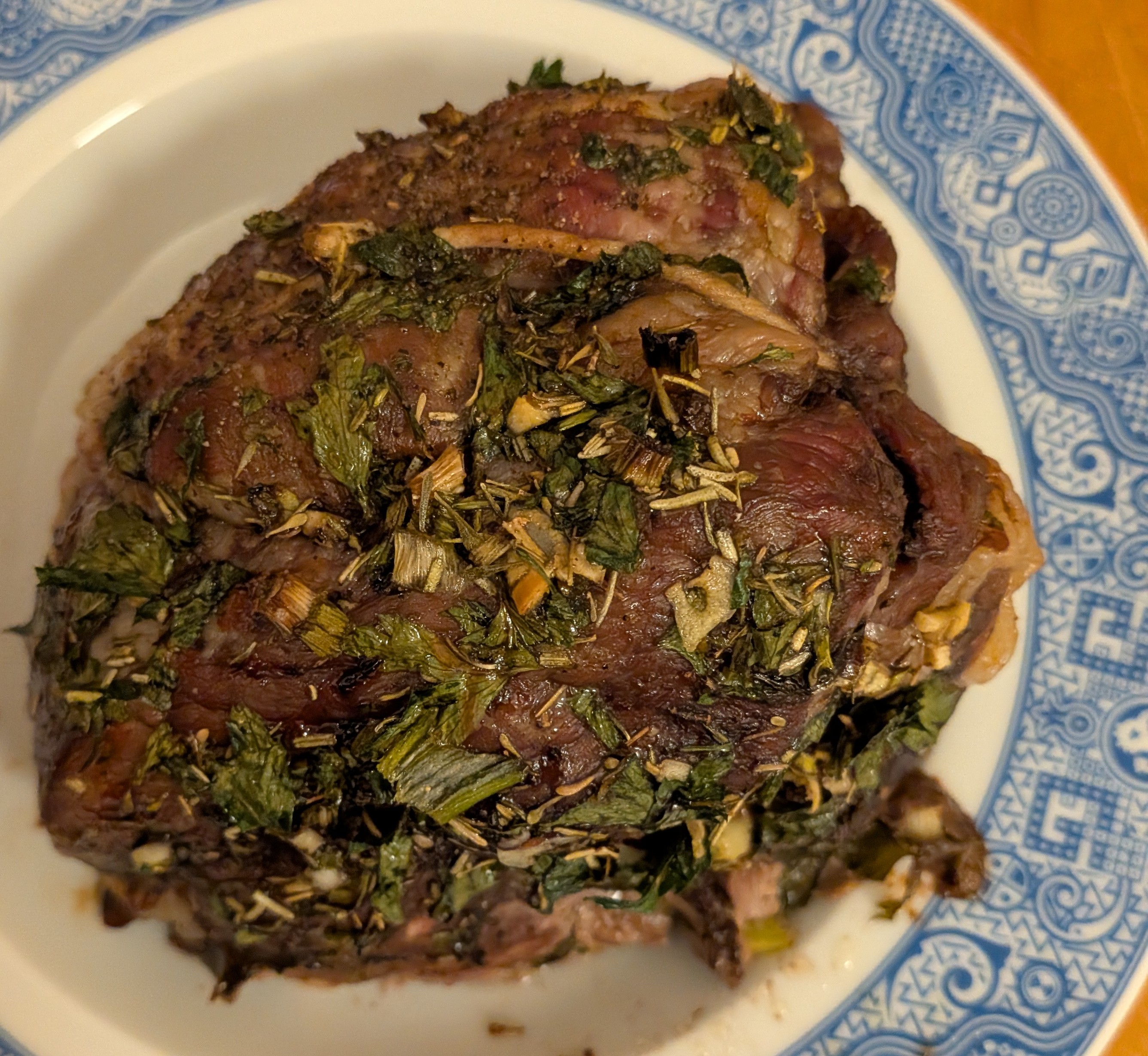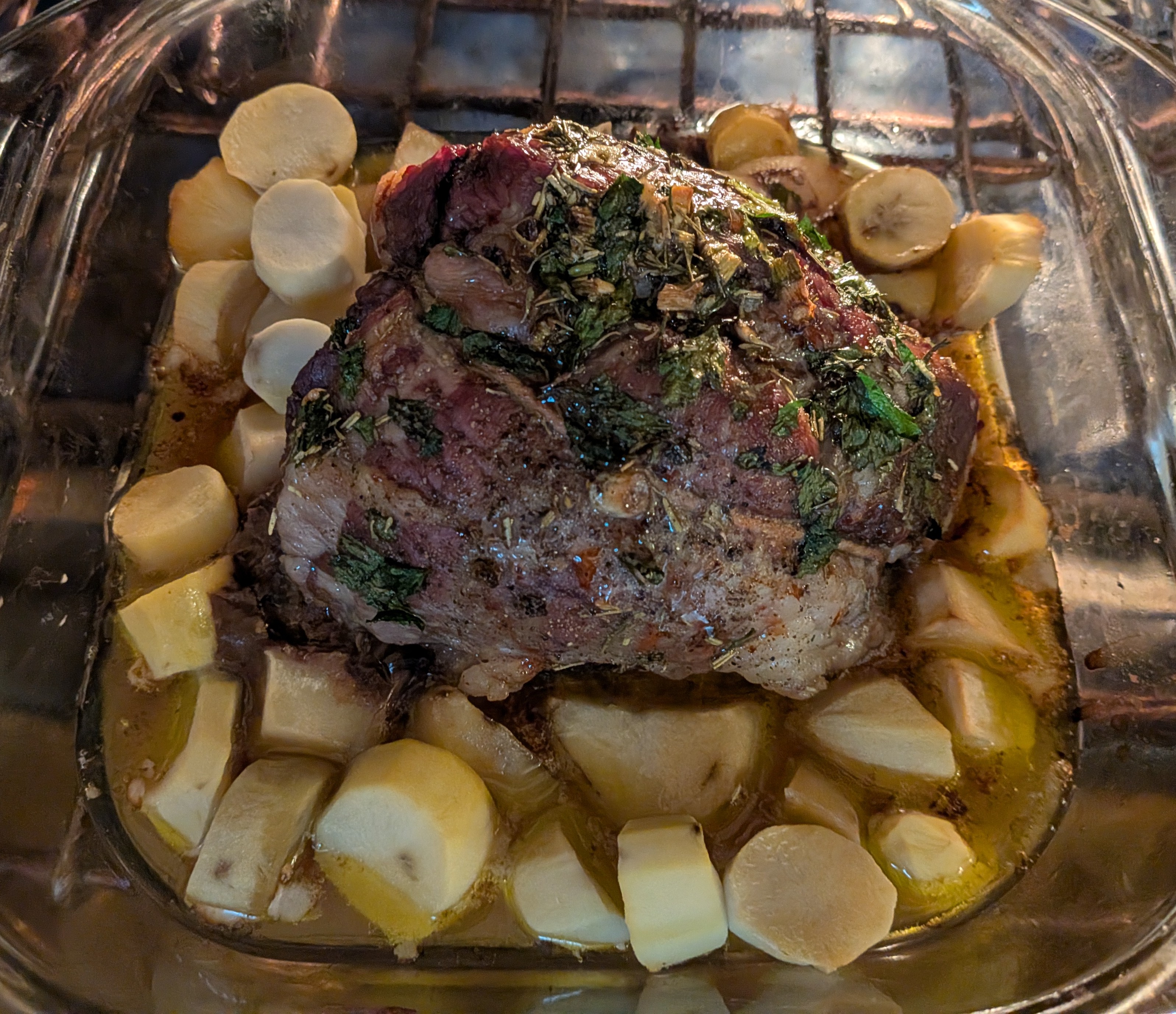 Boneless leg of lamb with parsley, green onion, and garlic crust, roasted at 250 F with the convection fan on for around 2.5 h.