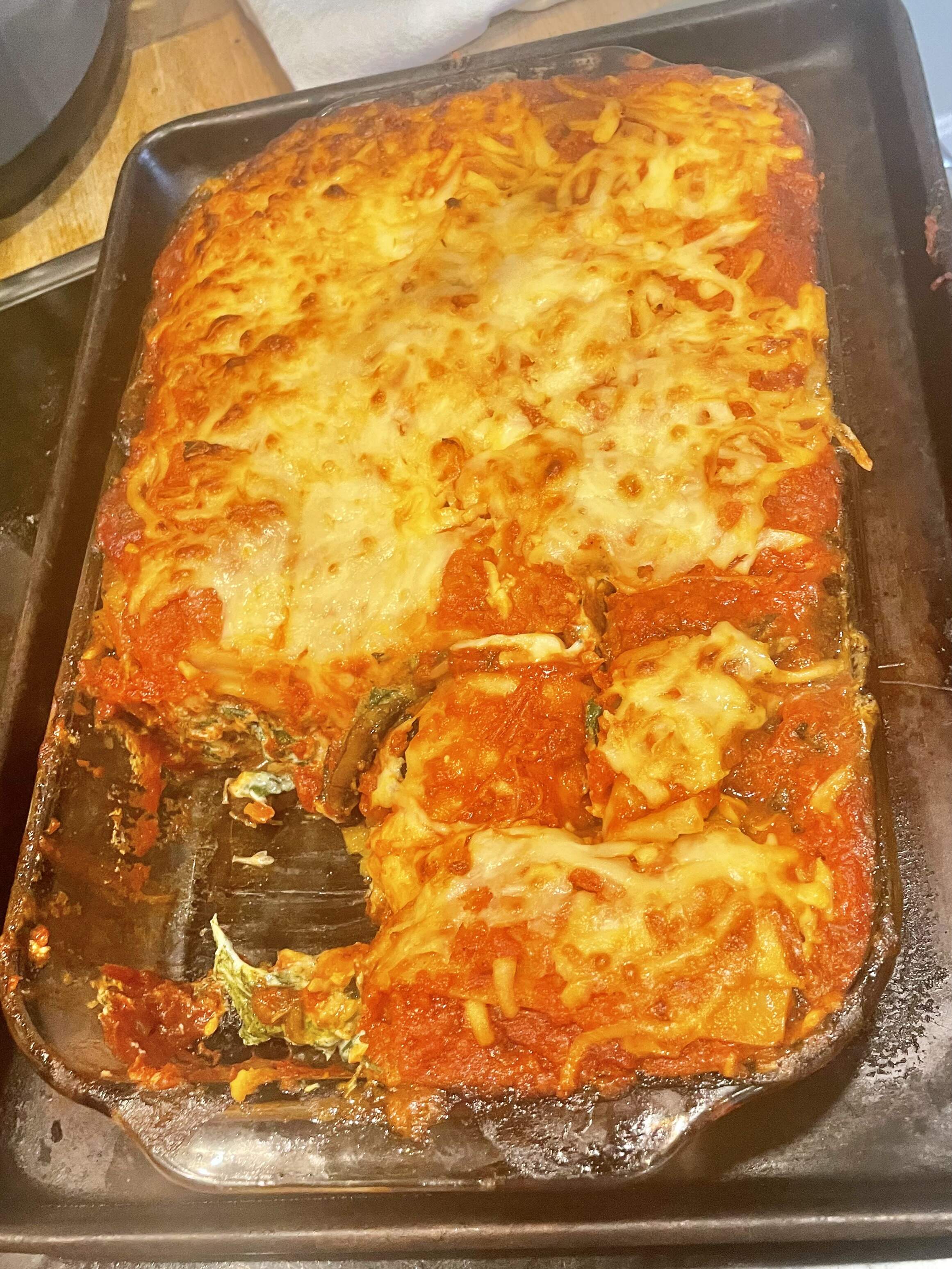 Meal was a weird compulsion for us for Easter (it’s usually lamb and ham and assorted other family favorites), but was tasty nonetheless: chicken roasted with potatoes and green beans, roasted vegetable pesto lasagne, and a simple salad that was the surprise hit (dressed only with olive oil, lemon juice, and parmesan cheese).