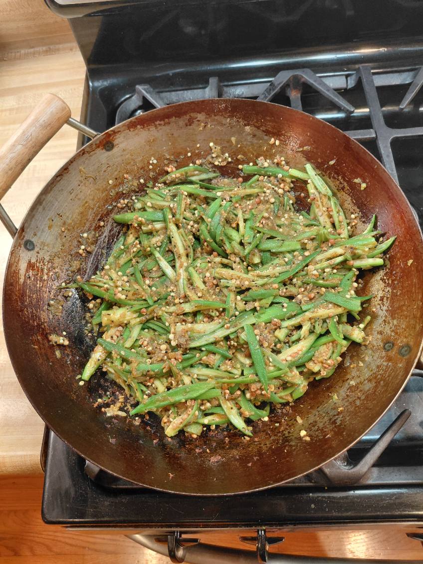 Here is the Bindi Masala (Indian Spicy Okra) … I shouldn’t have done 2 lbs of okra in the wok, one lb would have been better.