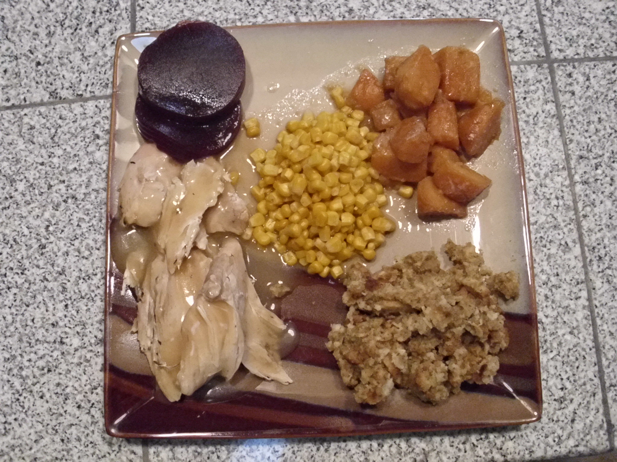 Easter Dinner was Turkey (breast), stuffing, gravy, sweet potatoes (with butter and brown sugar), corn and cranberry sauce.