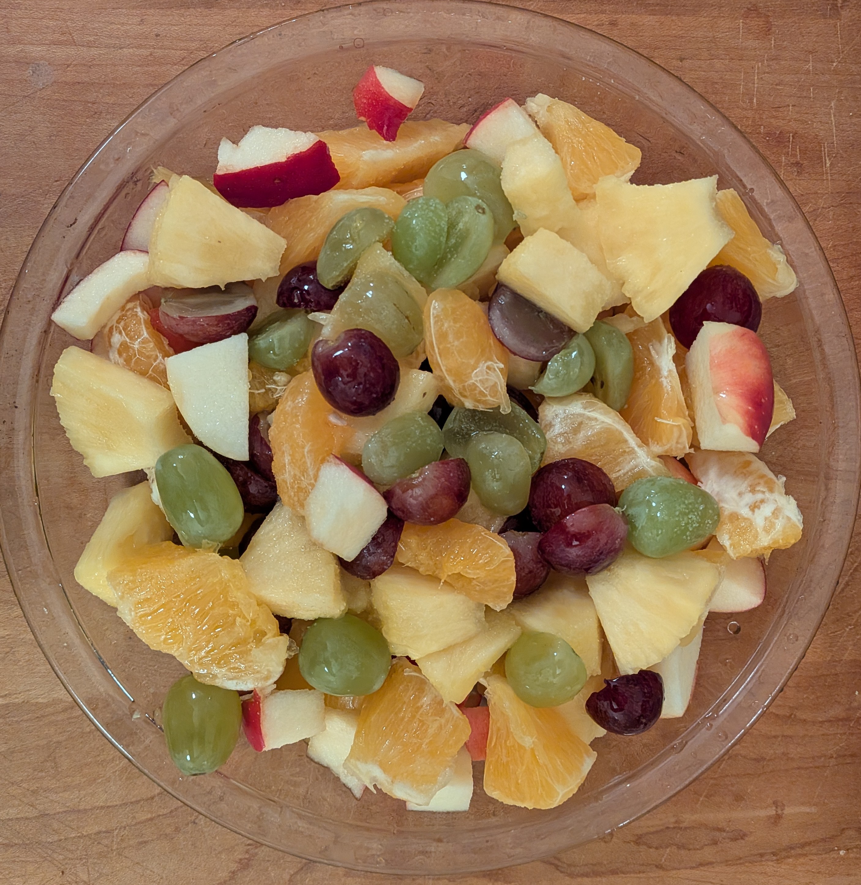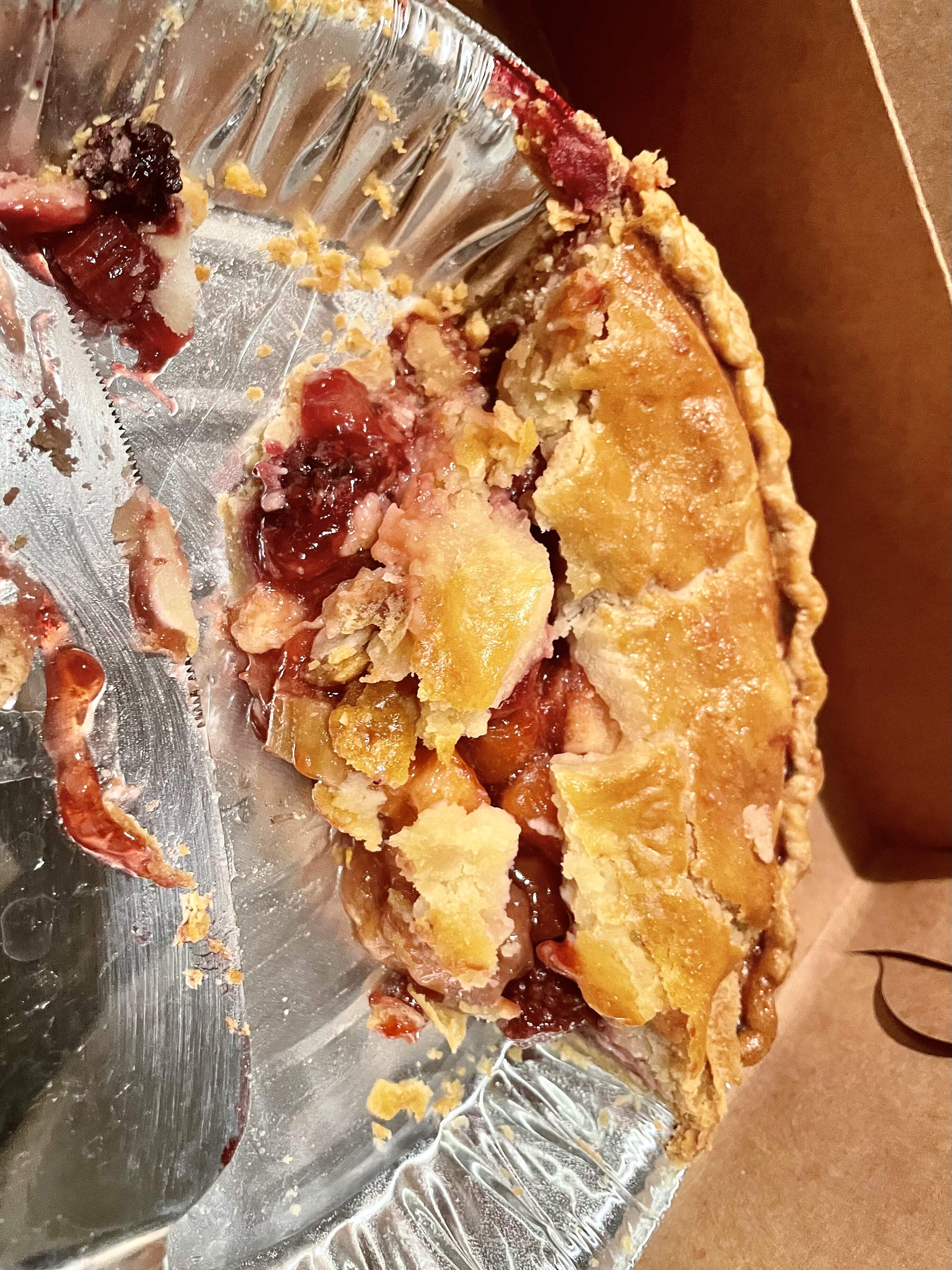 I was in a food coma by dessert, so I was remiss in taking photos of the two pies and three kinds of ice cream. I took this one of the remains of the berry apple pie: