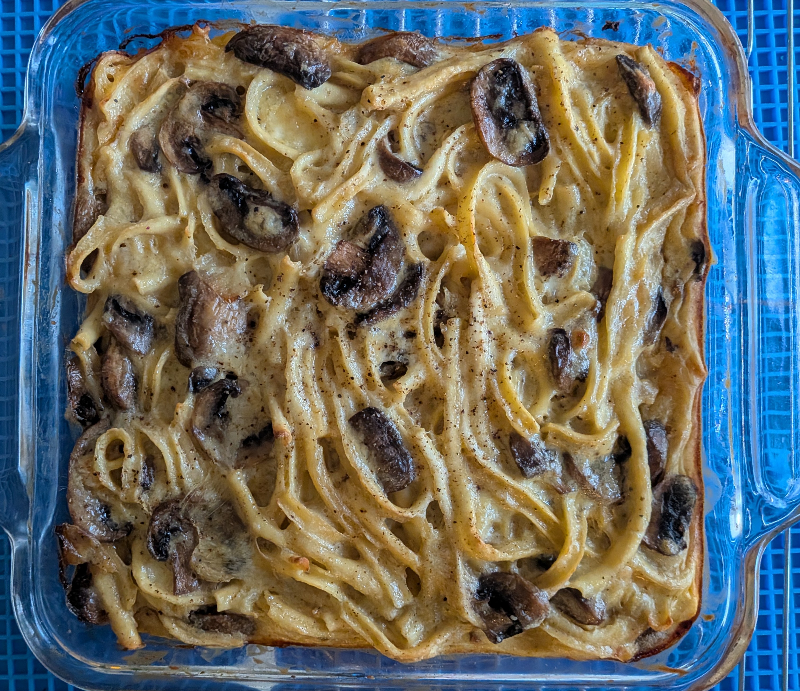 Cheddar Mushroom Spaetzle Kugel, based on this recipe, with leftover roast lamb, and green beans for Easter Monday