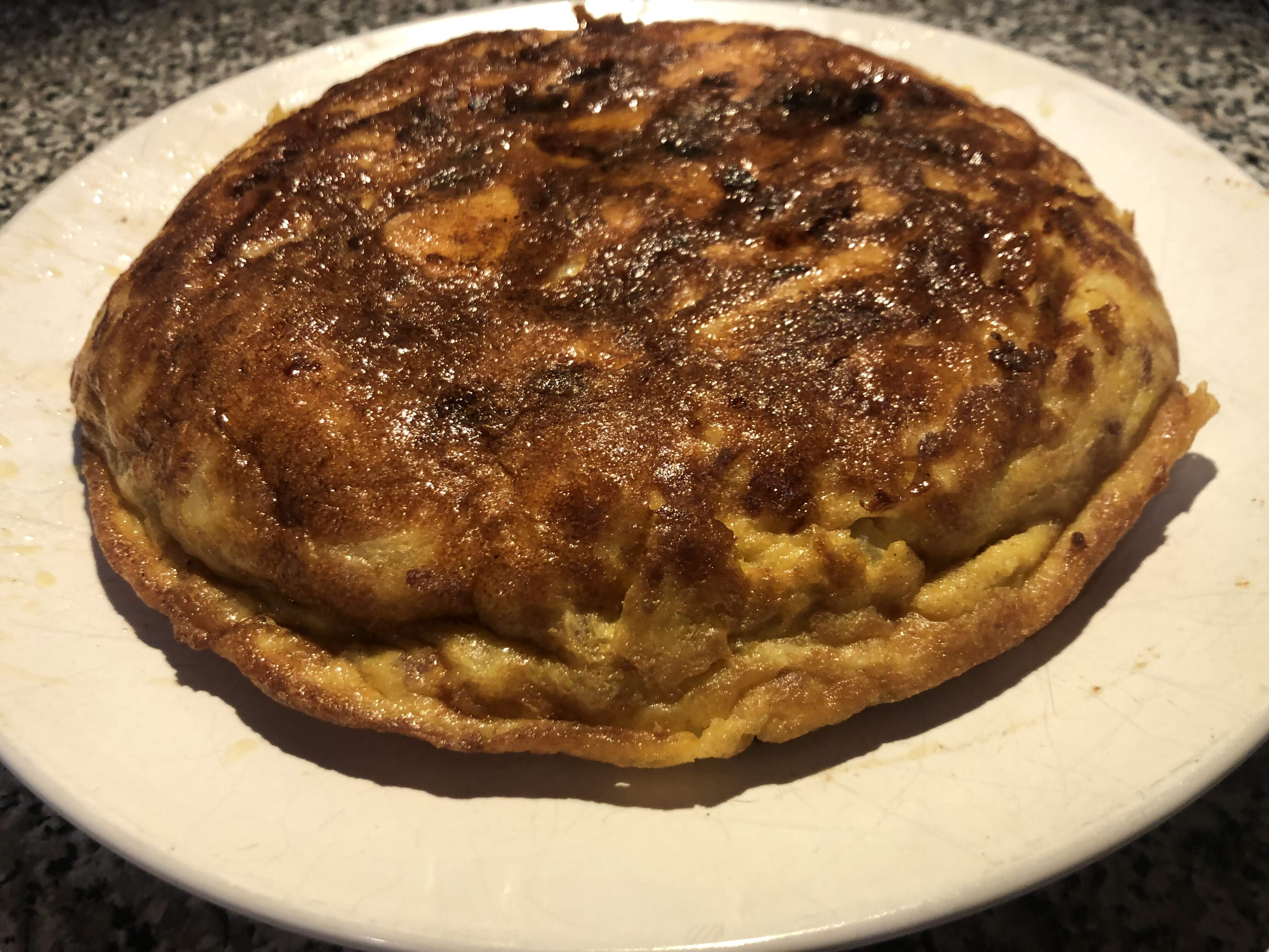 Tortilla Espanola isn’t difficult to make. I think I finally mastered it, although not the traditional process. I used pre-cooked potatoes given the price of good olive oil. I take the pre-cooked potatoes, slice and sauté with onions started a few minutes ahead. I use about a 1/4 cup of olive oil, get onions translucent and the potatoes warmed up and soaked in oo, add some smoked paprika. Then I add to the egg mix, which is salted and some added fish sauce for umami. I then fry it for 5 minutes, and put in the toaster oven for 15, take it out, fry the other side. Here’s what it looks like.