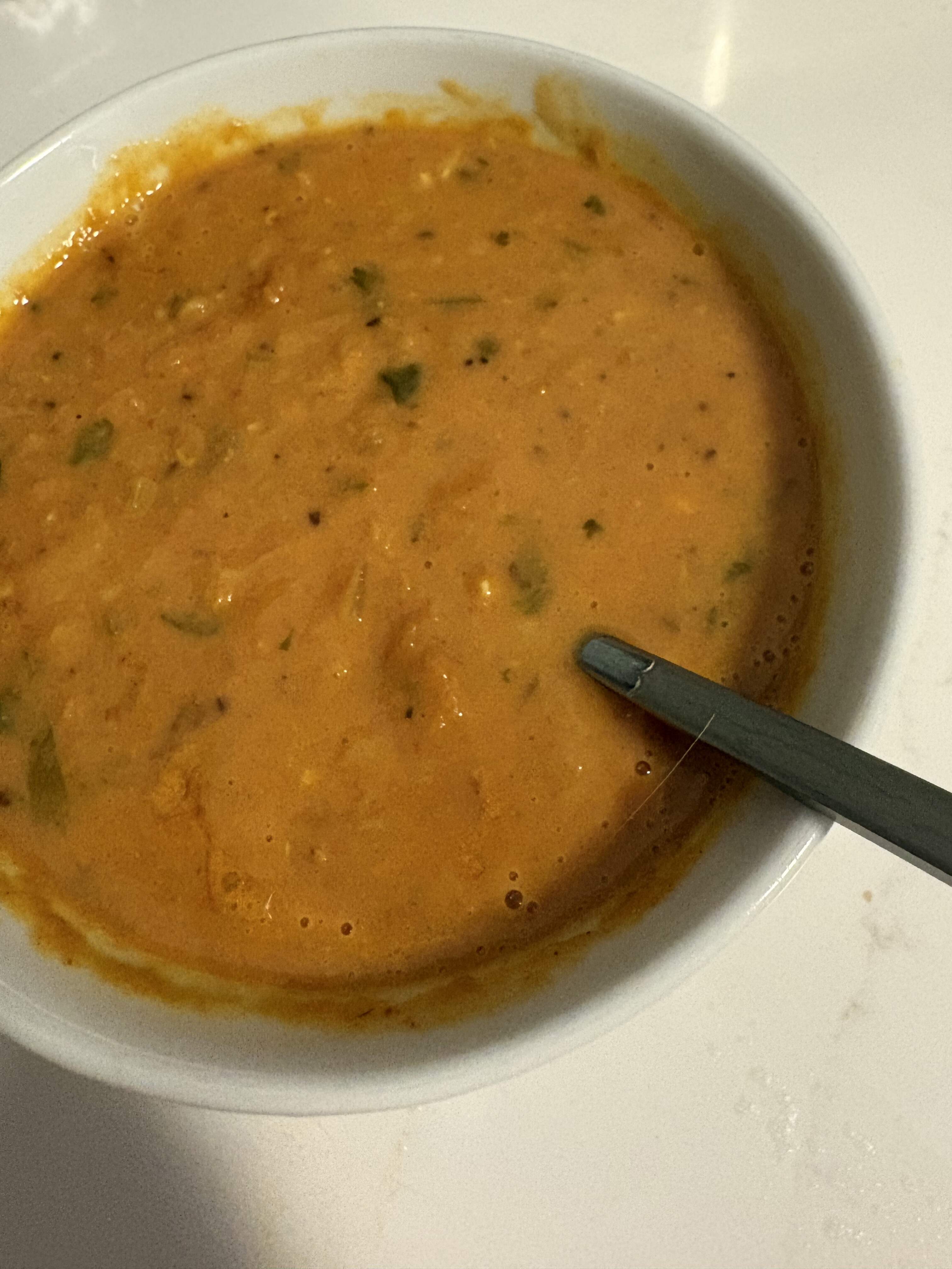 This was a really tasty soup. I roasted a bag of frozen mixed small tomatoes with the harissa and oil. It was very full of liquid, so I reduced the amount of stock. I put the tomatoes through the food mill before adding to the soup. This was really nicely spiced with cumin, coriander, turmeric ginger, green chilies and saffron. My tomatoes were very acidic, so I ended up adding about half a cup of cream at the end to mellow the soup out.
