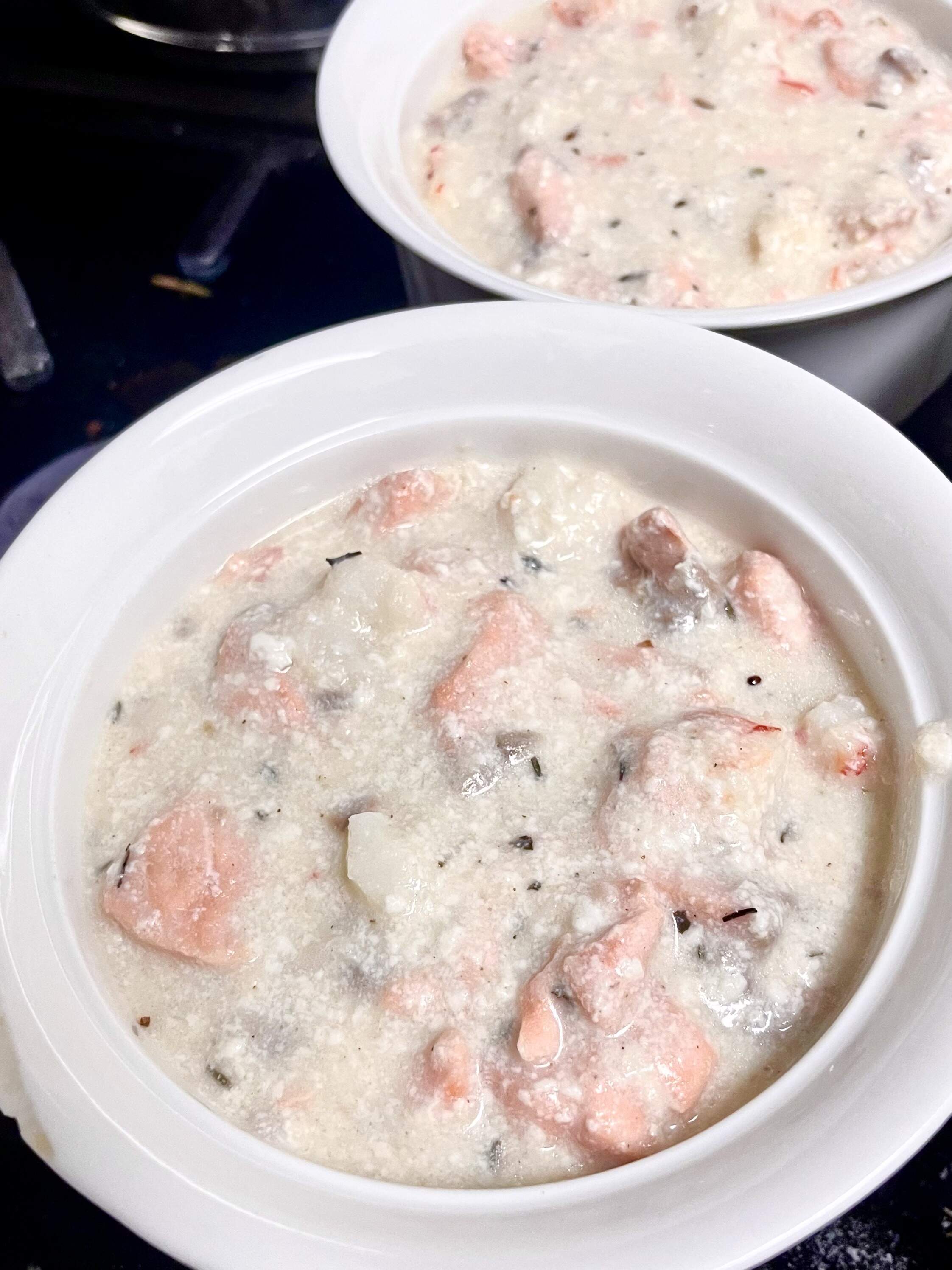 This is a relatively straightforward fish pie other than the saffron in the mash, which I skipped. This recipe poaches the fish in fish stock and then adds cream to that stock. I don’t use a lot of cream in general, so I poached the fish in whole milk and added some dashi granules later.