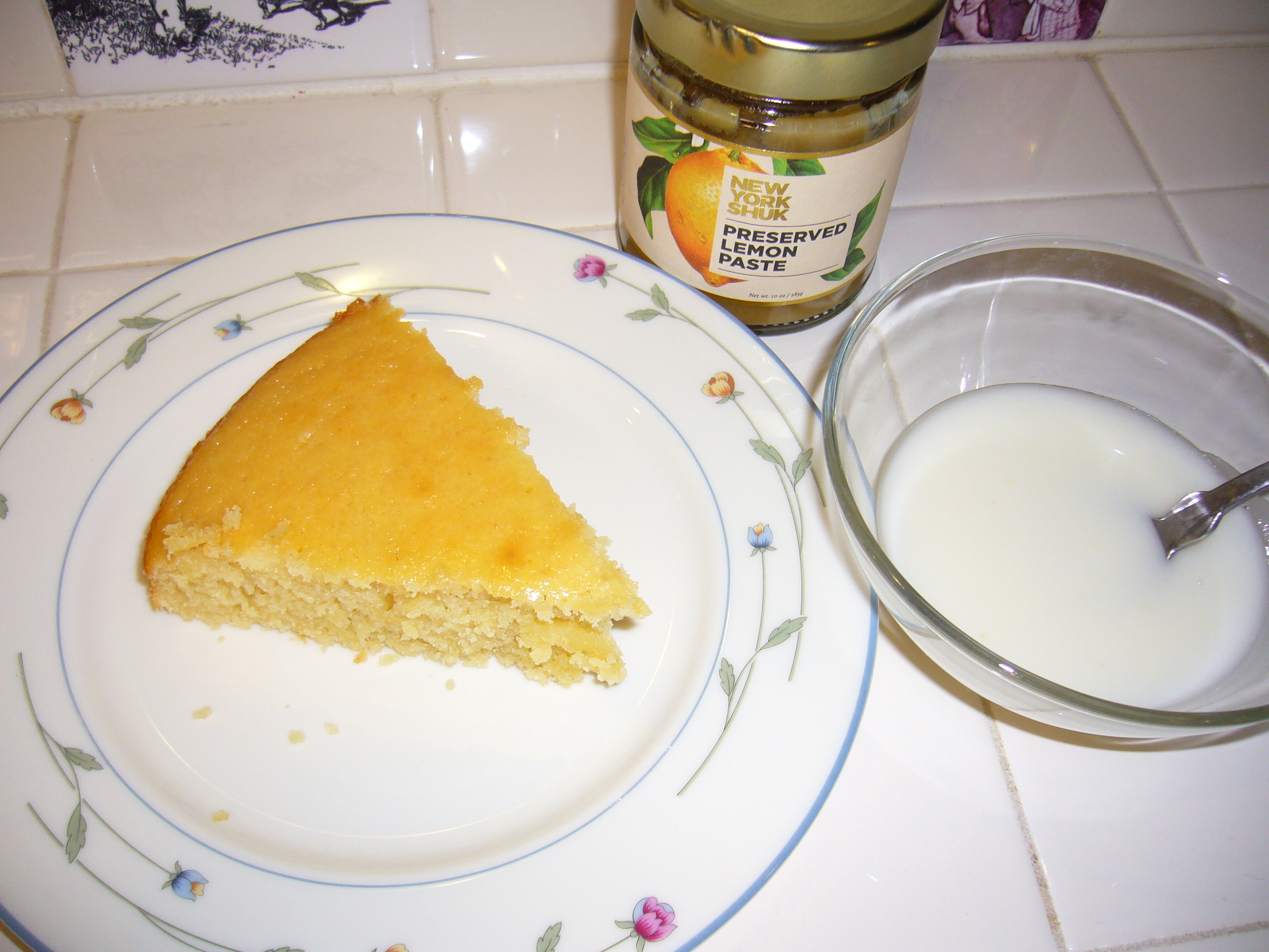 For a second I thought you meant the texture of the paste – which is pretty liquidy, not really a paste – but if you mean the cake, it is like a yogurt cake, or an olive oil cake – sort of “fleshy” if that doesn’t alarm you – there’s some body to it, moist and a little heavy for its size compared to like a cake-mix cake. But not underbaked. I hope that makes sense. Not too much salt in the lemon paste–just right. I think it will work in anything that calls for lemon zest or juice–très convenient!