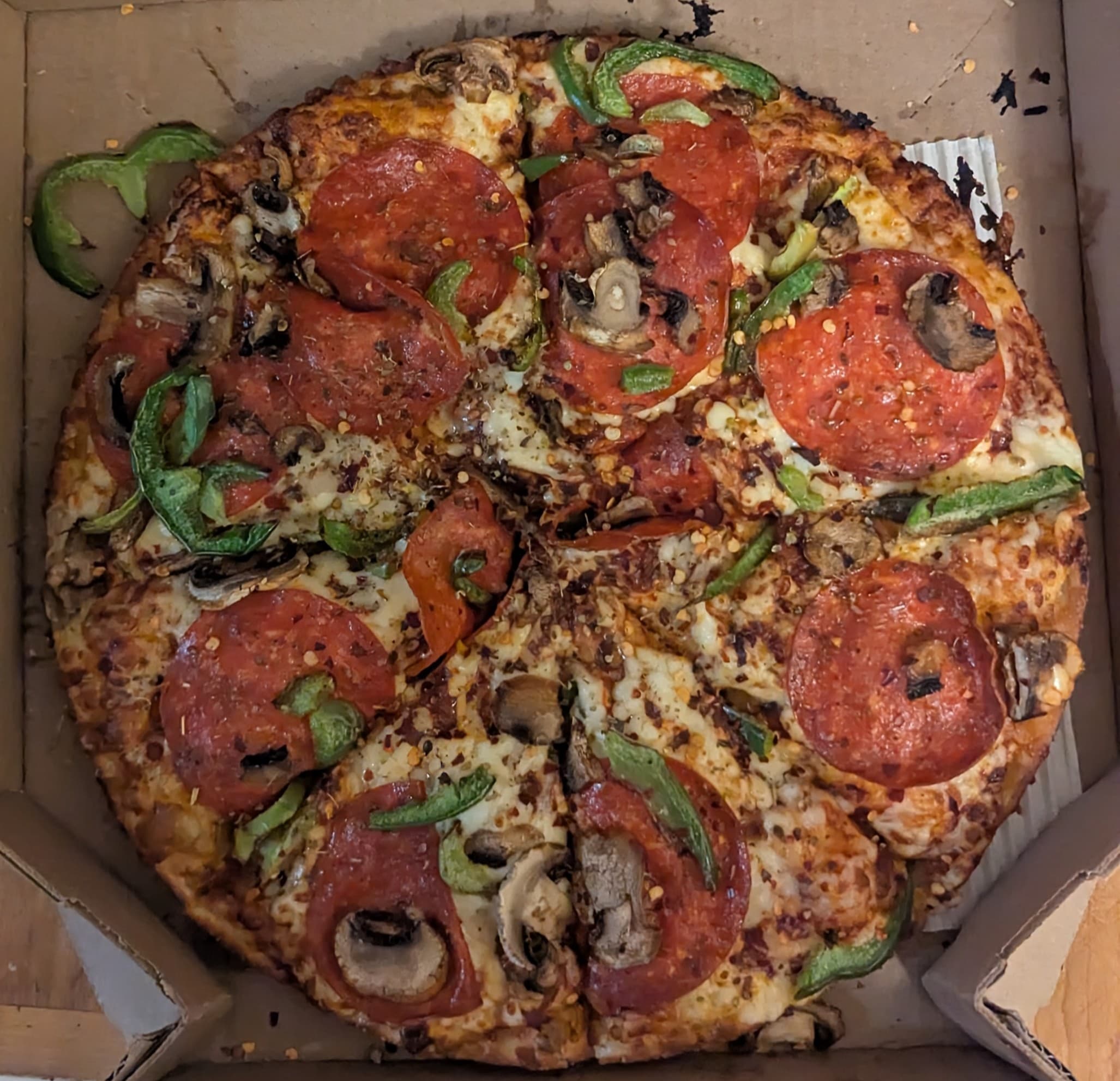 Sadly, no green peppers available and I should’ve loaded more cheese, but was good eating, particularly after I plastered both blue cheese and Bourbon bbq sauce over