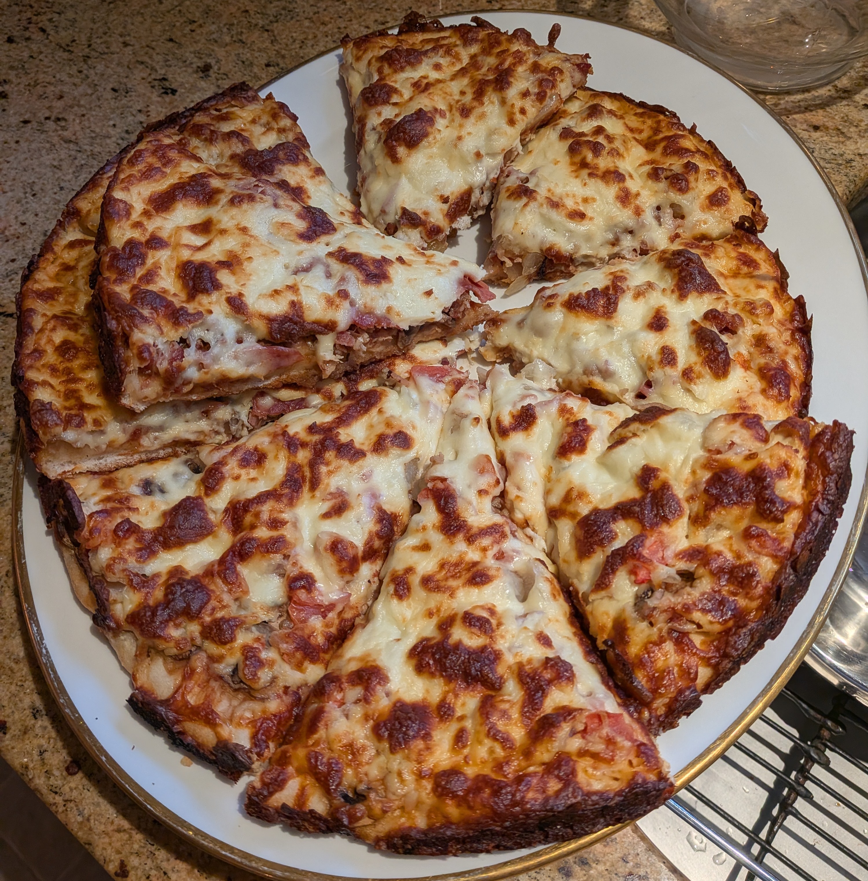 The toppings were good on this one, but the some of the pizza crust was gummy and underbaked, due to the skill or inattention of a particular employee at this particular location.