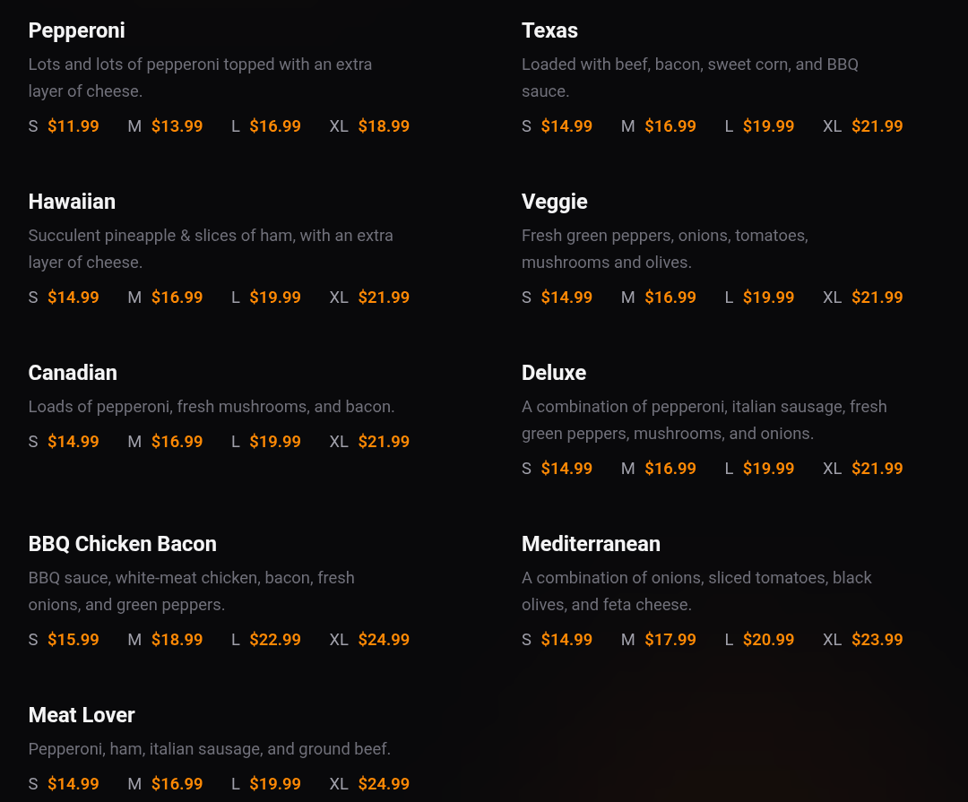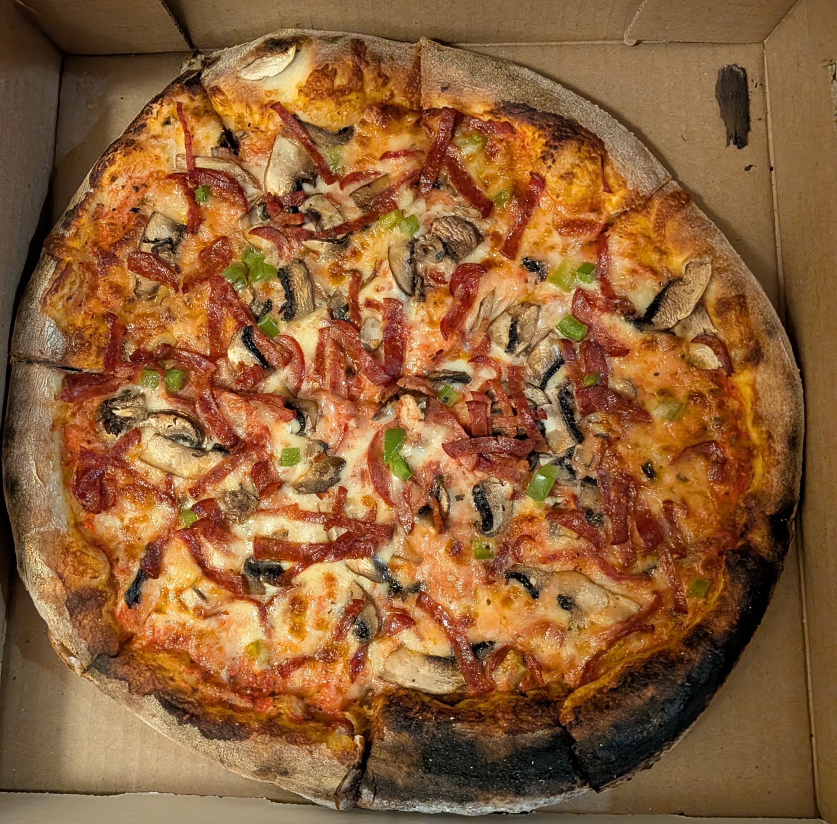 The 3 I ordered were vegetarian (tomato, mushroom, onion), Canadian (pepperoni, bacon, mushroom) and bacon + pineapple.