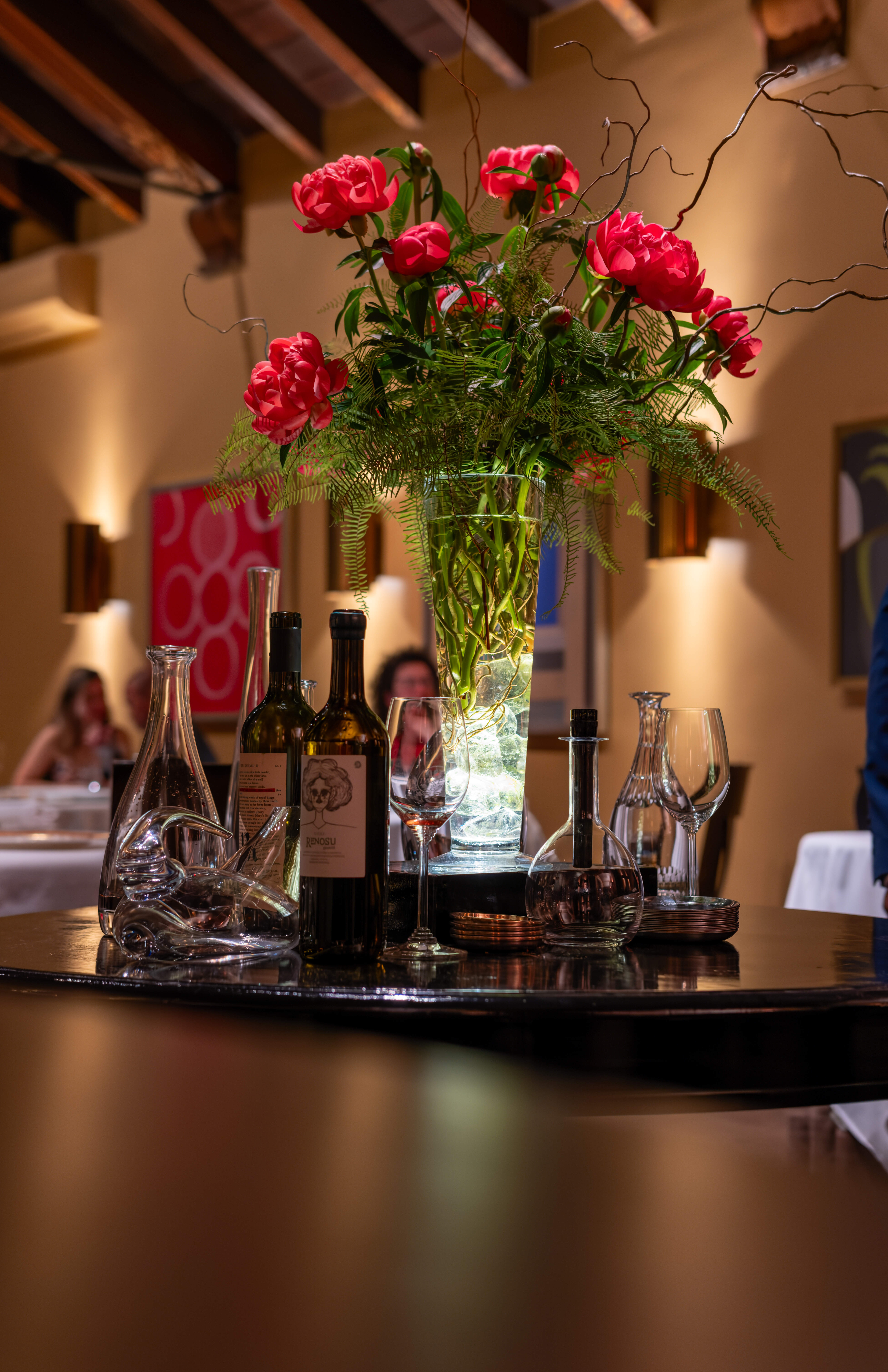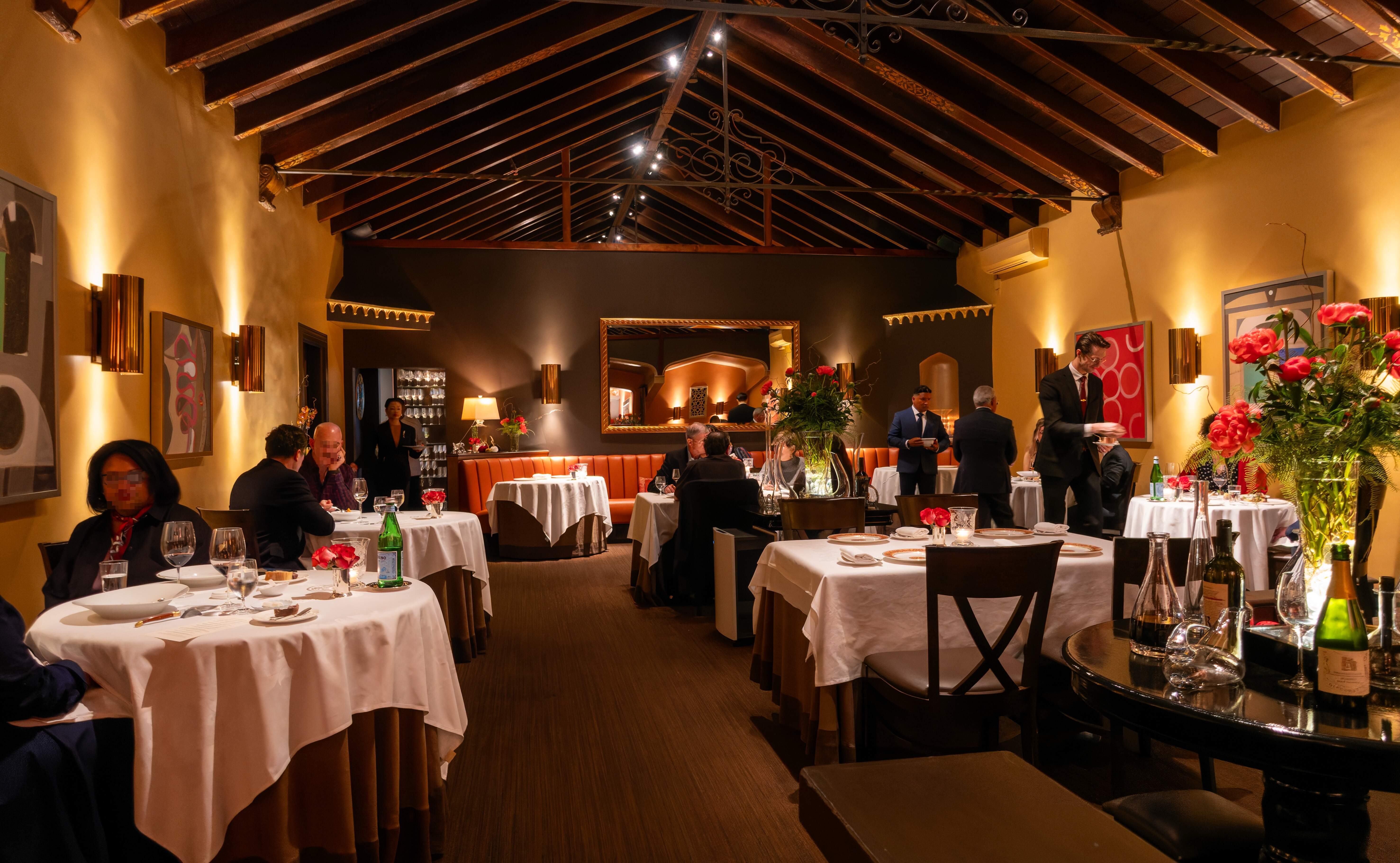 The dining room of the restaurant is elegant and not very large. It once used to be a chapel and has high ceilings.