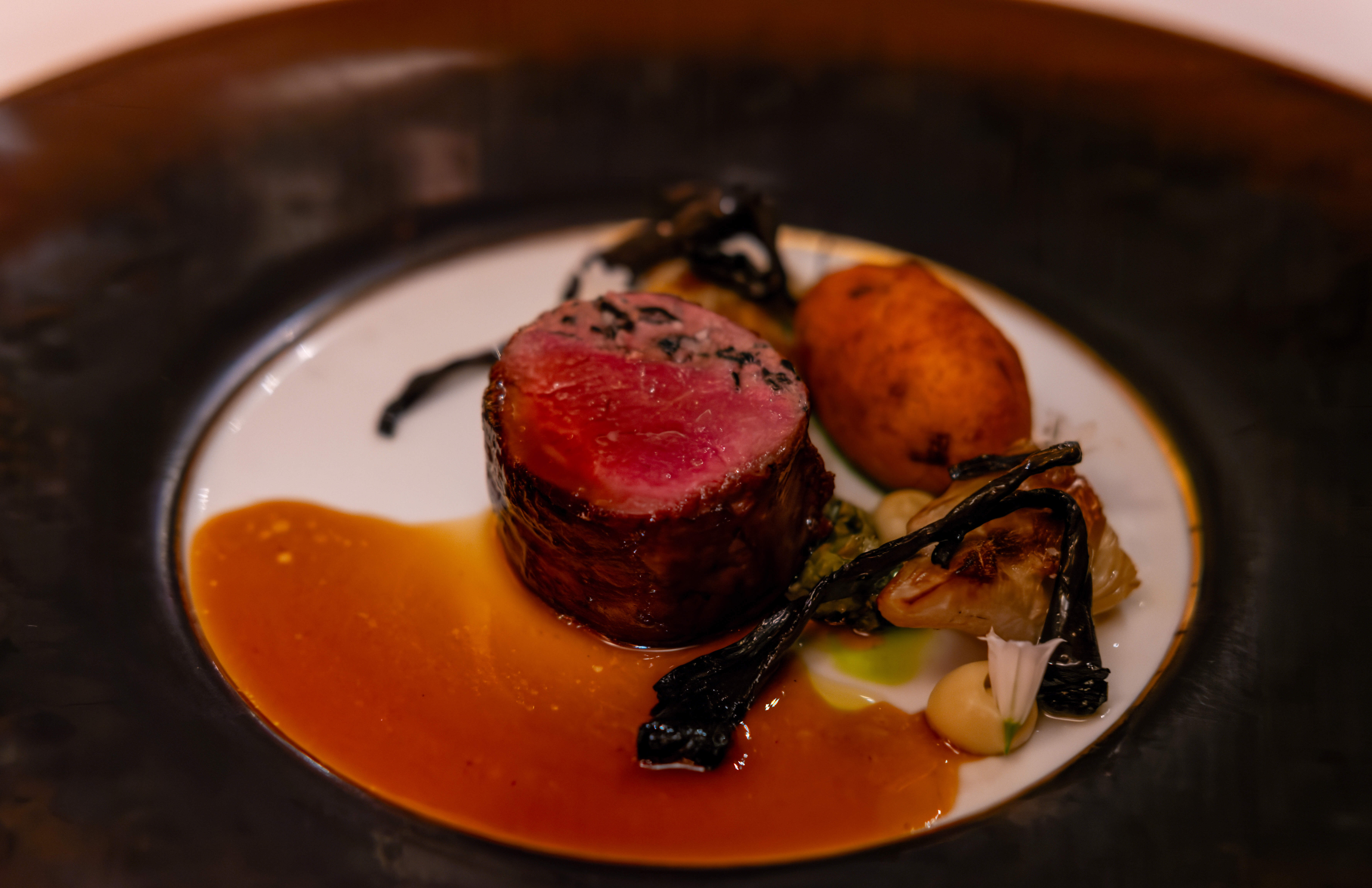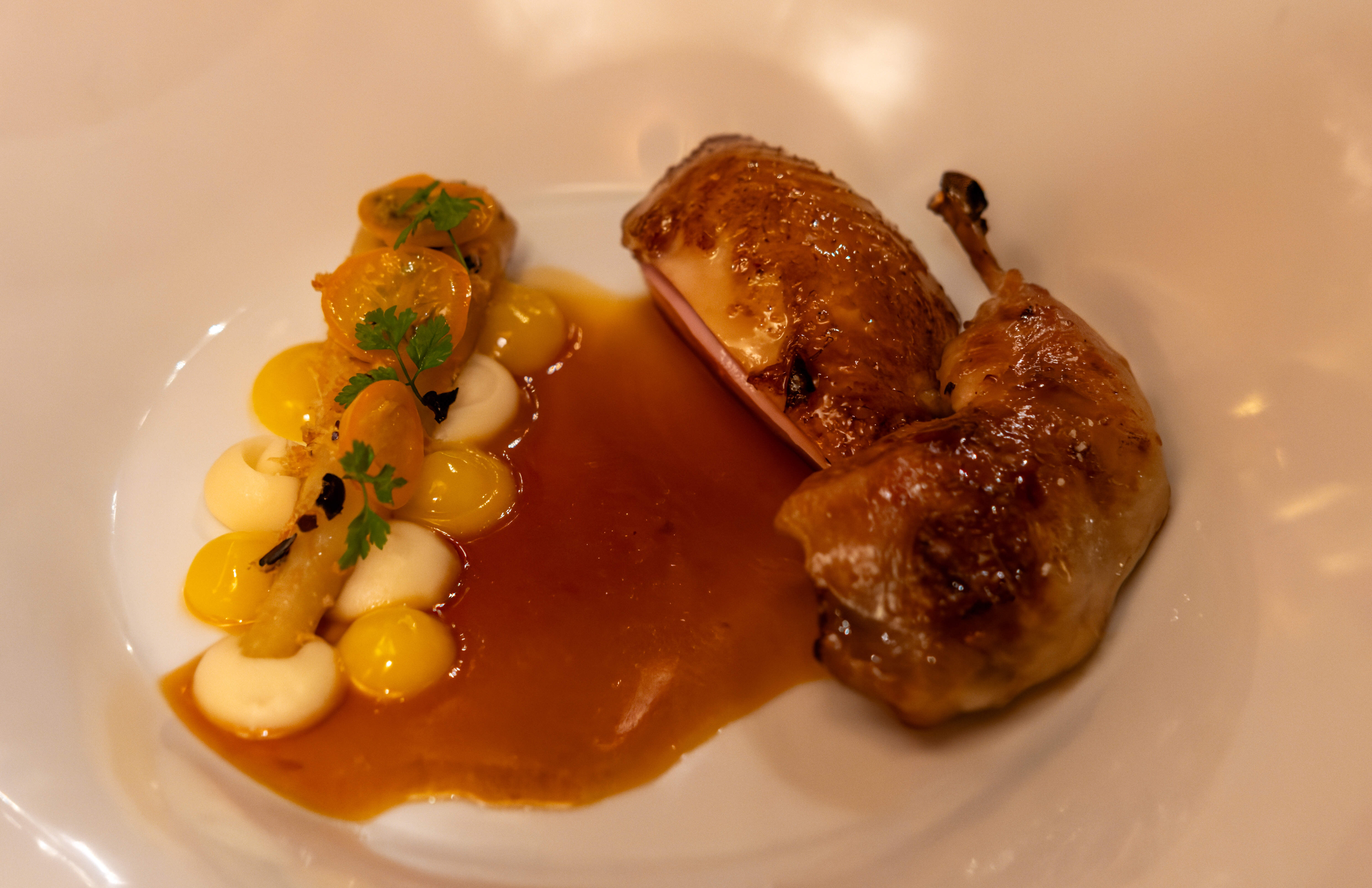 The next course was quail - which came in the form of a leg and a breast. A meaty sauce was poured on the quail at the table. This was also delicious! The quail was perfectly cooked - tender and a little gamy. The bone was still in the quail leg to eat with your hands. On the side there was also a roasted parsnip with dabs of creamy sauces, kumquat slices, and some cocoa nibs which added an interesting coffee flavor.
