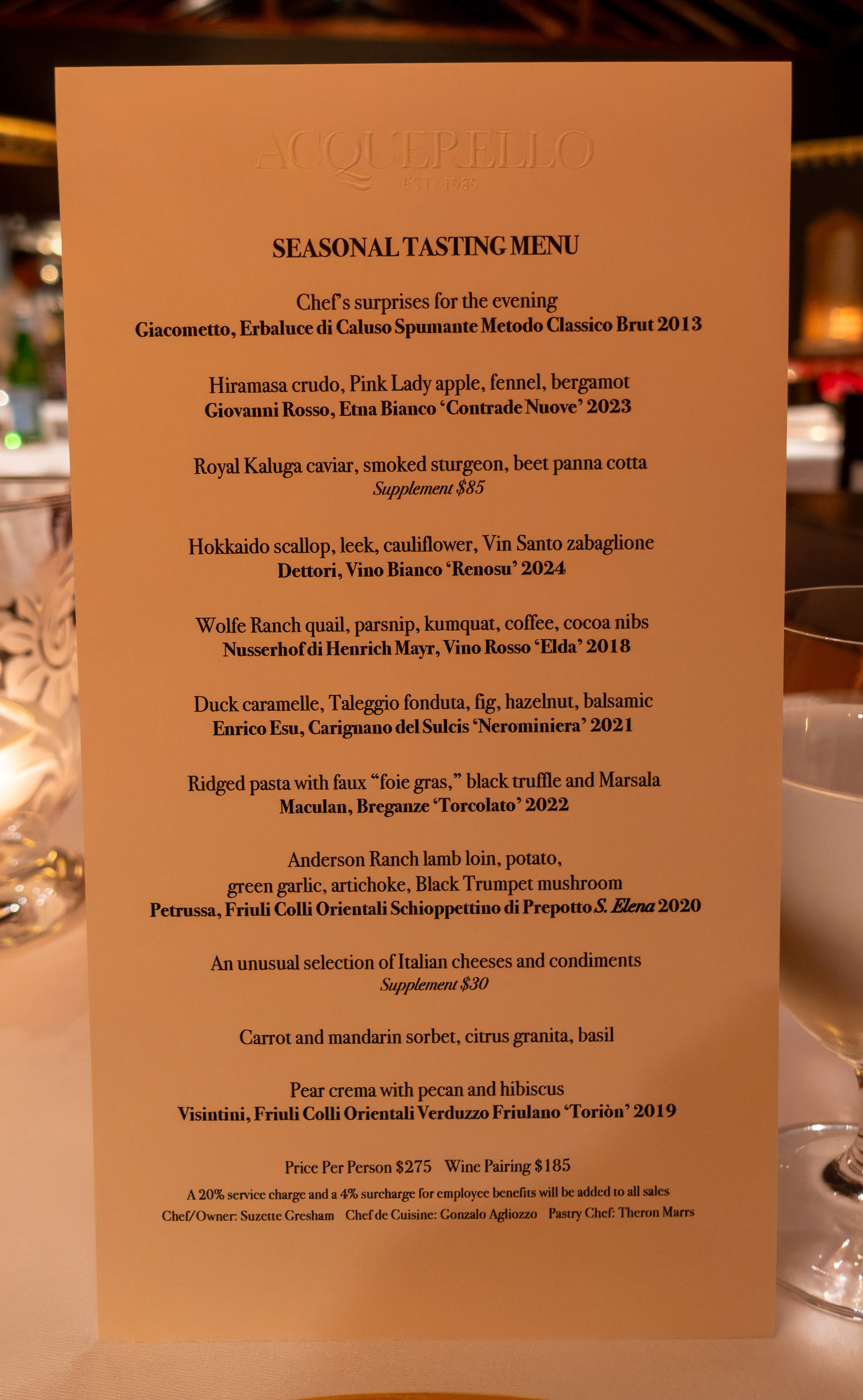 The seasonal tasting menu along with the listing of wine pairings. There’s also some supplements - a caviar, sturgeon, and beet course for $85 and a cheese service for $30, but I didn’t opt for either.
