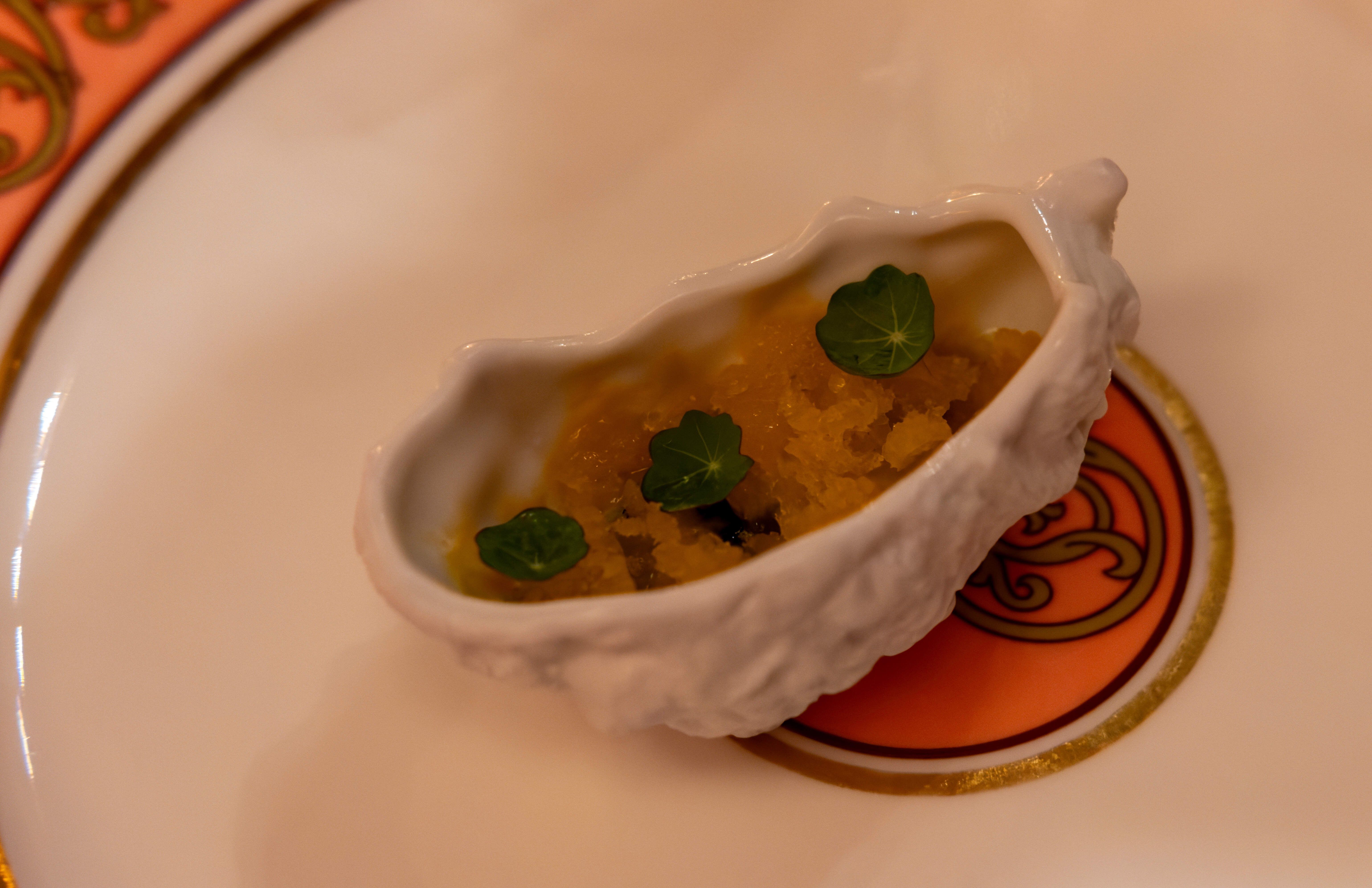 After the main course there was a refreshing palate cleansing intermezzo of a creamy sorbet surrounded by a citrus granita, with a little herbal note from the basil.