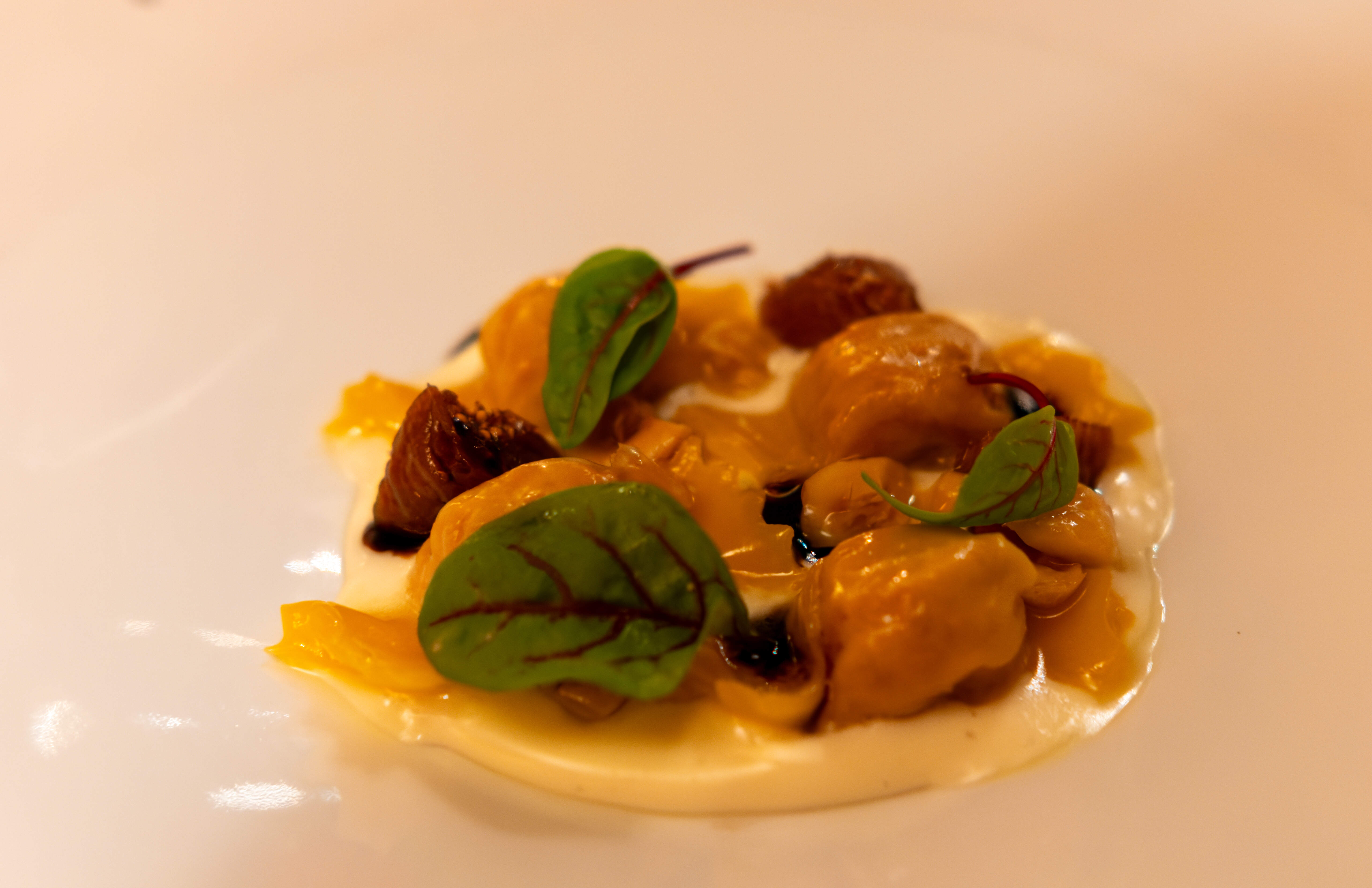 Duck caramelle, Taleggio fonduta, fig, hazelnut, balsamic