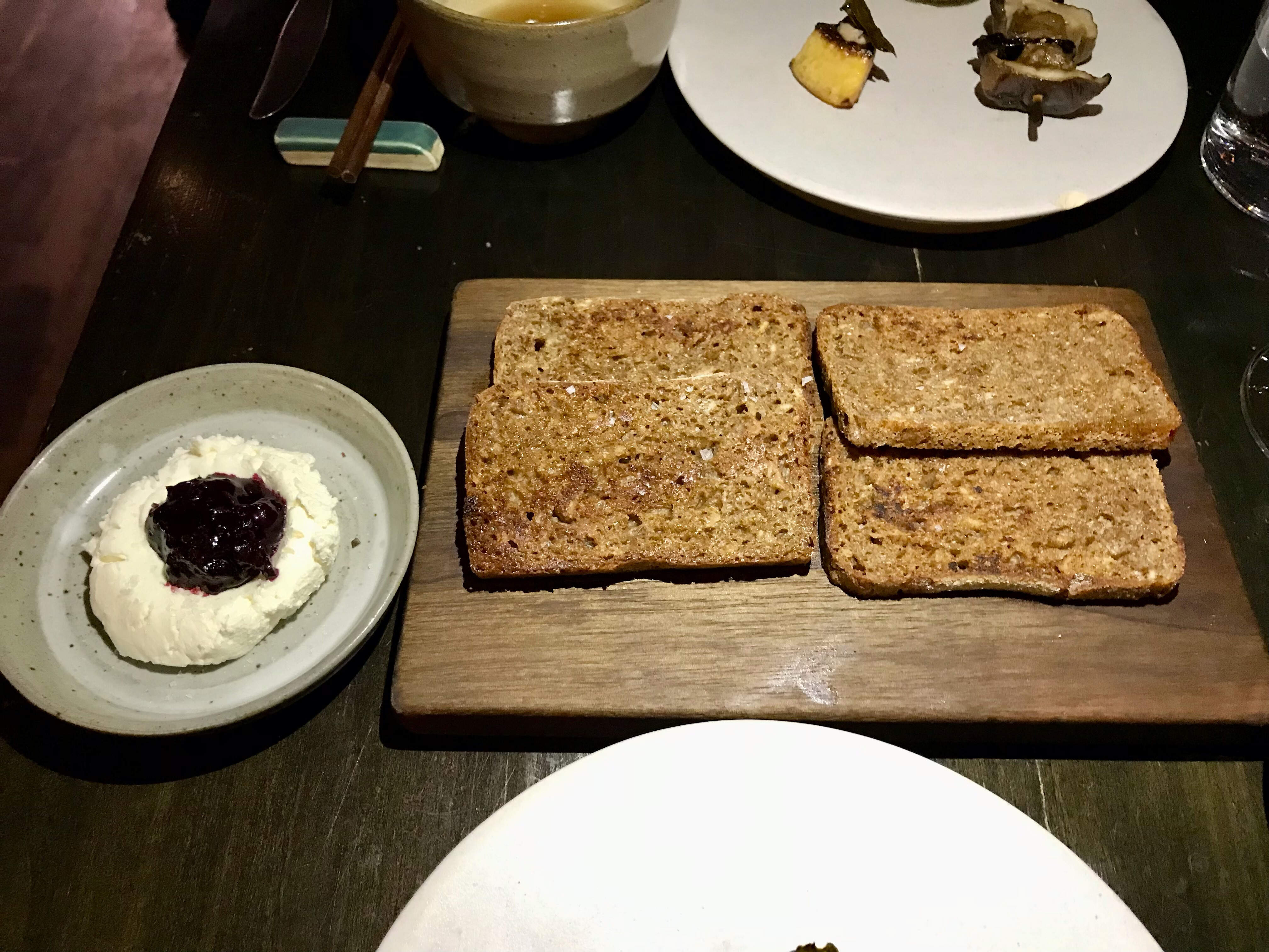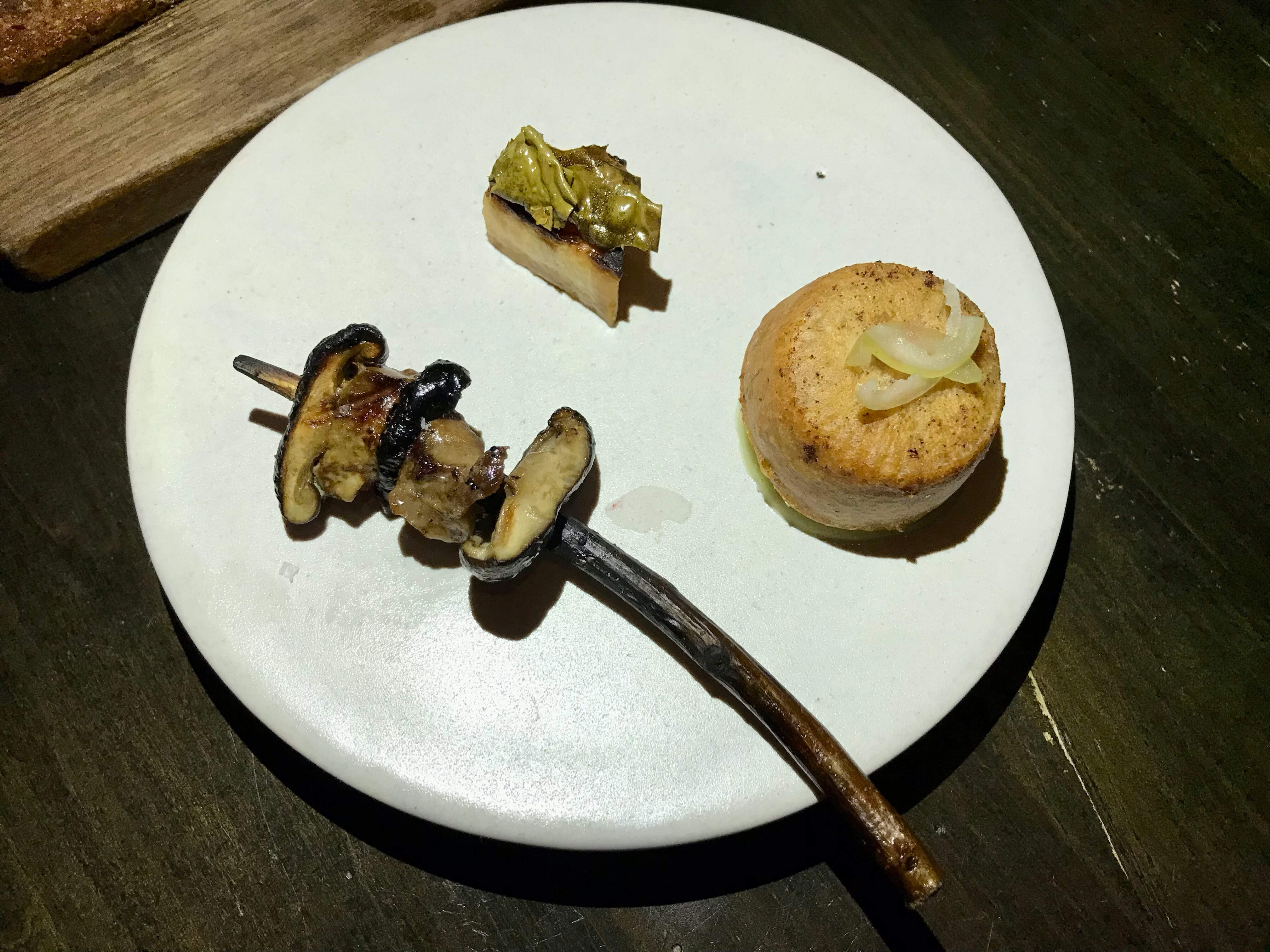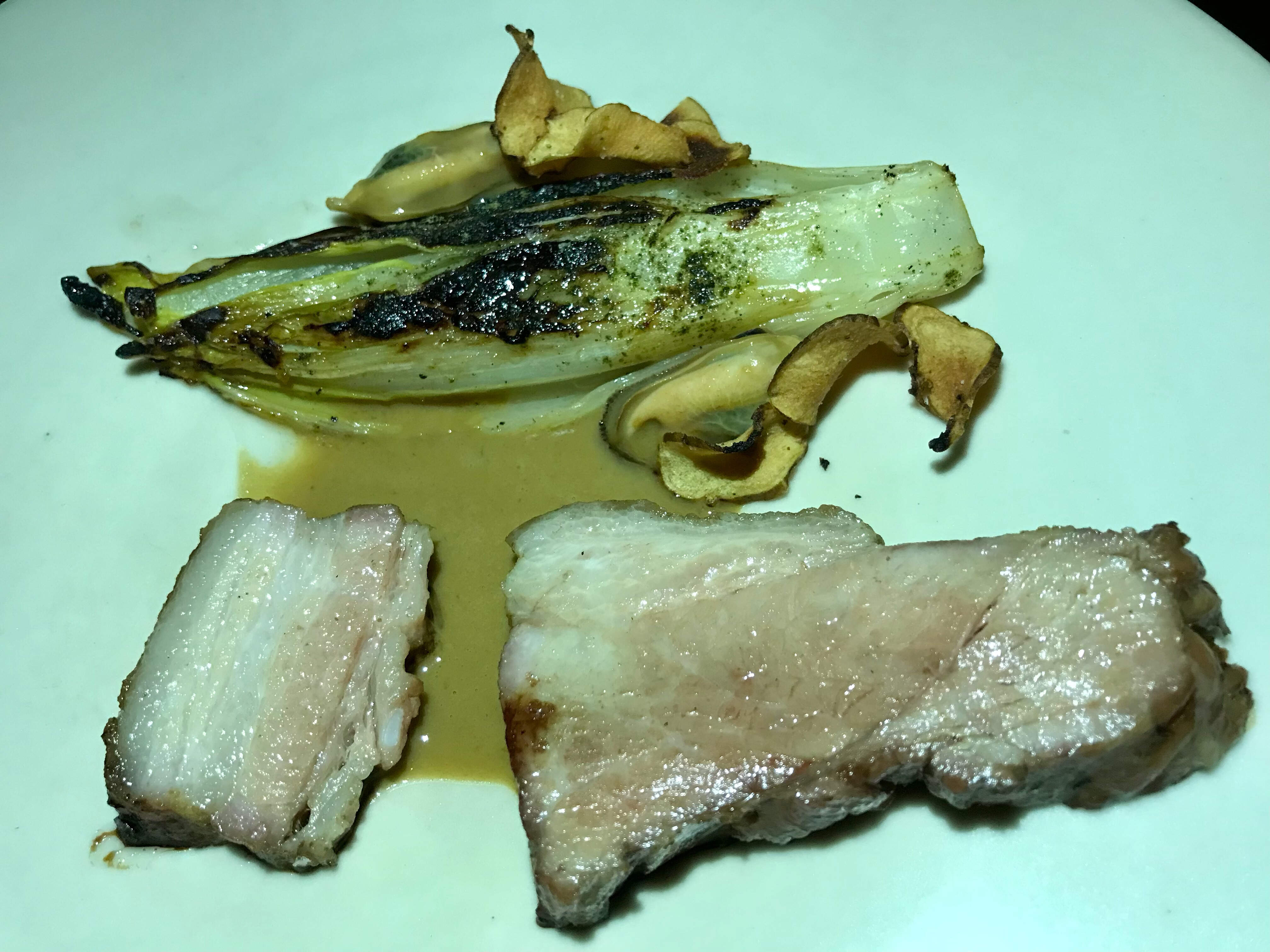 Perth County Farms pork leg, slow roasted, seared belly, pork jus with redcurrants and costata romanesco zucchini, marigold petals, with a side of blanched potatoes and green beans, on scallop roe (we couldn’t pick it out), and mayo-shiso vinaigrette - delicious pork (fat and all) with smokey grilled zucchini and a rich jus.