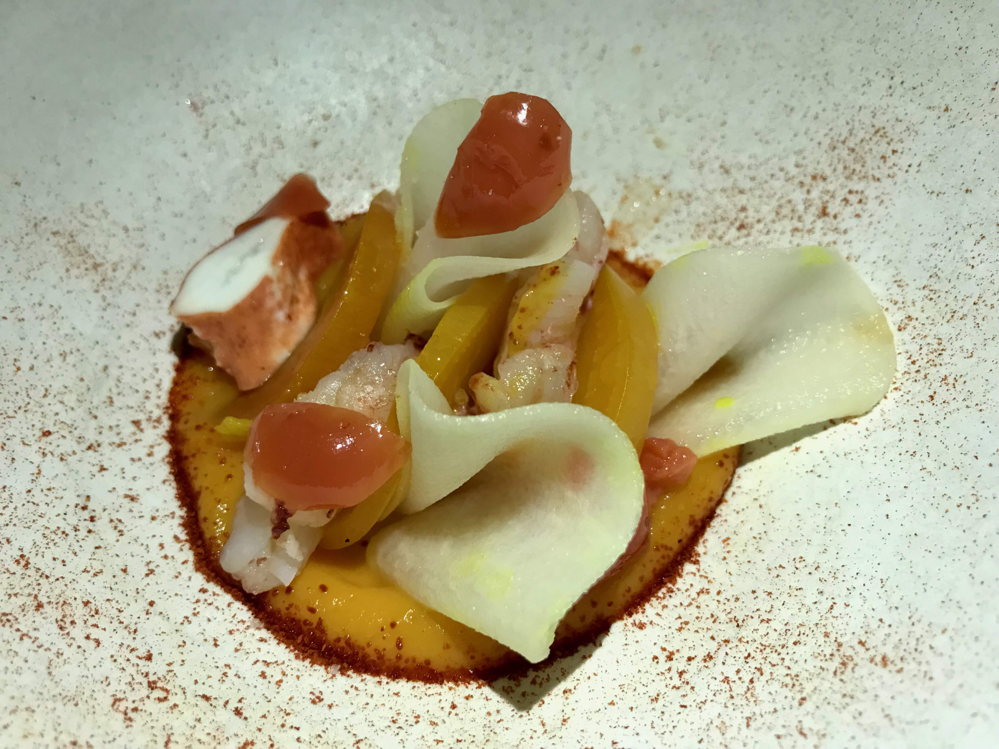 Salt Spring Island mussels, steamed and smoked and basted in butter, Ontario red and yellow tomatoes, yellow plum, sauce of fermented yellow plum with clarified tomato water and “Mexican herbs” over top - plump and smokey mussels in a light and tangy broth.
