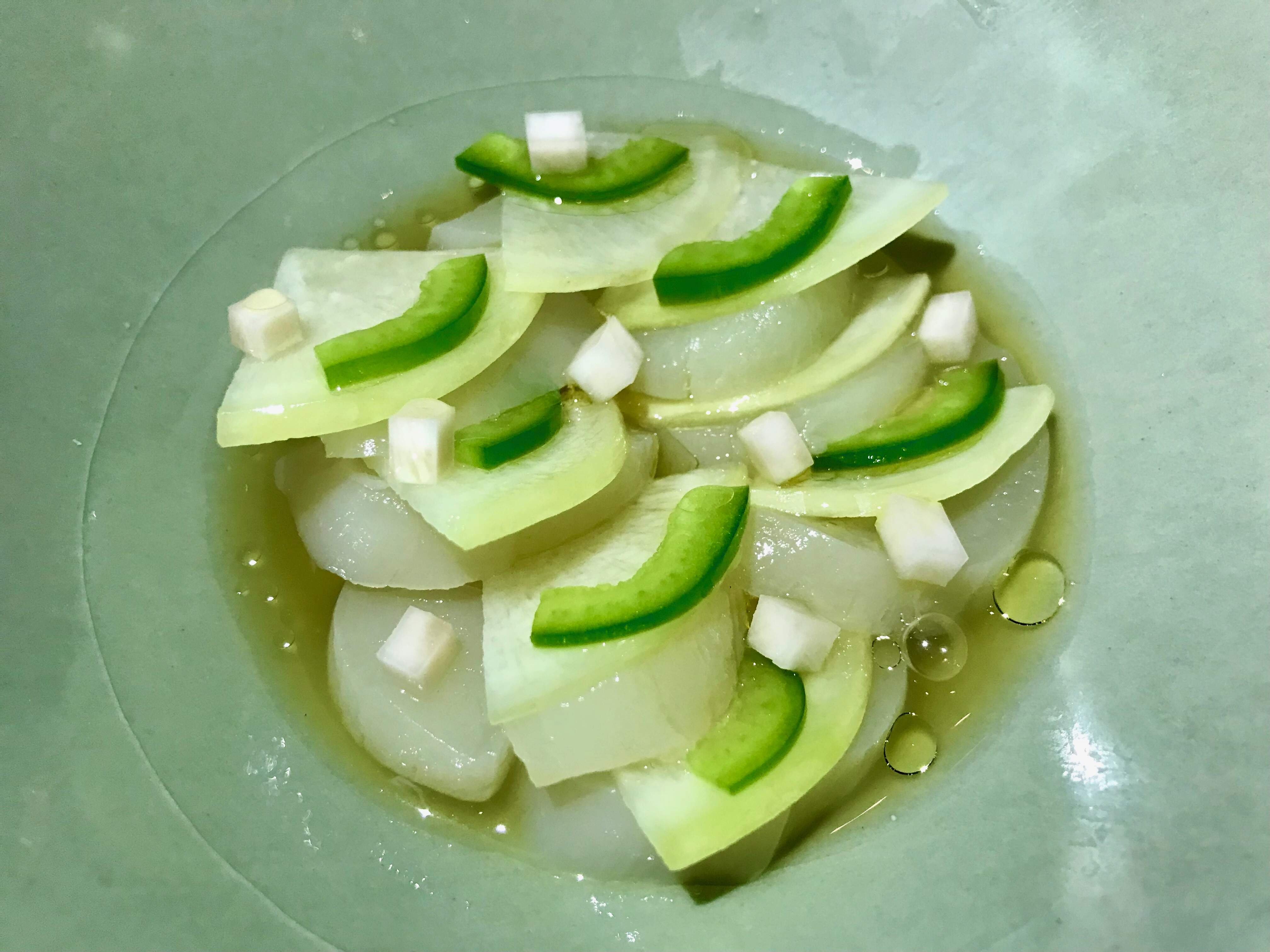 We started with sweet Hokkaido scallops, sliced jalapeños, pickled turnip, in a marinade of fish sauce, lime, and cilantro oil - lovely and fresh.