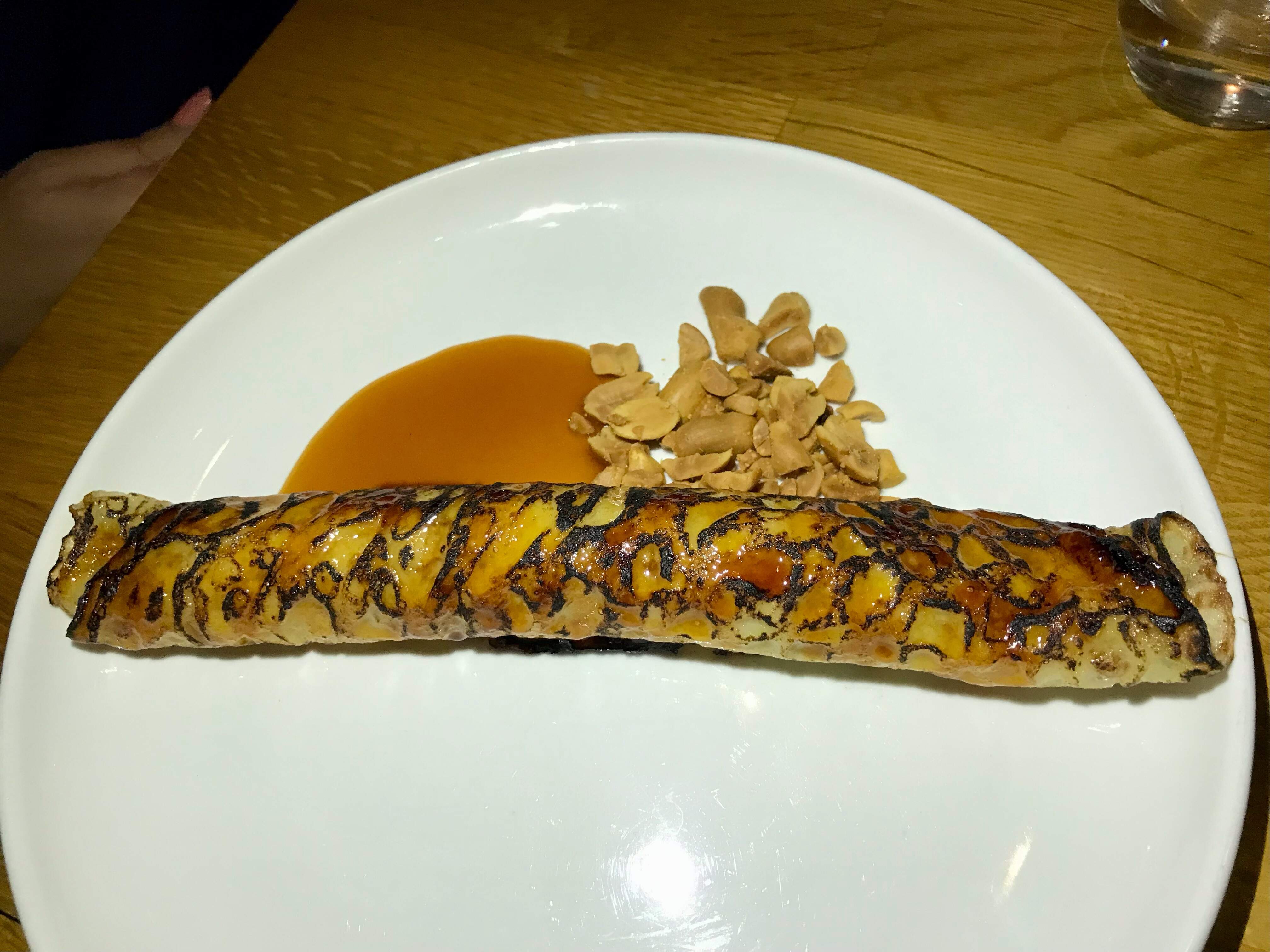 - Coconut crepe brulee, with a tangy passionfruit caramel and peanuts.