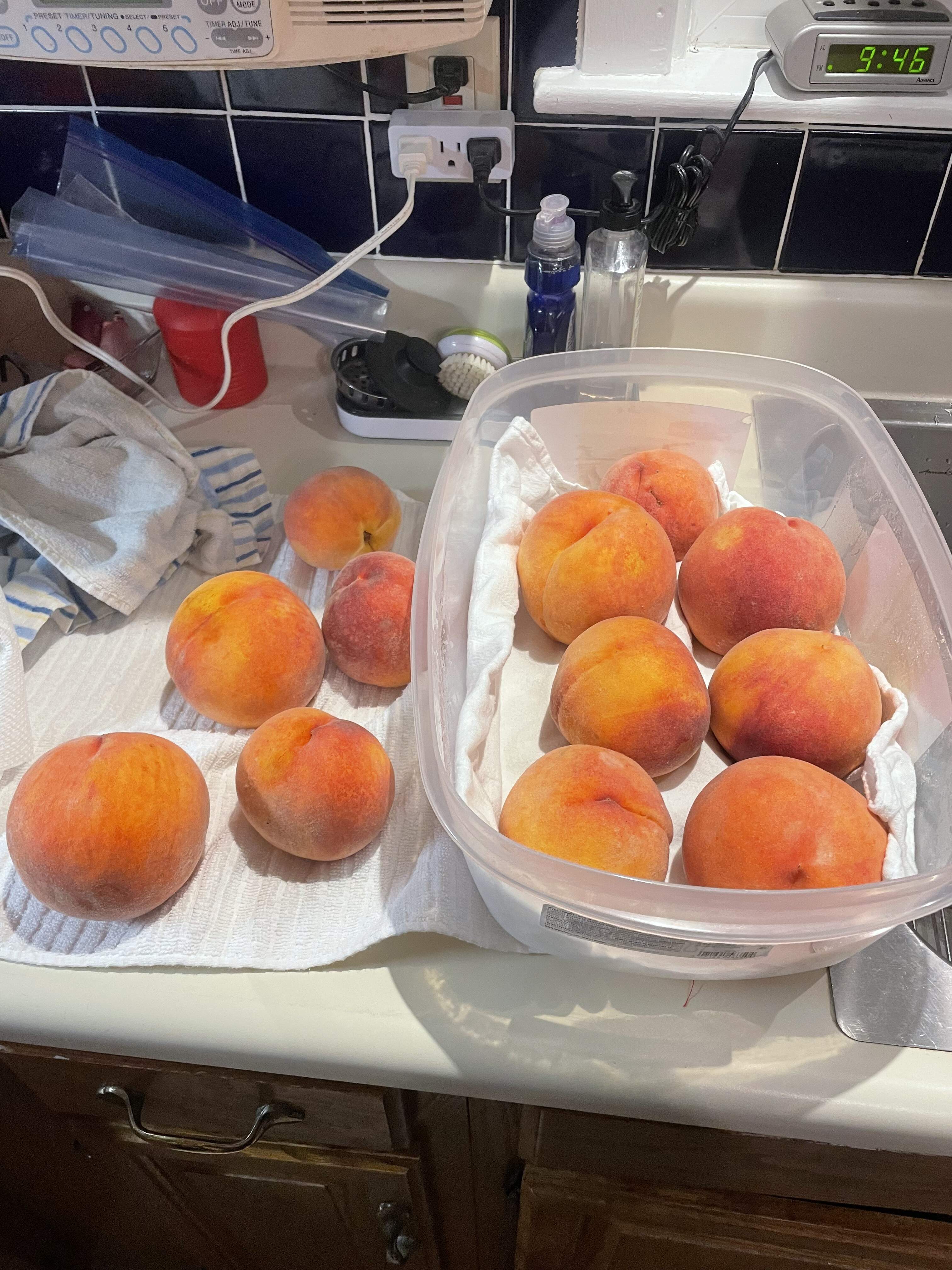 Peach envy! Those are gorgeous. We had too much going on this year to justify the trip east to buy stone fruit, so no peaches for us this year.