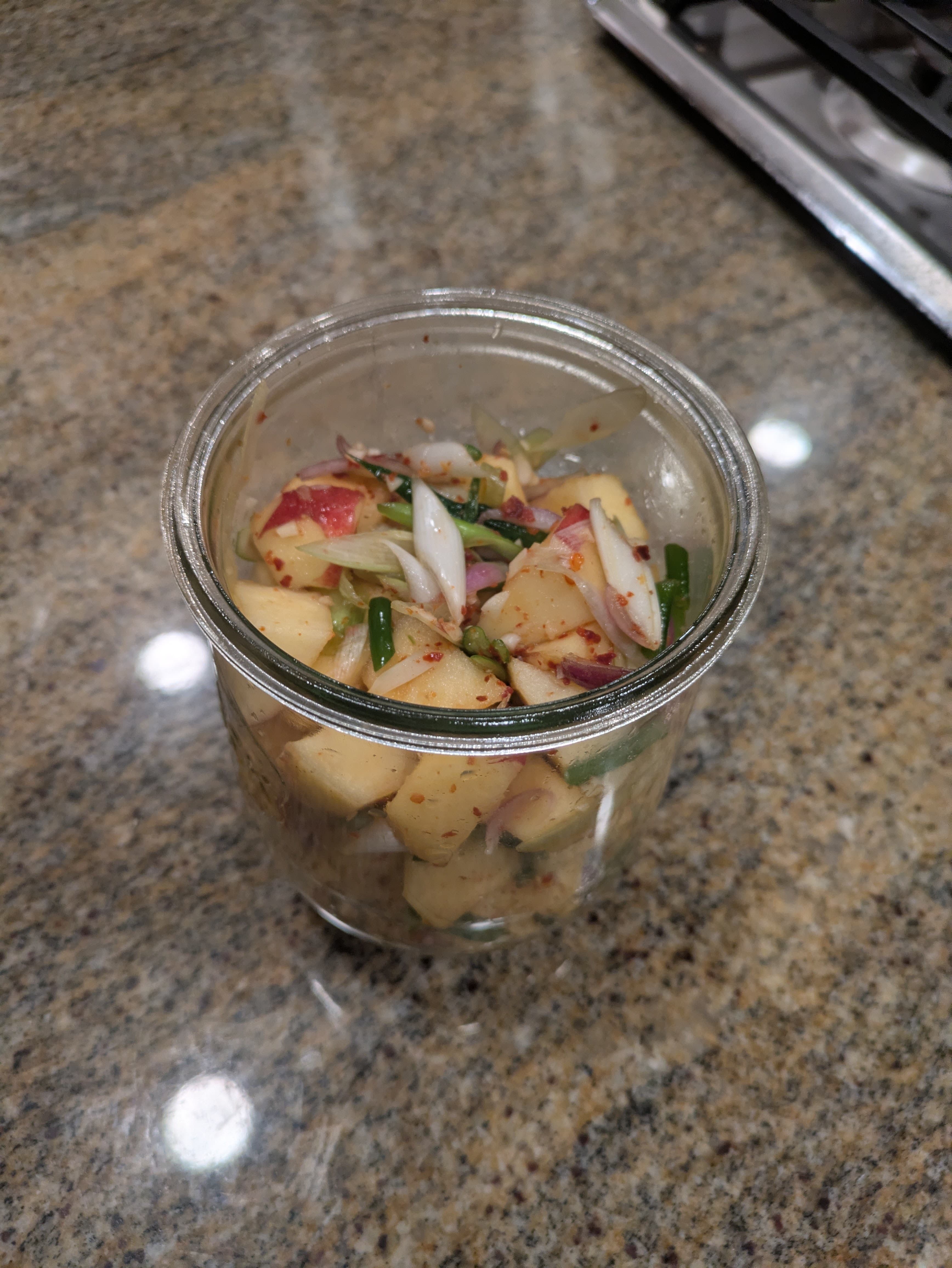 Ta-da! I wasn’t sure about making a whole recipe, but I did. Tasty! Of course, there were some subs, including frozen garlic scapes for some of the garlic, and Turkish red pepper for Korean.