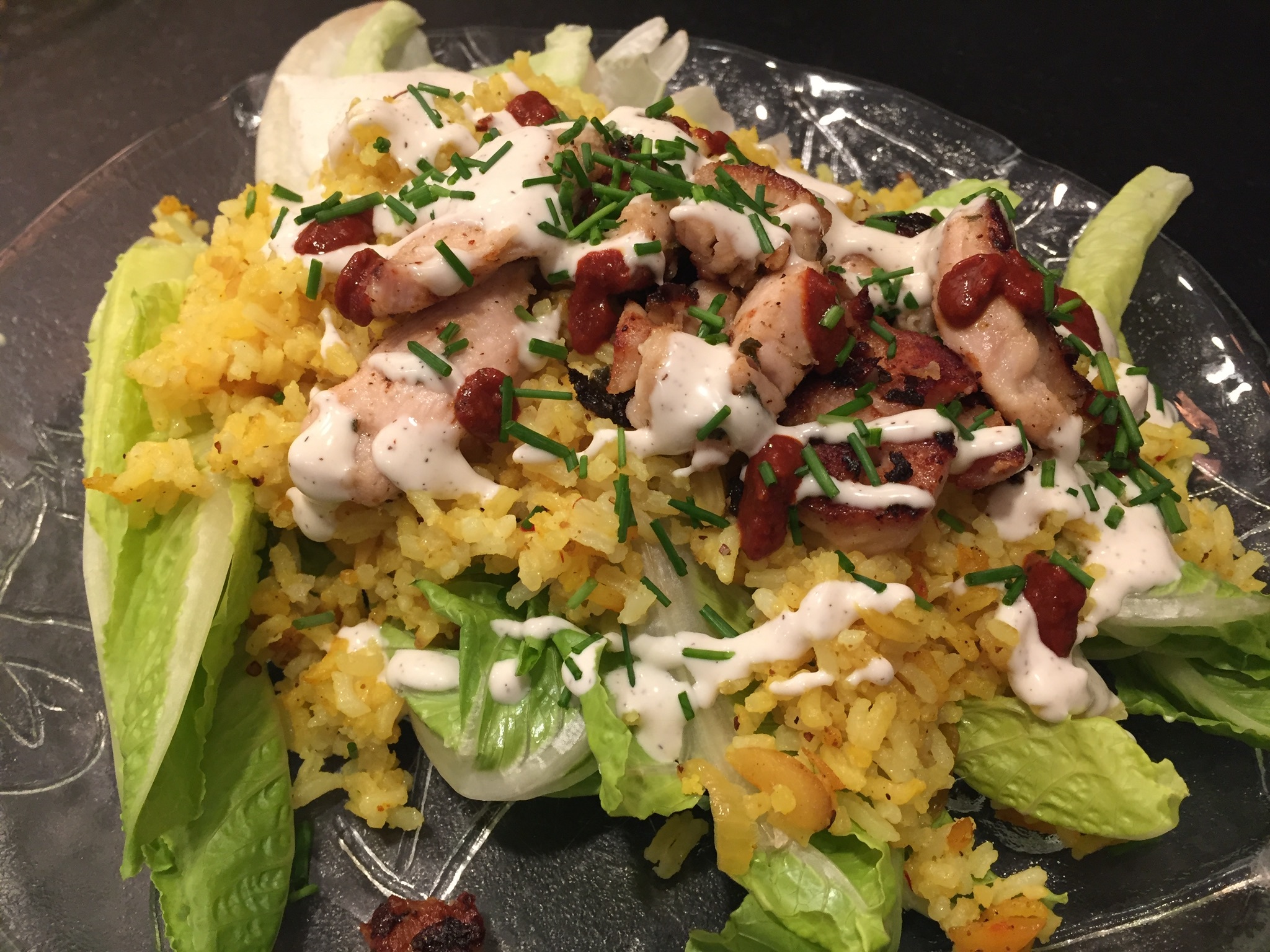 Served on top of romaine hearts. Dressing was the white sauce. I add the hot sauce to mine. The hot sauce said warning , very hot! Wow, it was super hot!!