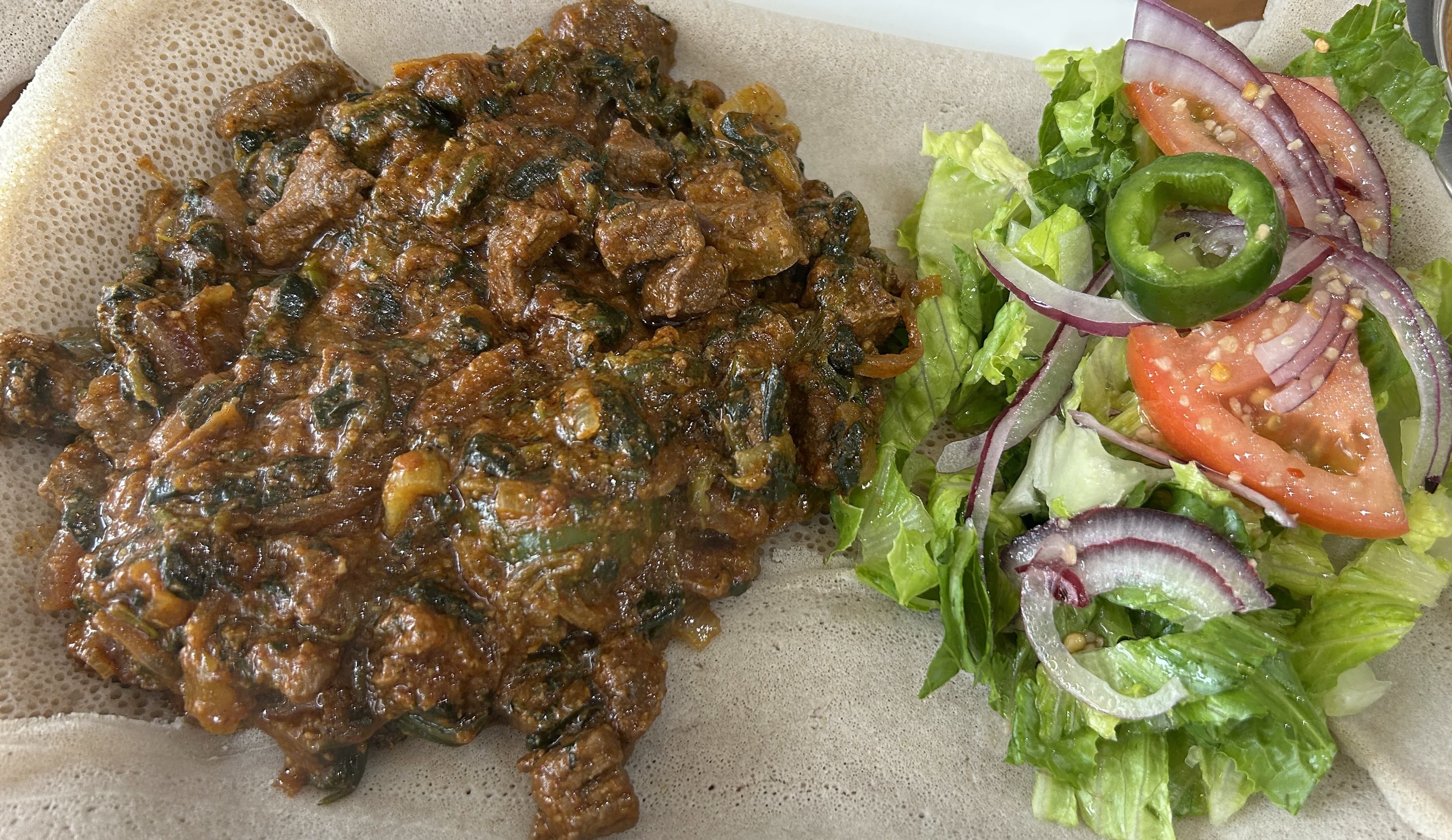 Qlwa lamb, this is served piping hot on injera. The sauce is plain and if you want it hot they have their own awaze paste you can add to the dish. Served with copious chunks of jalapeno on the side as well as red onion, lettuce, and tomato.