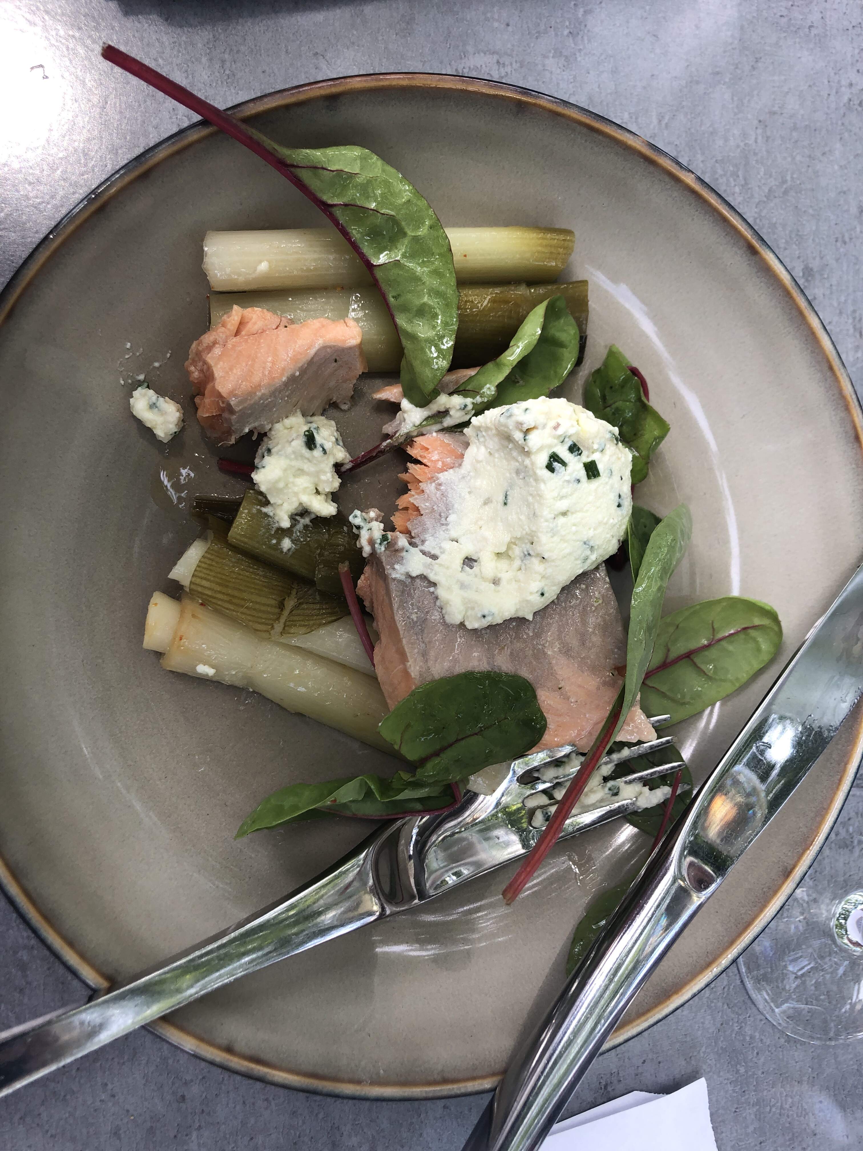 I see I’m late to the party, but we had a lovely lunch at L’Agape, a bib gourmand restaurant on the Place des Corps Saints. In nice weather the tables are zest on the Place itself. I believe there’s a 5-course meal at dinner. I posted a review on my blog. We had leeks with trout and sheep cheese to start and fish dishes for mains – skate wing and potatoes with black sesame seeds and sesame oil and perch lemongrass sauce, and the dish came with some Nicoise olives and a tube of zucchini stuffed with ratatouille. It was a fine meal.