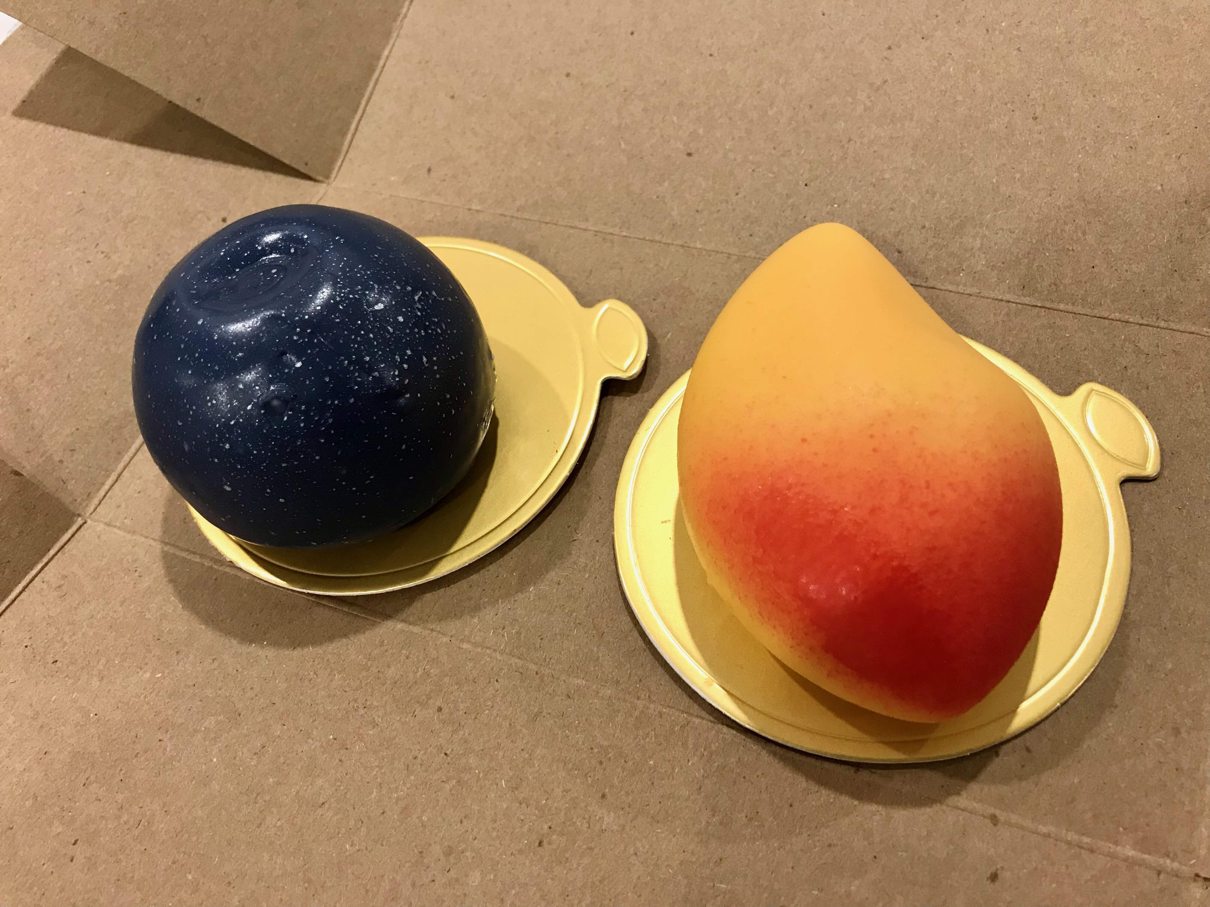 Mango mousse cake was particularly impressive. It featured a tangy passionfruit-mango gel filling over a vanilla almond cake base, topped off with mango mousse in a beautiful thin white chocolate coating. It reminded us a bit of Danish flødeboller in concept. In a similar vein was the lovely blueberry mousse cake, which included blackcurrant gel with whole blueberries and a coconut ganache.