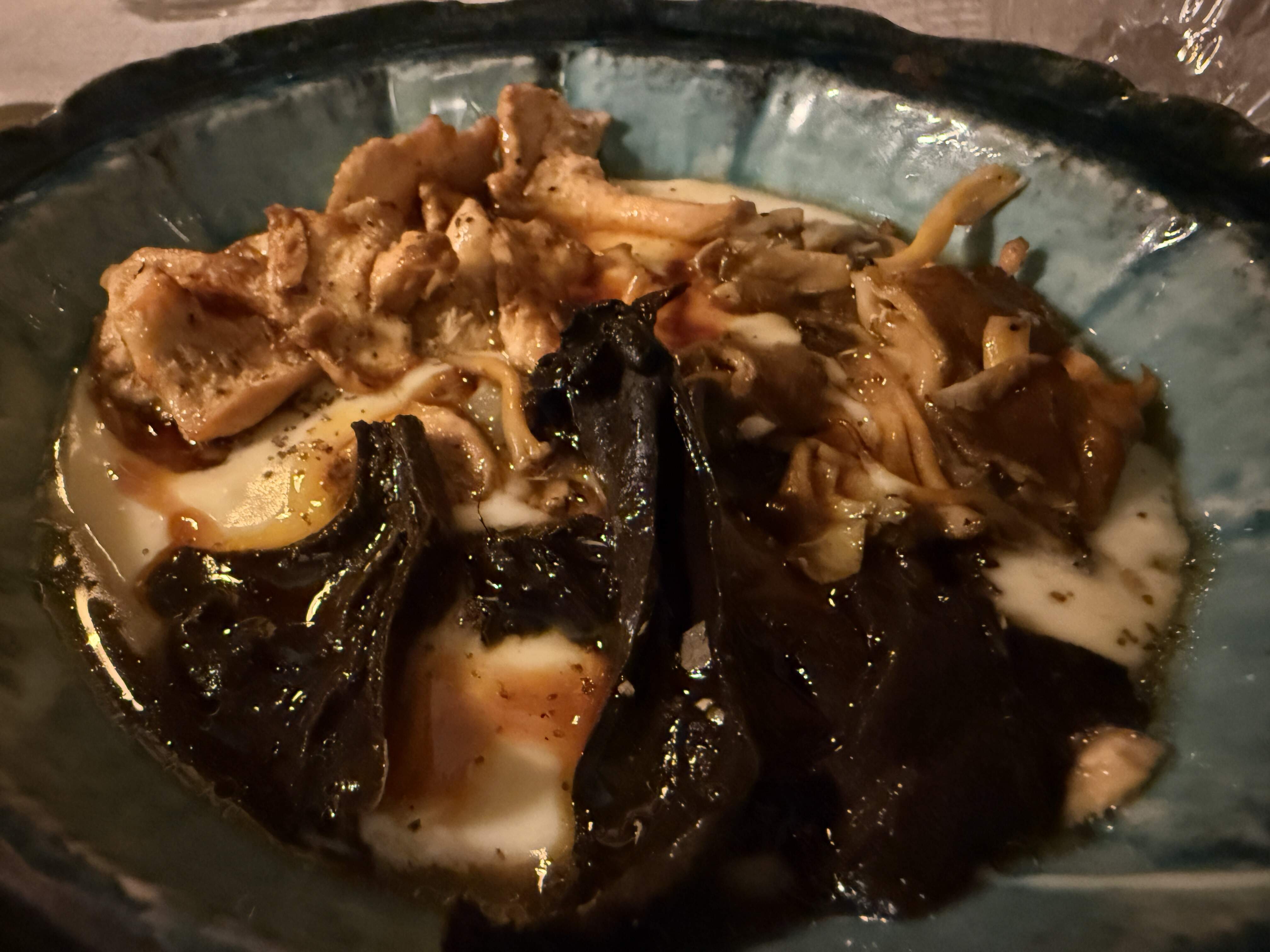 starters of broken eggs with Huelva Iberian ham & a medley of 3 wild mushrooms over a Robuchon potato purée,
