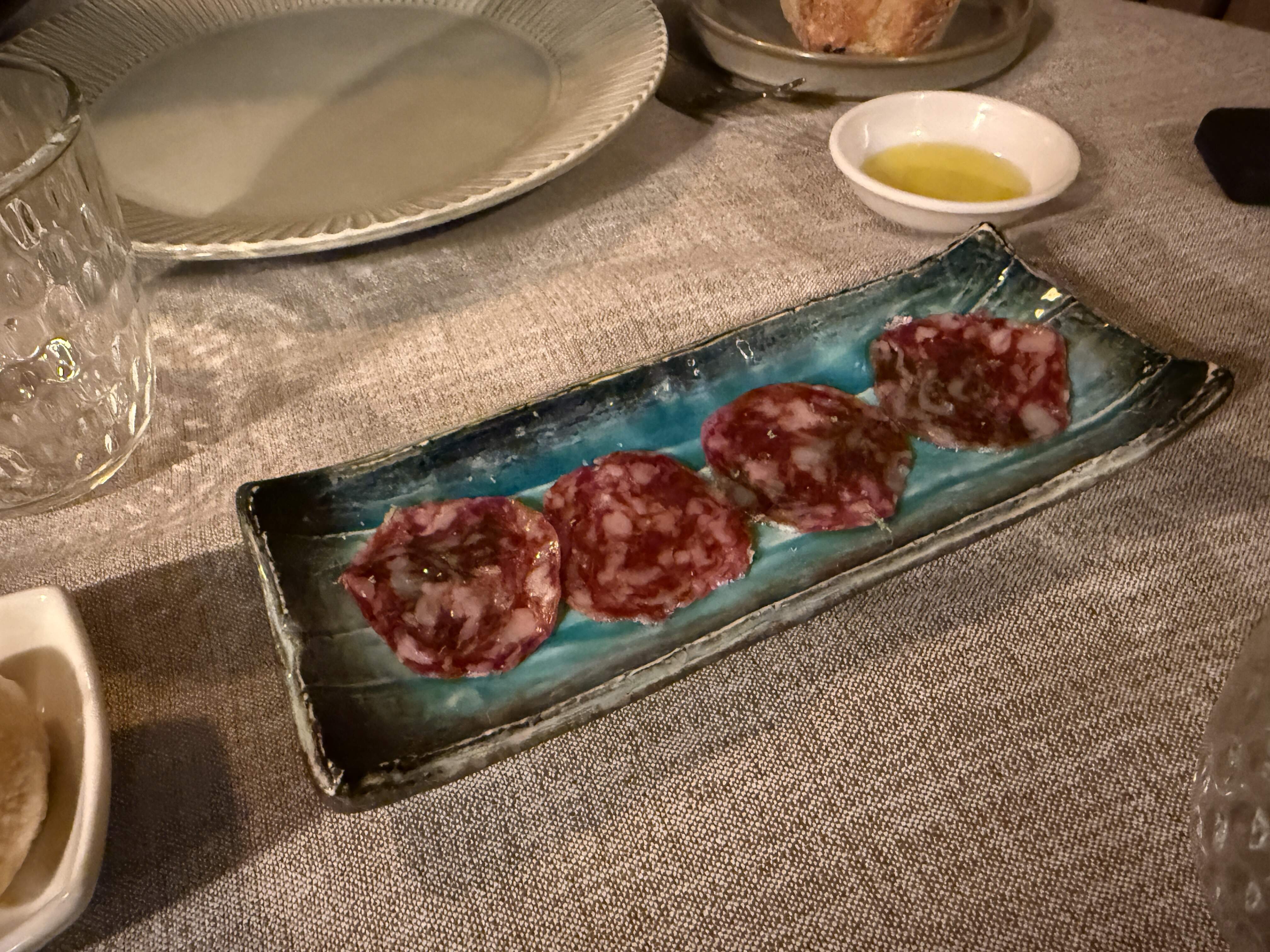 first: 3 separate complimentary welcome dishes (aperitivos) cheese filled balls topped with anchovy slices, garlic soup with a grape and smoked sardine, plus a small platter of salchichón, then