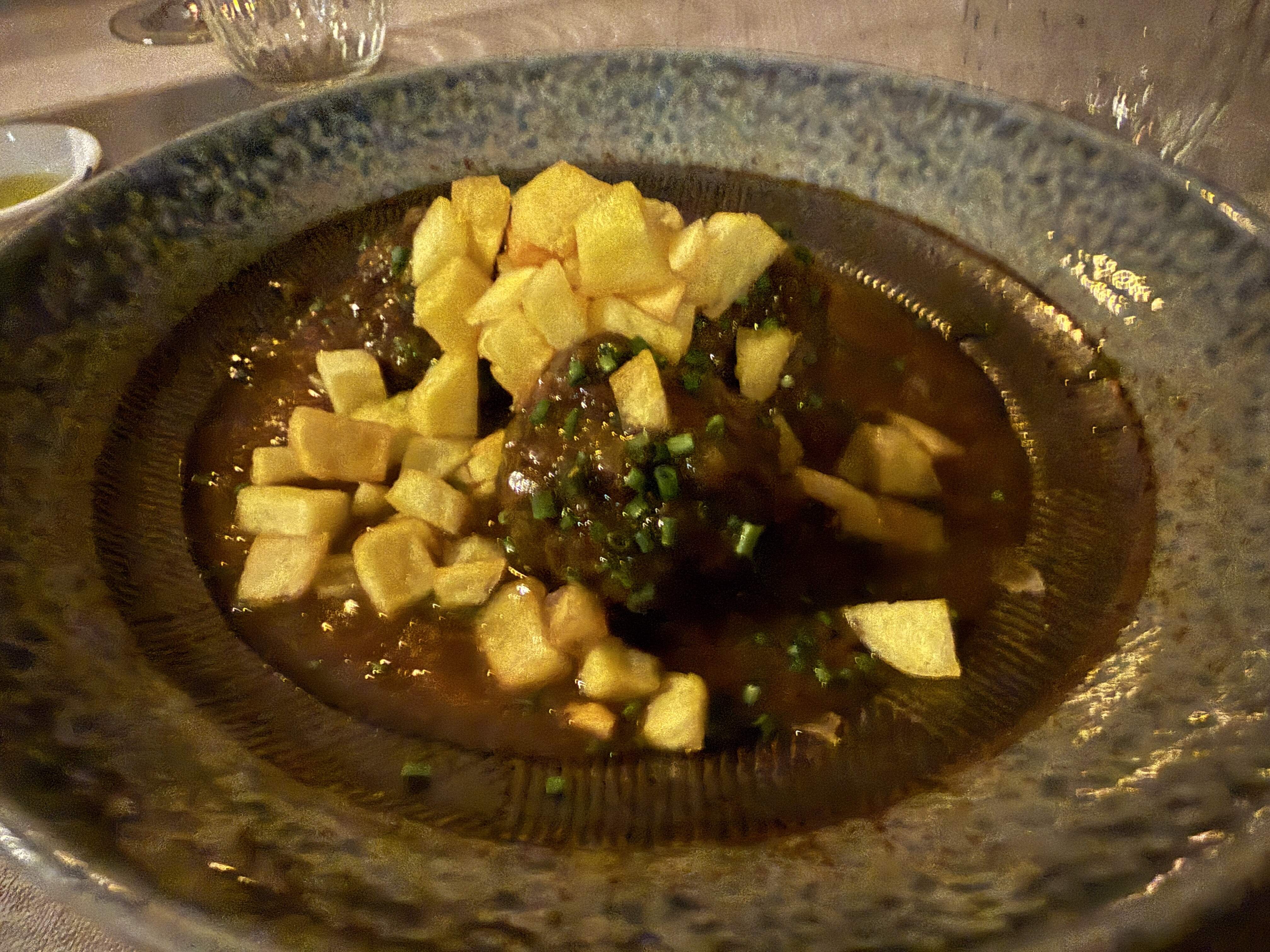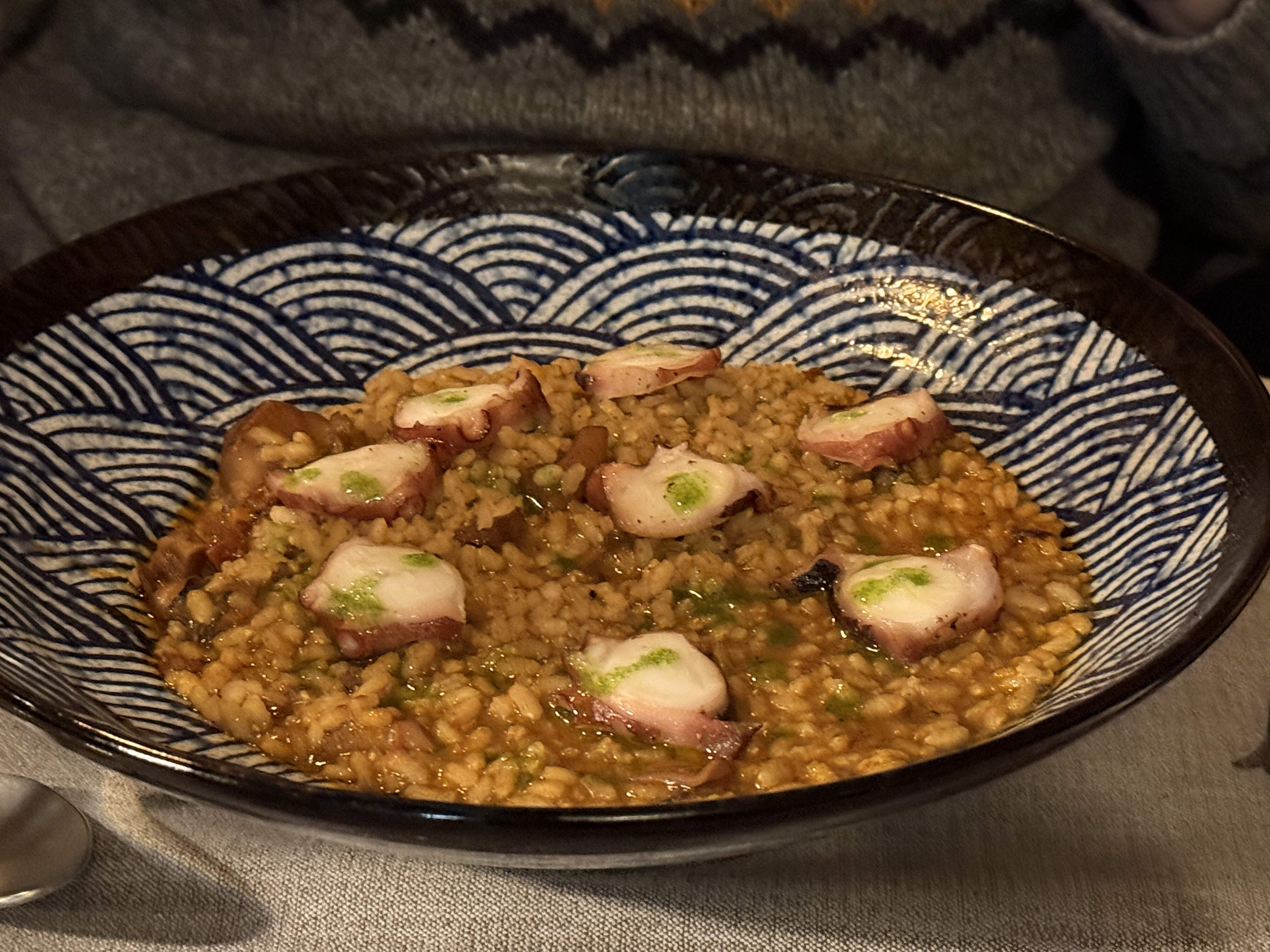 the mains: venison meatballs and creamy octopus and cuttlefish rice (Diamante from Molino Roca), along with excellent, crusty Vienna la Baguette warm bread and Patio de Viana (Jaén) picual EVOO plus the coffee service comes with ample petit fours. Unfortunately we couldn’t find room for the chef’s signature dessert, his pedacito de cielo, a torrija de brioche (pain perdu) with Ruavieja liquer ice cream.