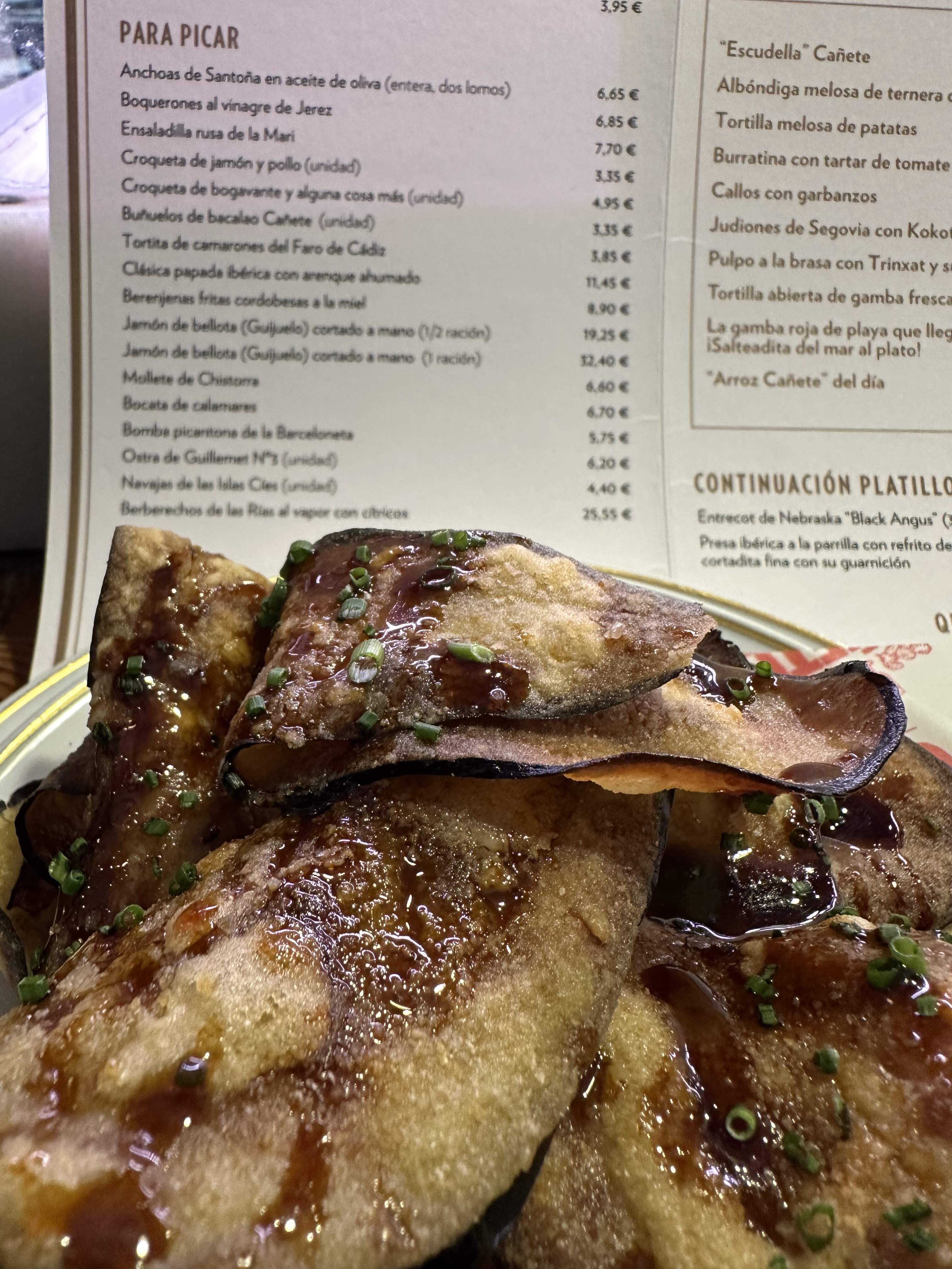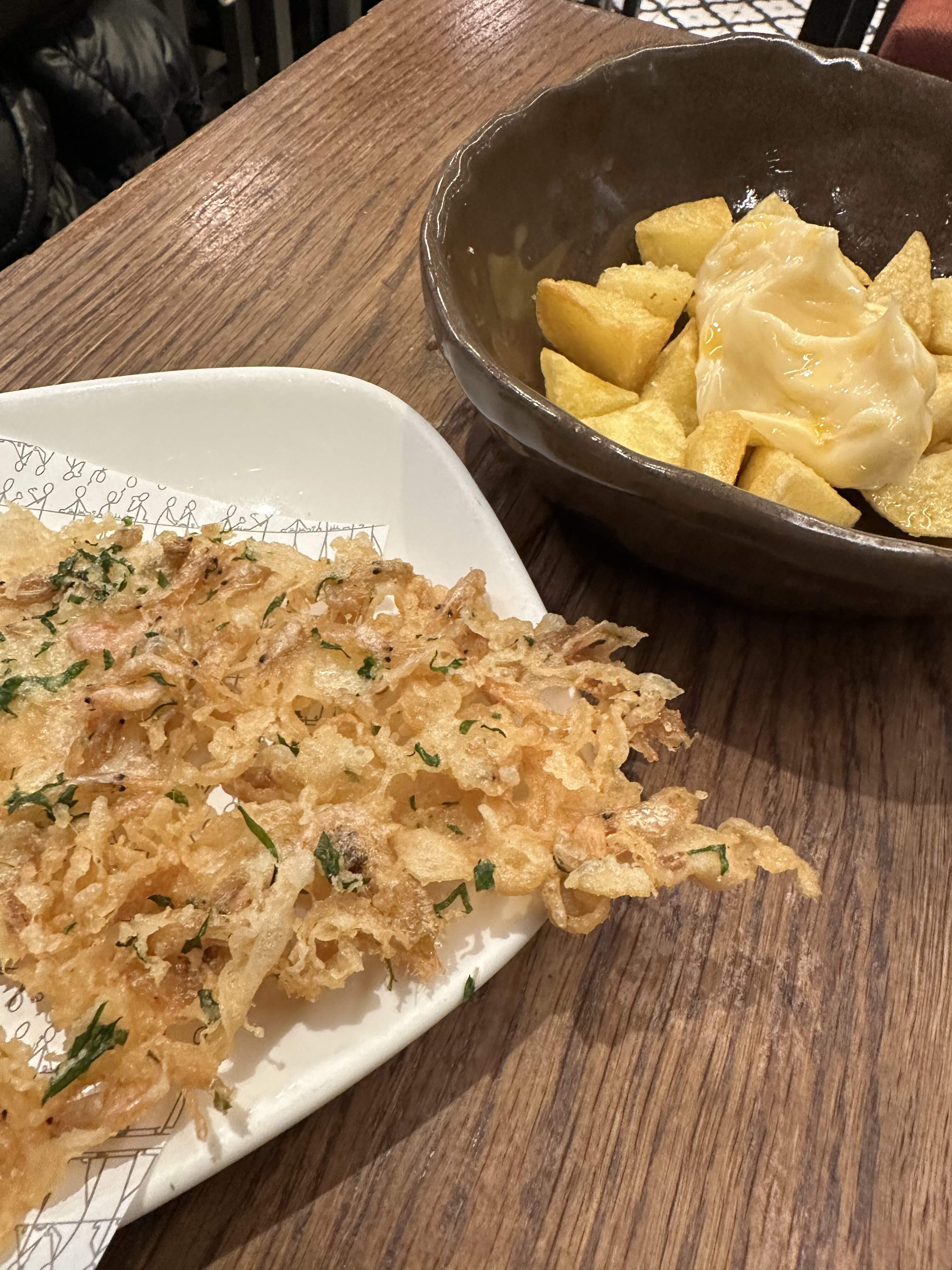 Impeccable take on the Cadiz classic, TORTILLITA DE CAMARONES. This was one of a number of Andaluz staples on the carta and they were exceptional; try to spot the minuscule shrimp in the photos…addictive; 4.10 euro for two large fritters. In background, forgettable patatas braves (half-order) with ailioli; skip these here…