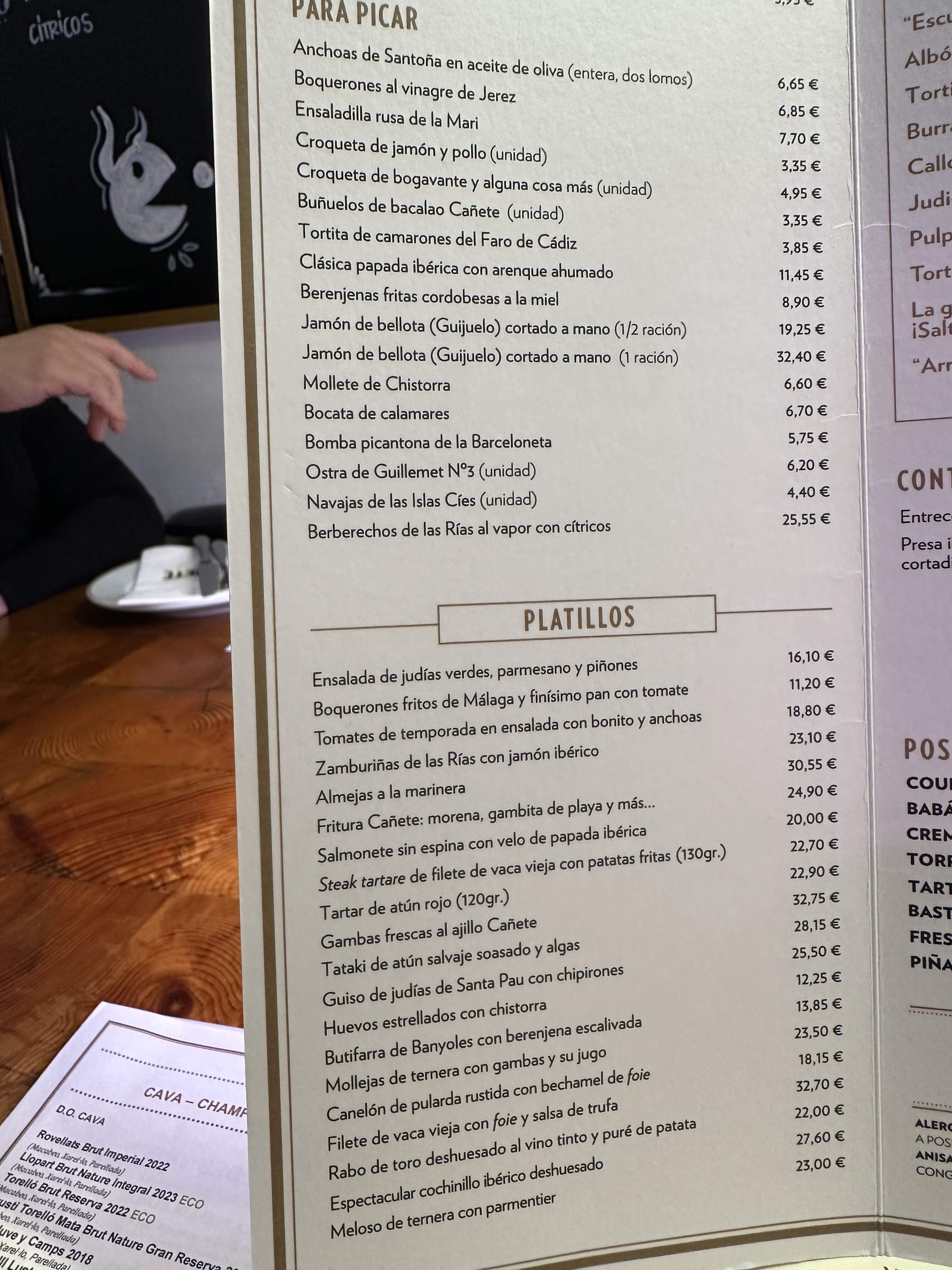 I had my heart set on seafood, but there was no shrimp at all…most deinifelty none of the vaunted $$$$ prawns from Palamos on the Costa Brava, that I so wanted to try and which seafood lovers should seek out in Catalonia. (LA TASQUITA DE ENFRENTE, one of my Madrid faves, often features these, as do high-end marisquerias throughout the country,
