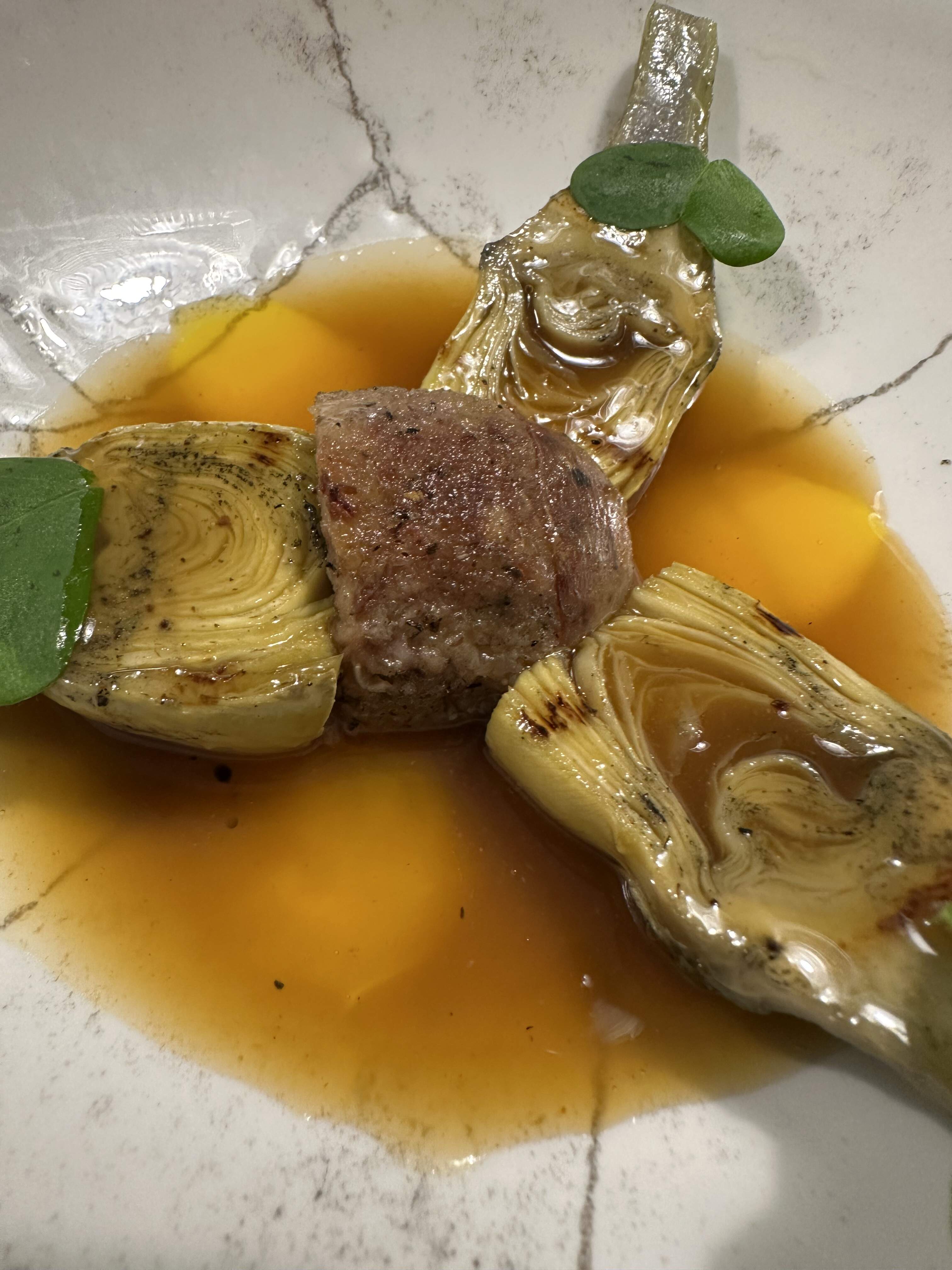 Artichoke with butifarra in a “Thai chicken broth,” rich with egg yolk. Terrific dish.