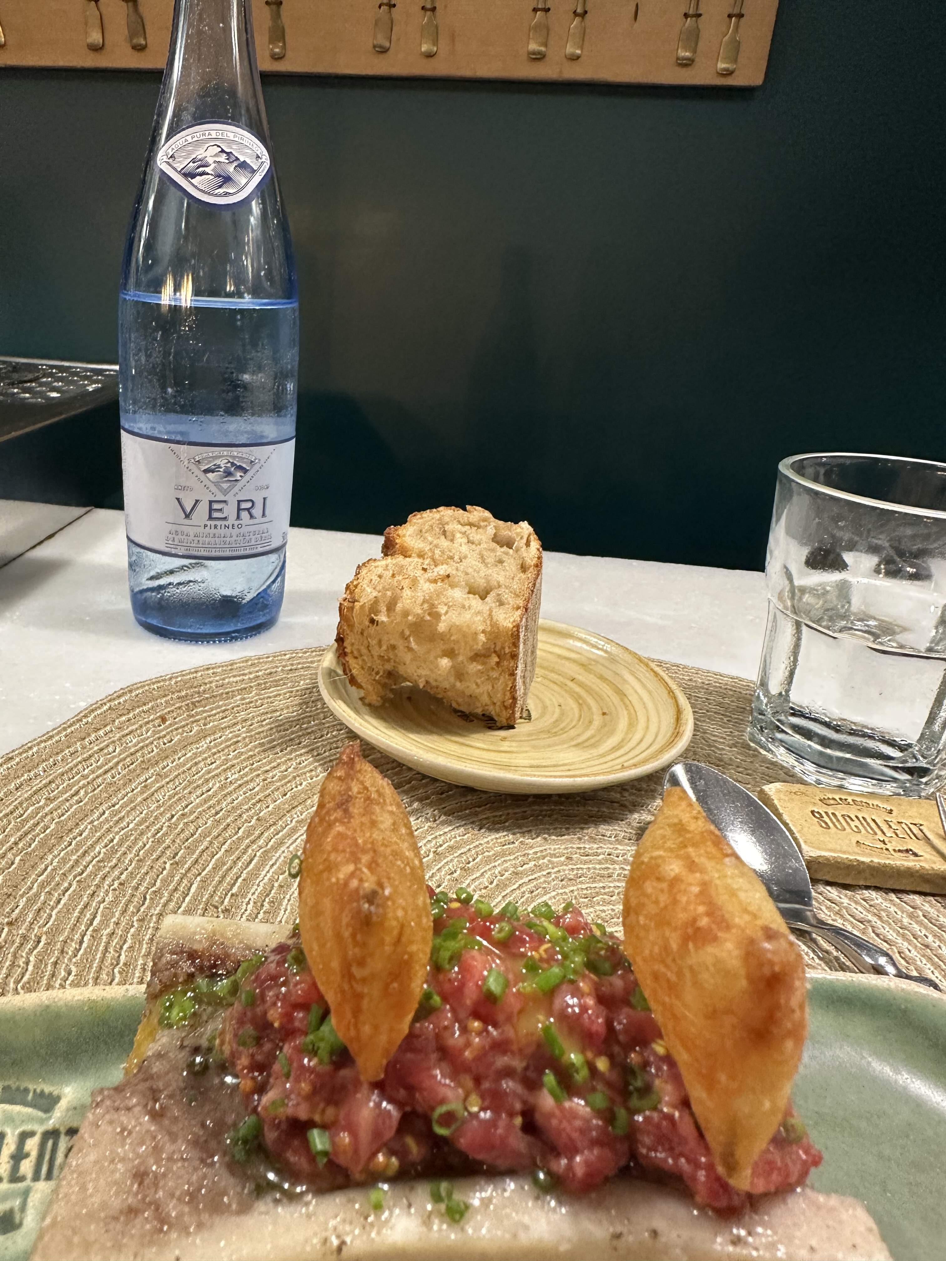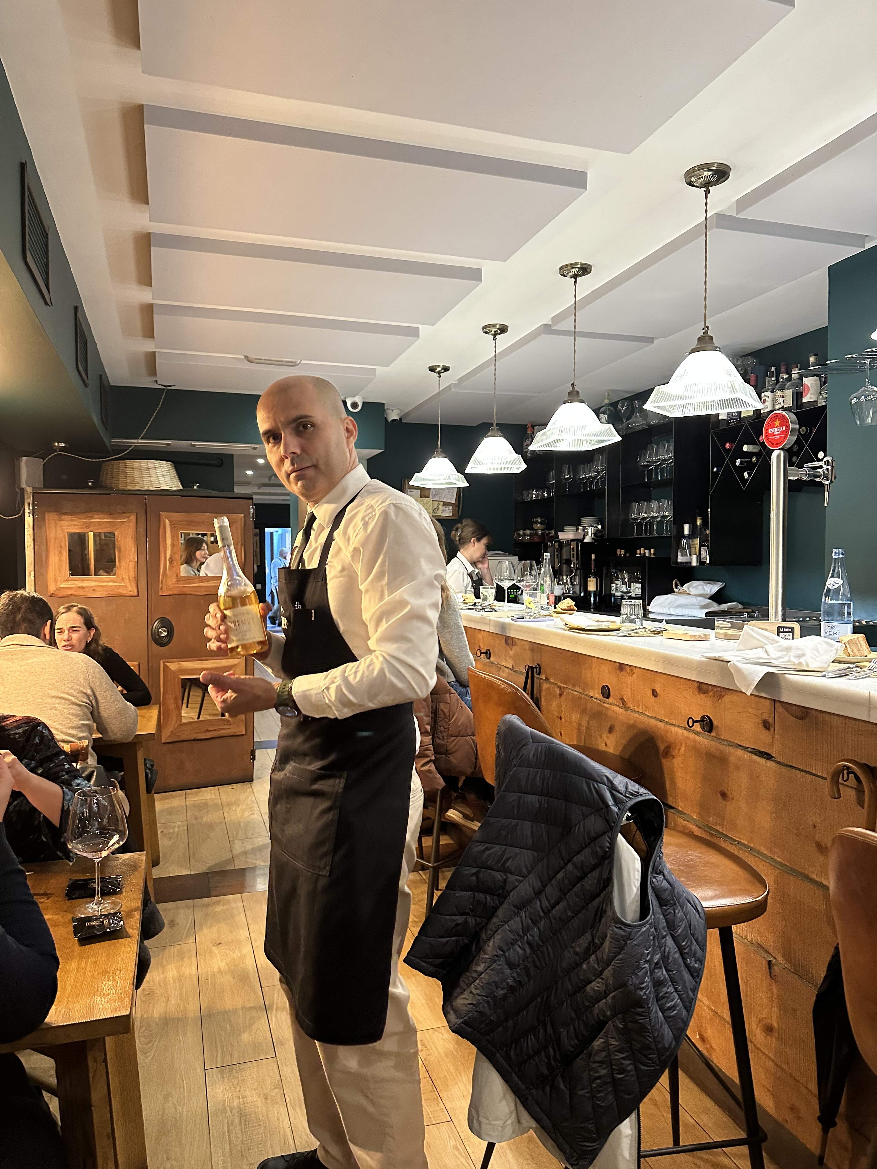 I had one glass of Albarino and my bill came to a modest 44 euro, including water and bread charge. Very good dinner, if not quite as good as the previous night at MONT BAR. This place is a lot more casual; MONT BAR has more of a spiffy Parisian bistro look. One Repsol sun; Michelin mention.