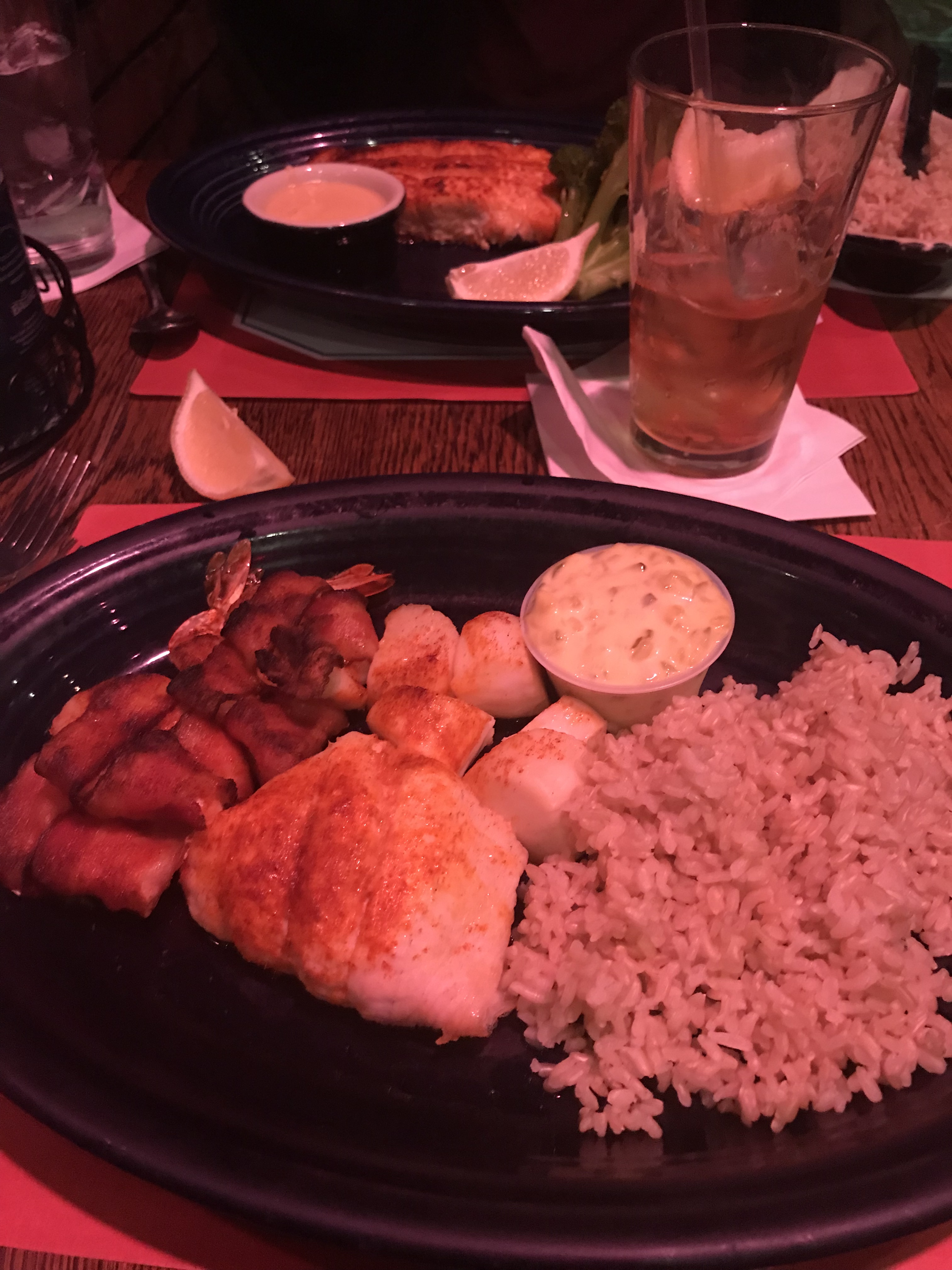 Baked seafood platter (me) and baked salmon for her. My only complaint was the tarter sauce was a bit too pickley for me. Kudos for offering brown rice as an optional side!