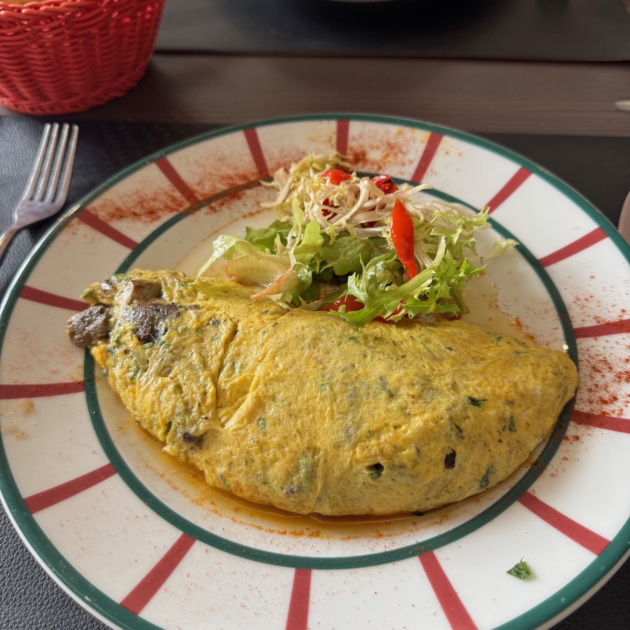 Shrimp in garlic, messy, tough to peel, nice flavor if not a little mushy. Subtle garlic notes. The only dish I wouldn’t order again but good enough. Mushroom omelette, wow, a lesson in super fluffy, buttery omelette. I wasnt expecting so many omeletts here on menus, and I made the mistake of ordering the same dish elsewhere. Not nearly as good.