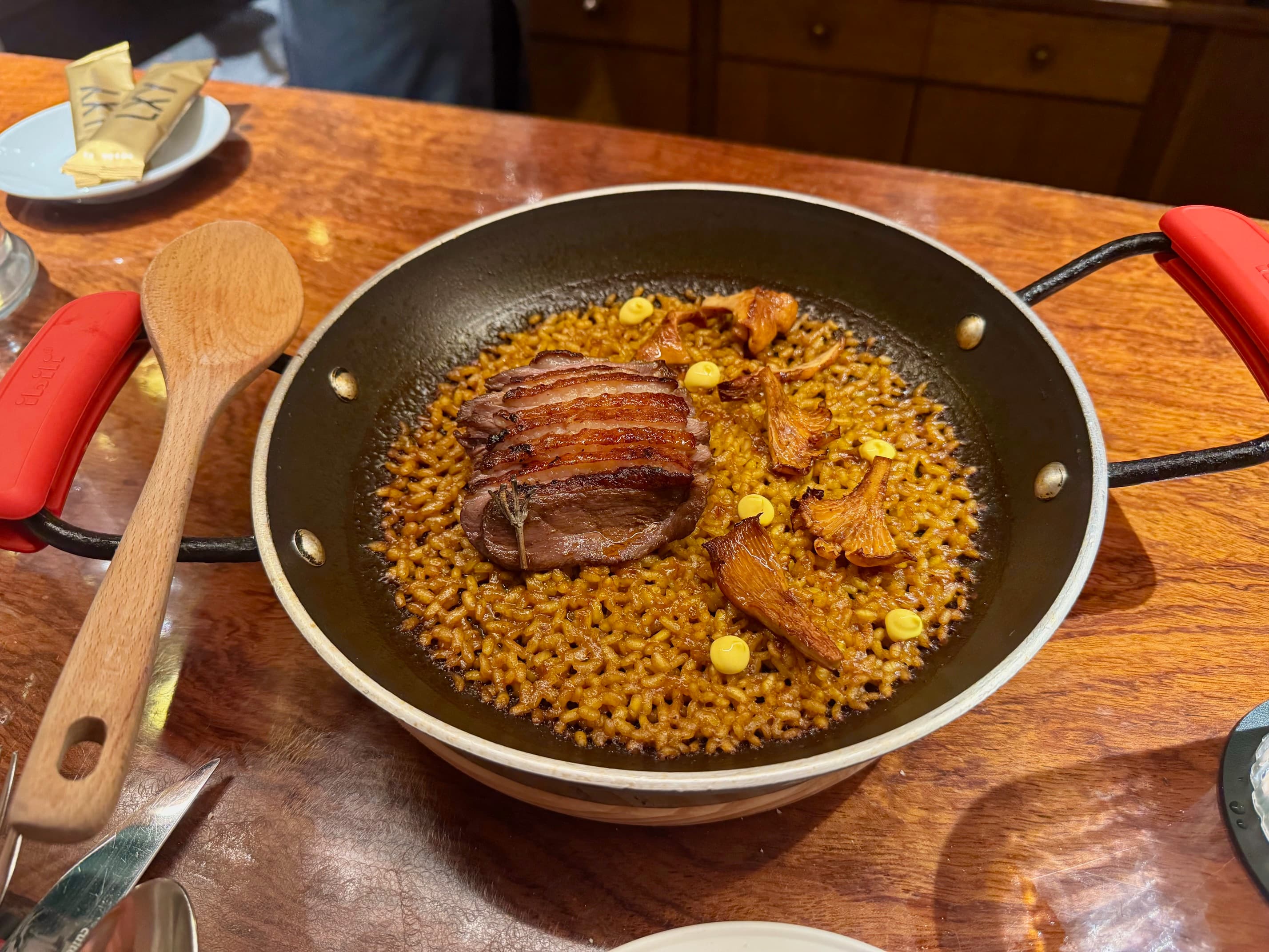 Rice paella with duck breast - With mushrooms and alioli. This is baby angels singing variety. Fantastic texture and flavors throughout, especially if you appreciate a good socarrat