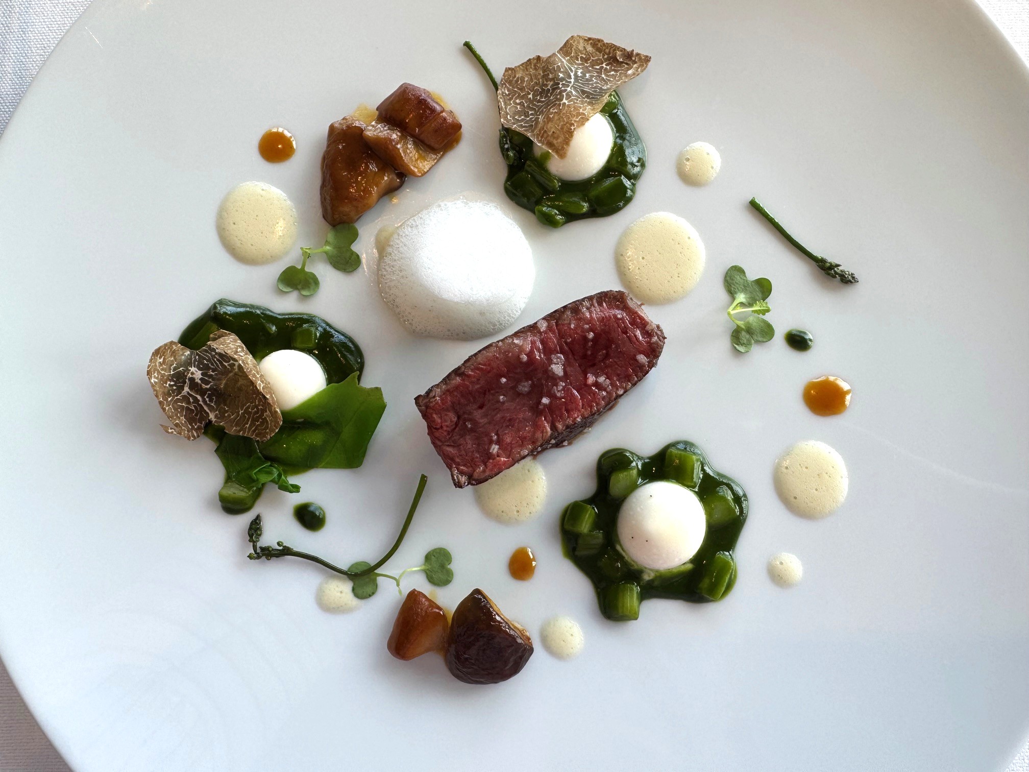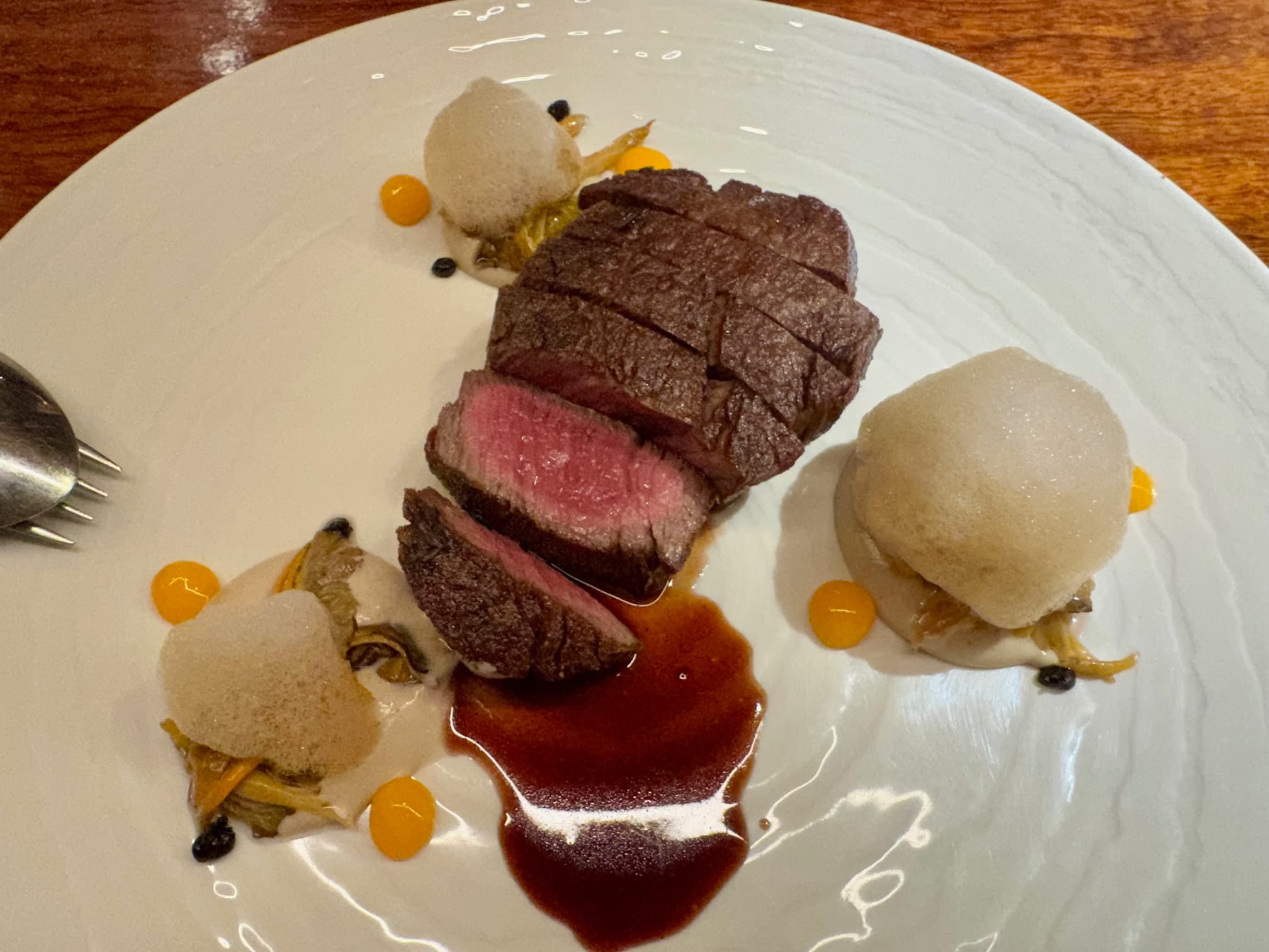 Grilled Sirloin - mushroom puré, egg yolk sauce and coffee foam. Perfection. Some of the best cooked beef of the trip.