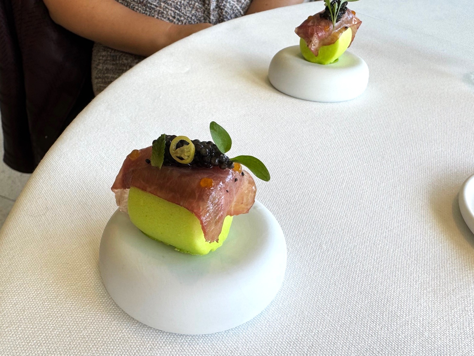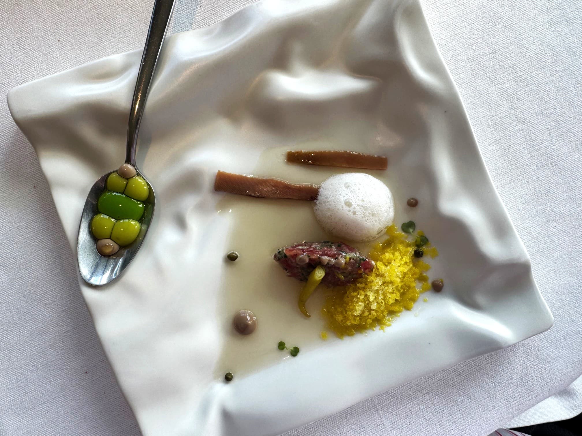 I’m not going to describe each of the 15 or so courses, not counting three different bread courses (fenugreek bread!). Just about each course was a religious experience. The combination of flavors, textures, aromas, temperatures, not to mention the artistic factor was unreal. The surprises like Gilda ingredients in a liquid form on a spoon (see below), the Olive that was anything but, the smoked tuna belly on a celery, mint, and Bergamot “cloud”. Wow and wower.