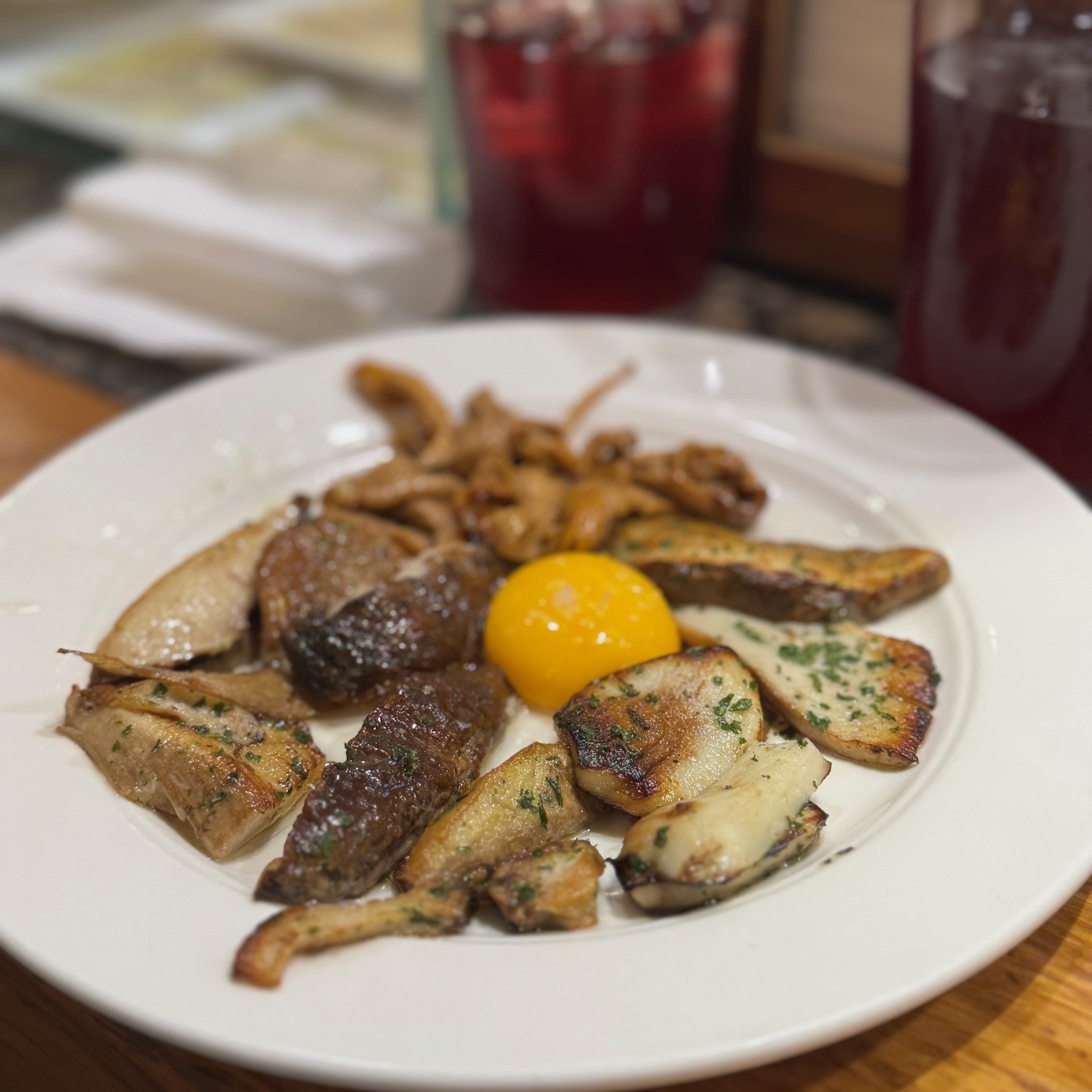 Since there’s a long line the plan shifted from pintxos crawl to ordering enough food for today and much of tomorrow. The famed mushrooms with egg, one of the reasons I was here, worth the hype even though it’s very simple. A mix of Chanterelles and Cepes (Porcini) with egg yolk. Couldn’t get enough of the mushrooms on this trip.